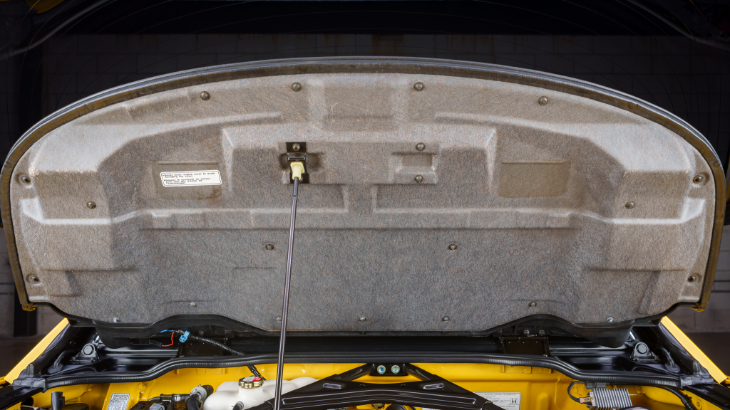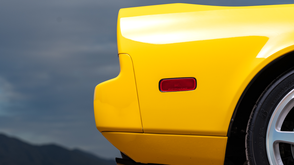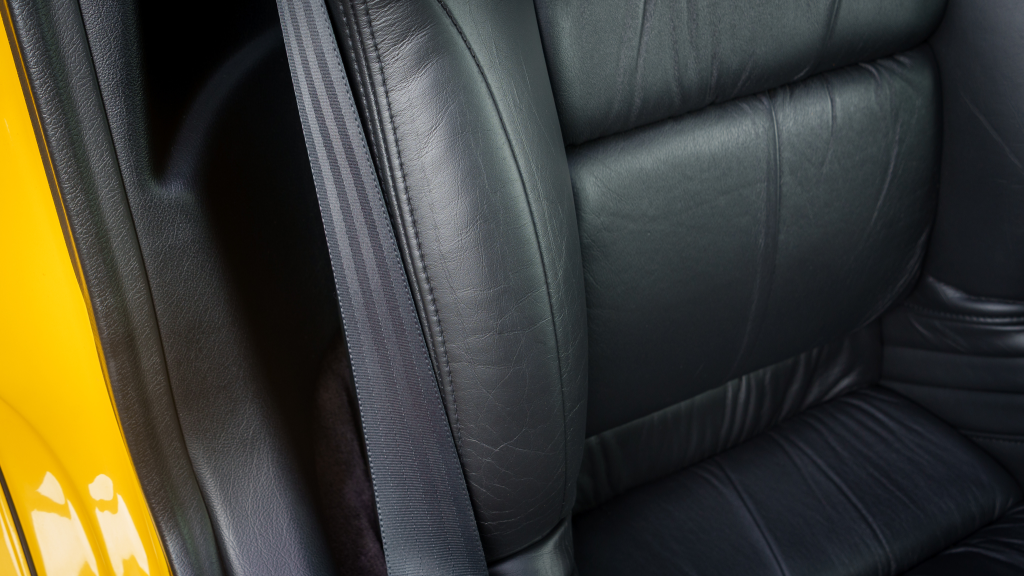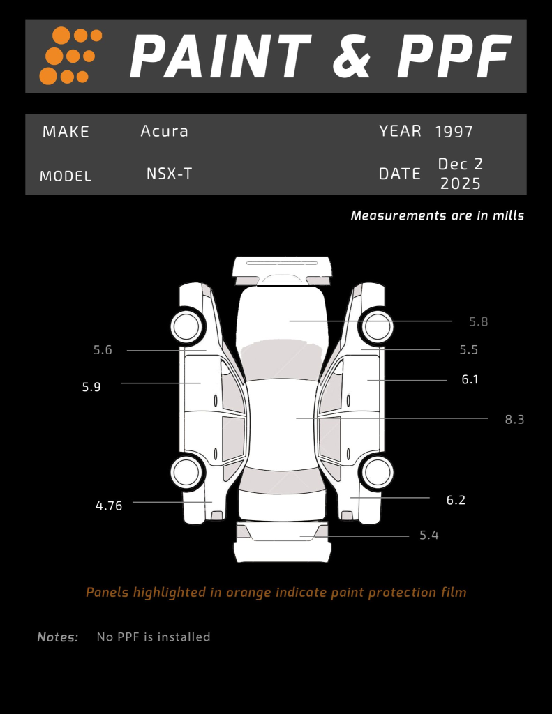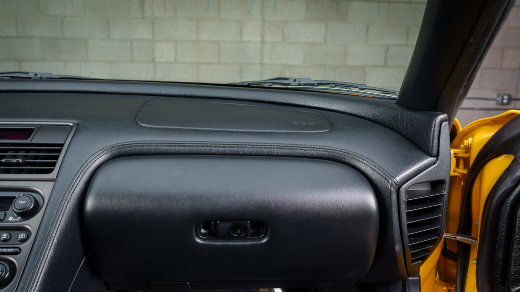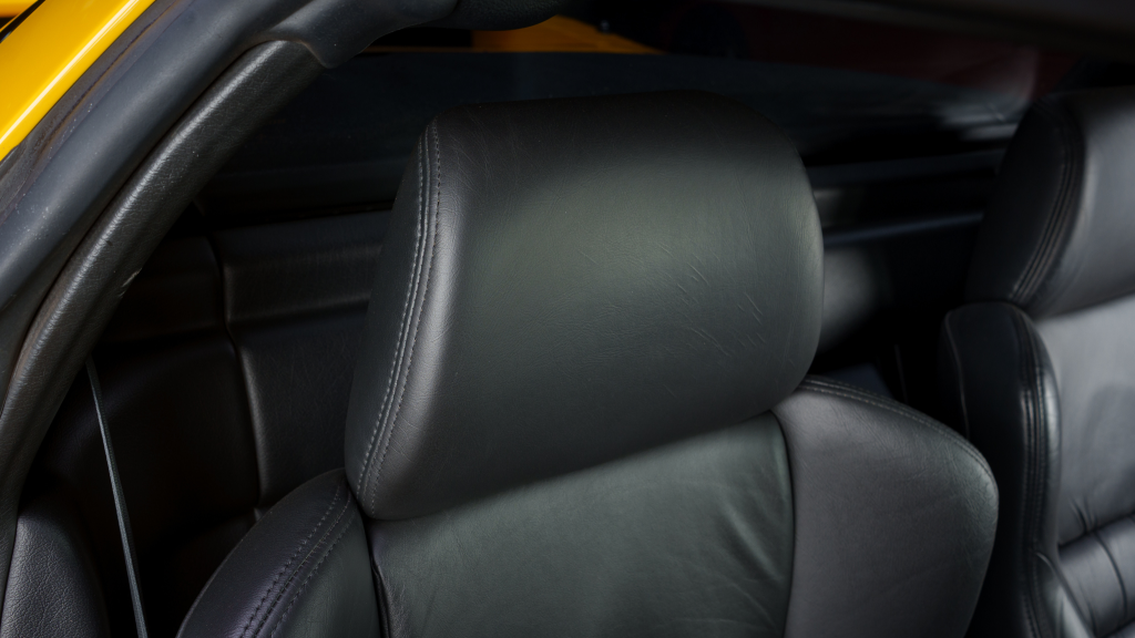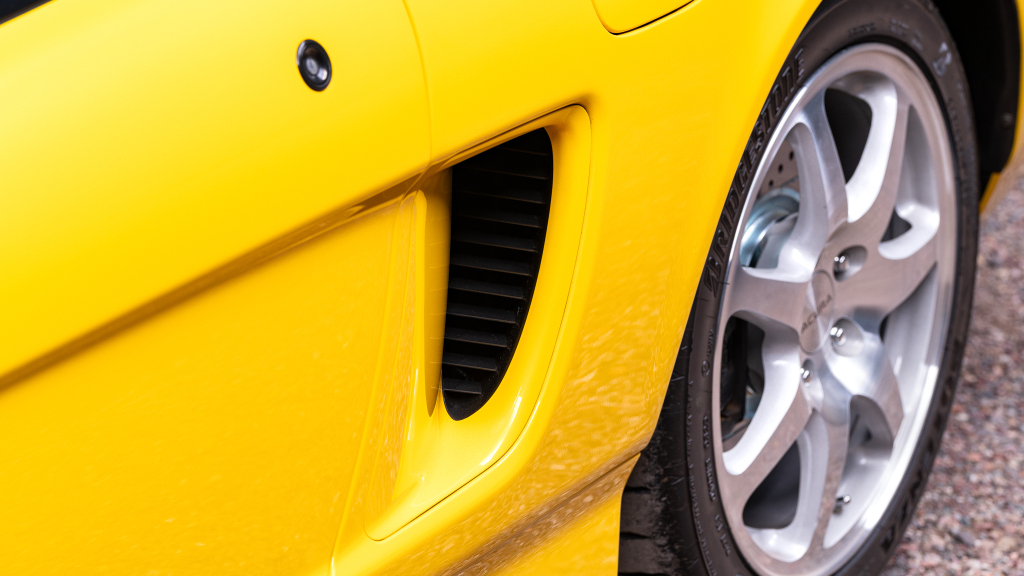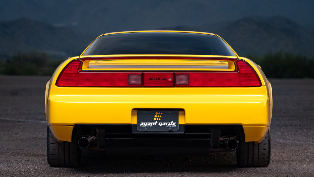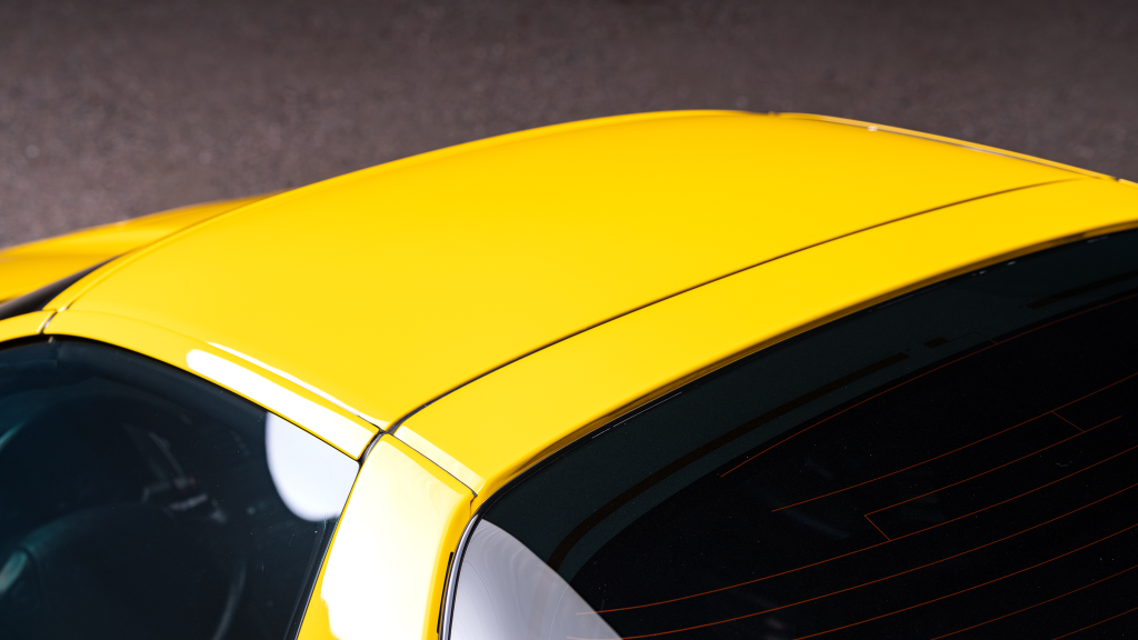 The NSX featured aluminum bodywork, and this example is finished in Spa Yellow Pearl with a body-color removable roof panel. Features include pop-up headlights, an integrated rear wing, side air intakes, power-adjustable side mirrors, and dual exhaust outlets. A ceramic coating has been applied to the body, the trunk struts were replaced in October 2024, and a replacement front spoiler was fitted in July 2025. Paint meter readings are provided in the gallery.