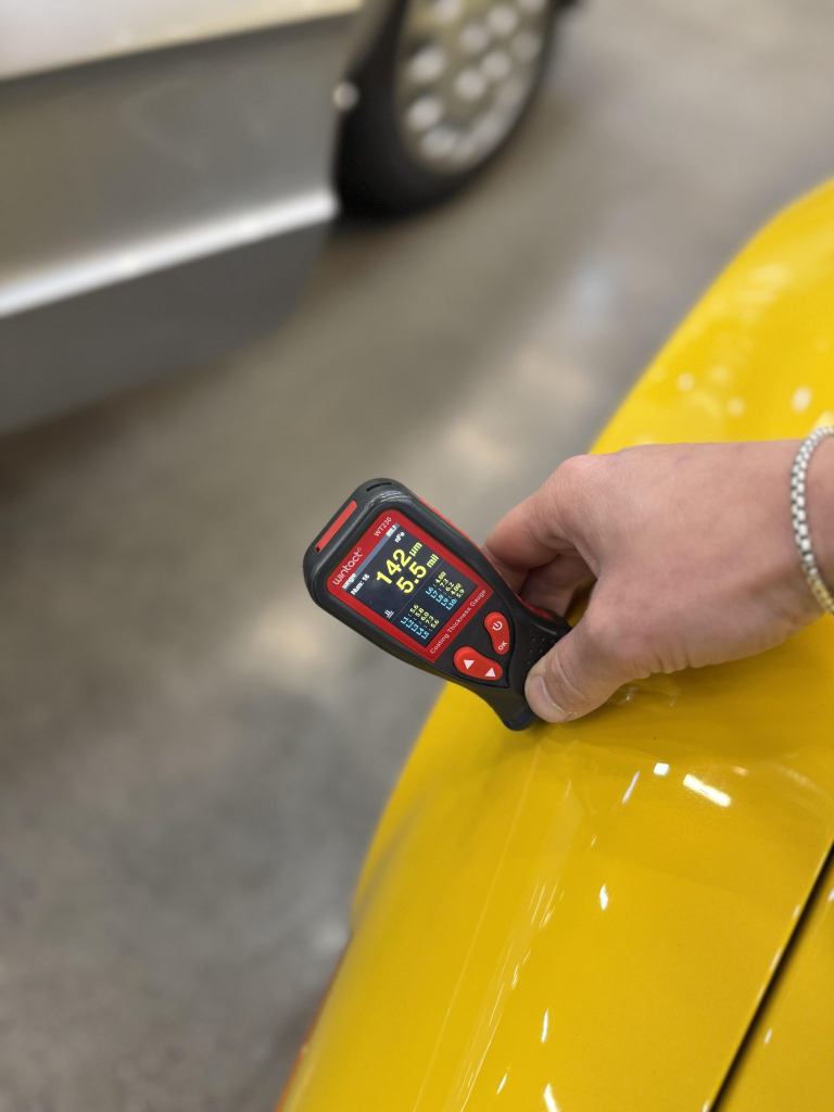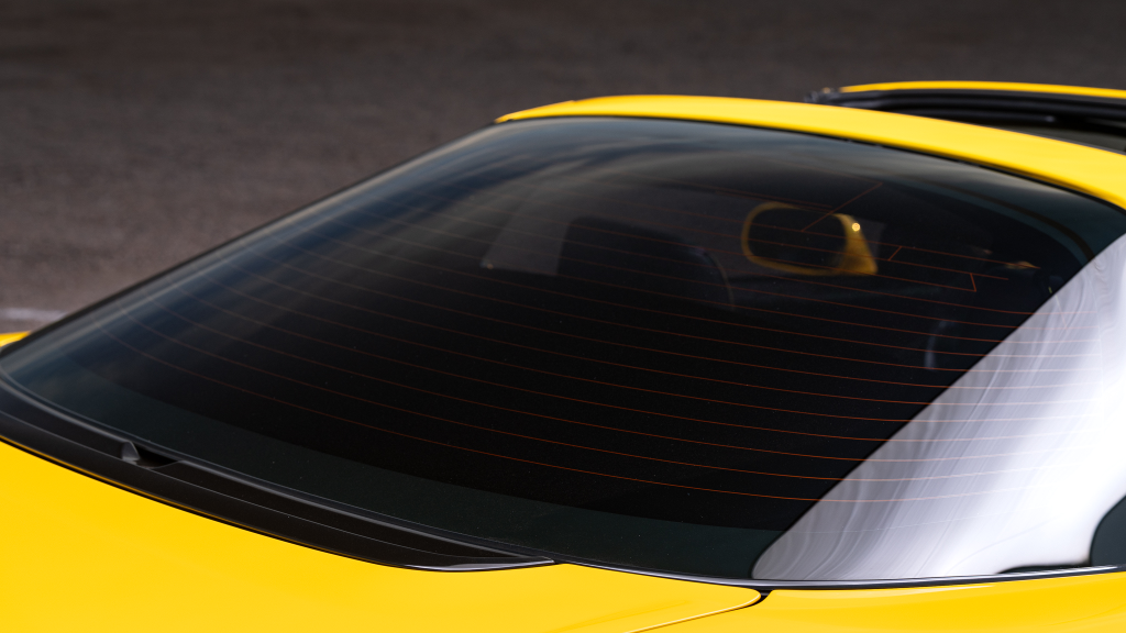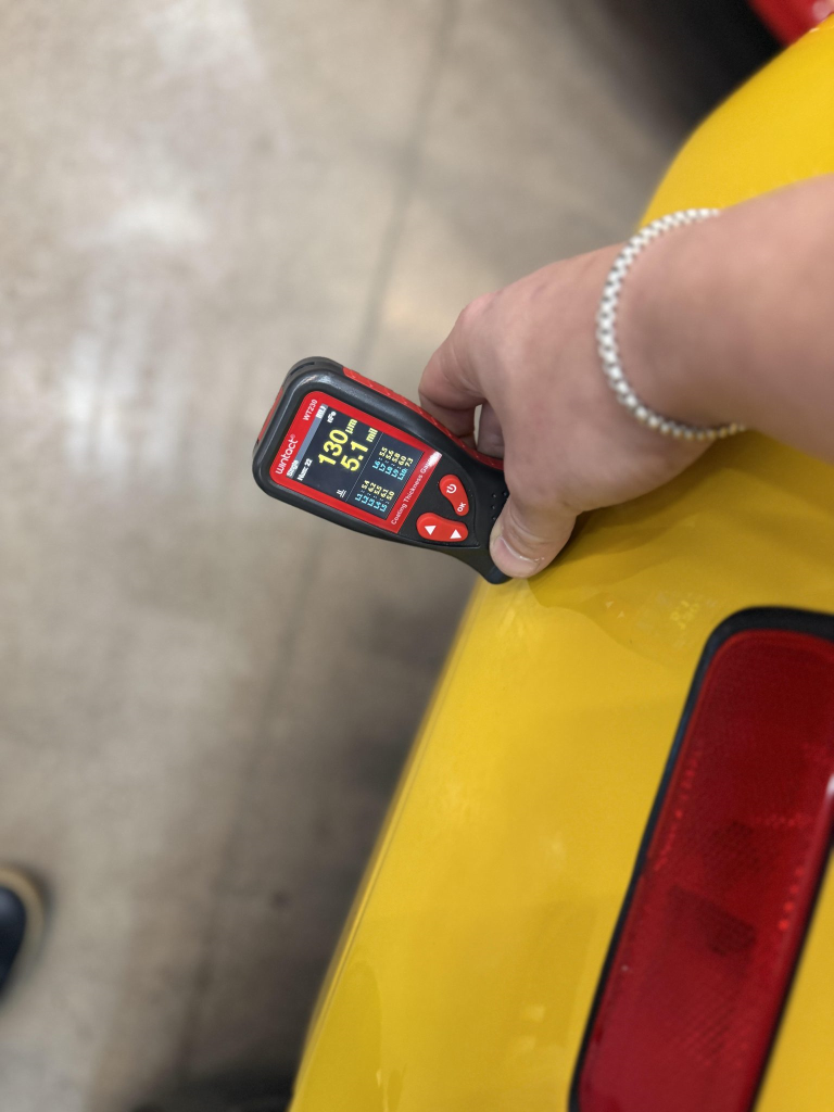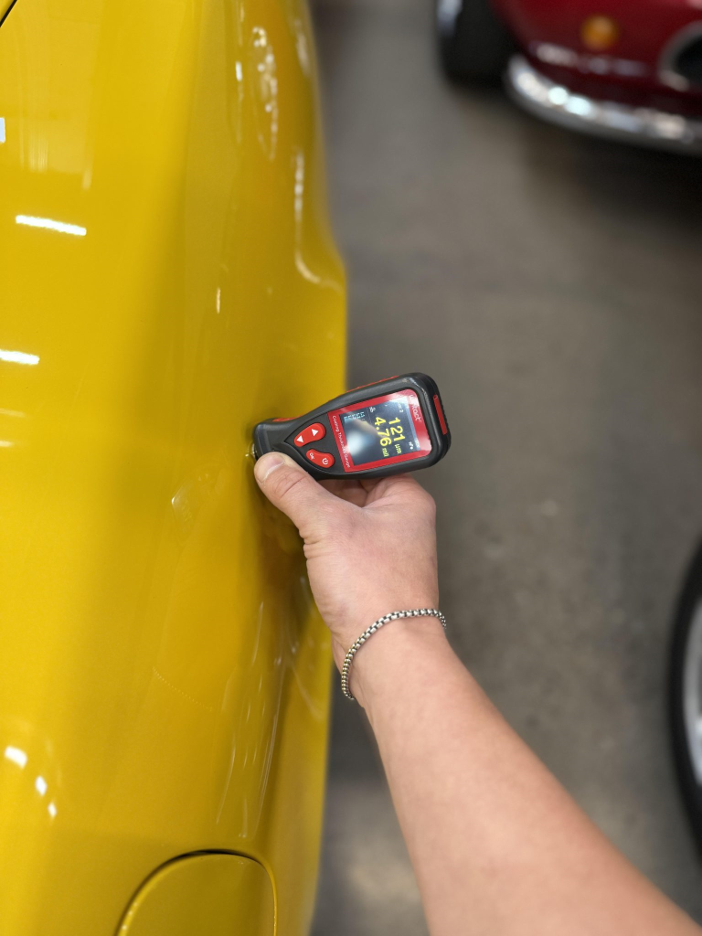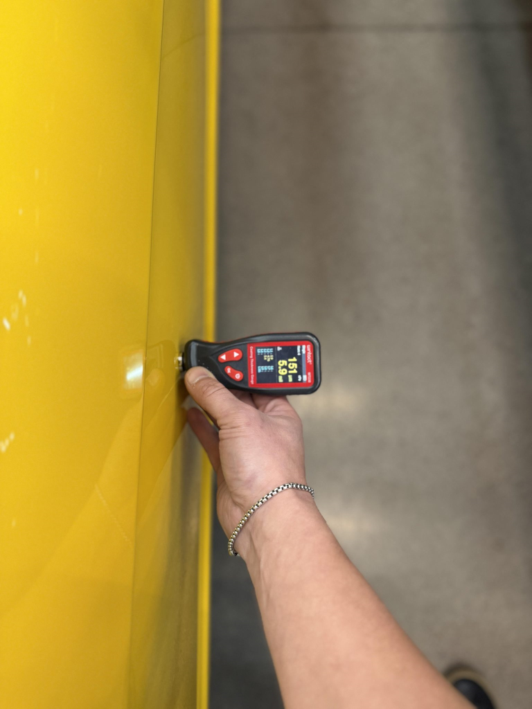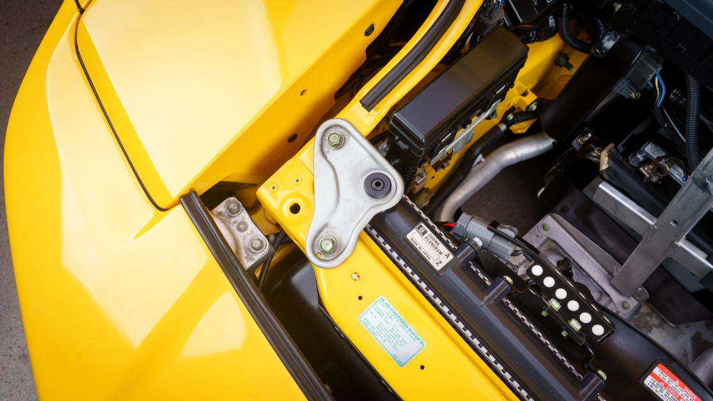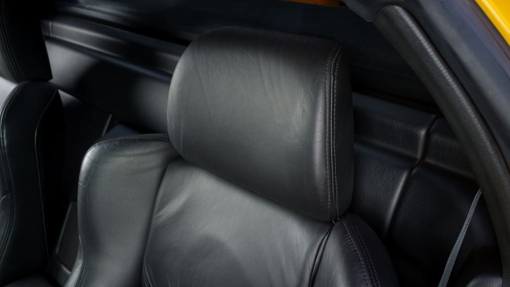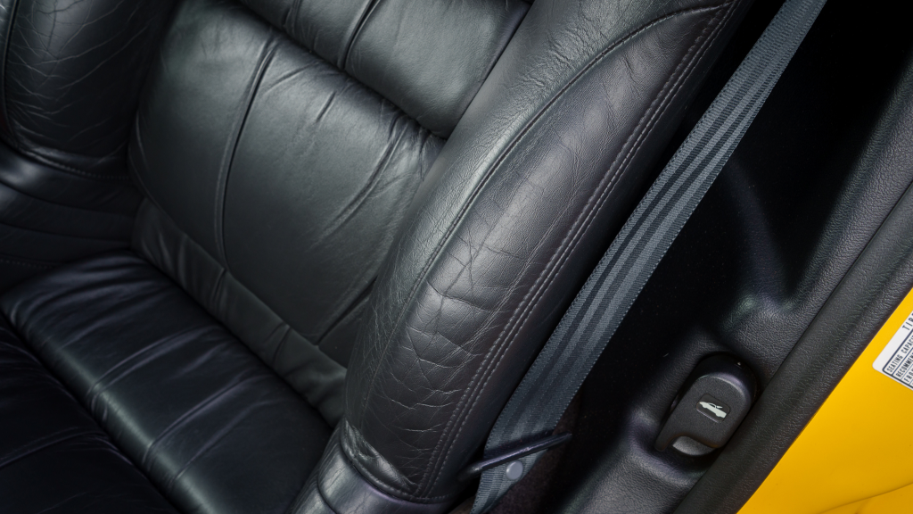 The NSX featured aluminum bodywork, and this example is finished in Spa Yellow Pearl with a body-color removable roof panel. Features include pop-up headlights, an integrated rear wing, side air intakes, power-adjustable side mirrors, and dual exhaust outlets. A ceramic coating has been applied to the body, the trunk struts were replaced in October 2024, and a replacement front spoiler was fitted in July 2025. Paint meter readings are provided in the gallery.