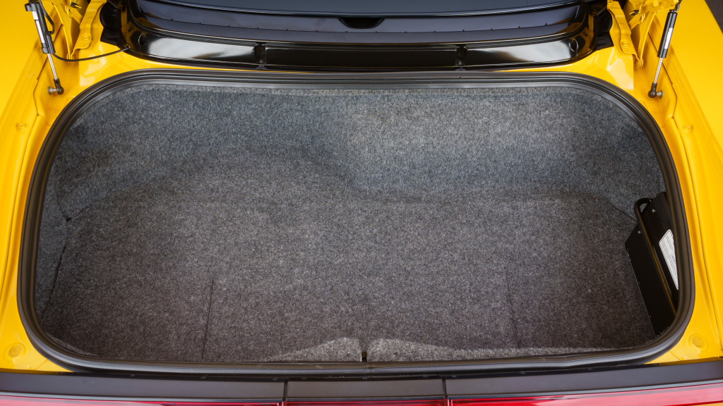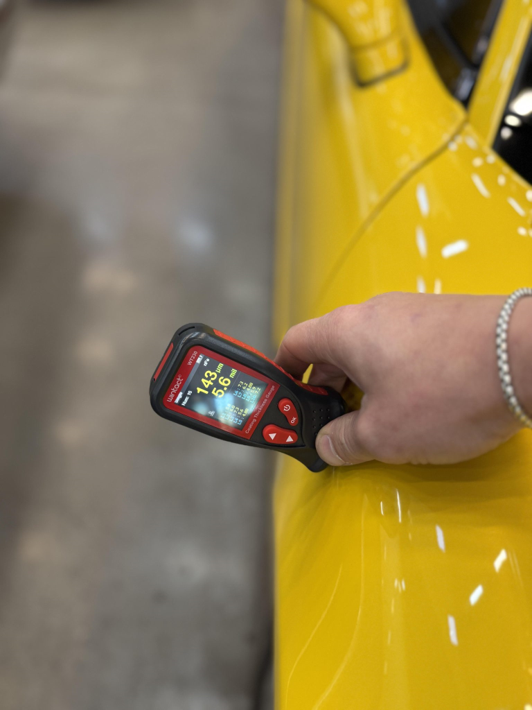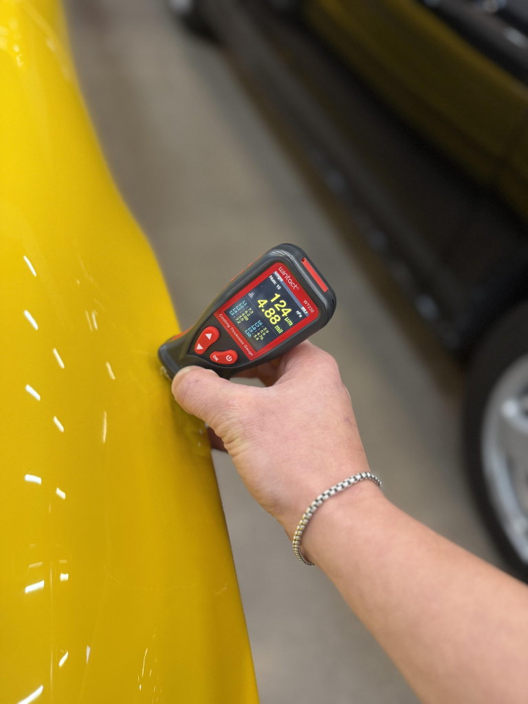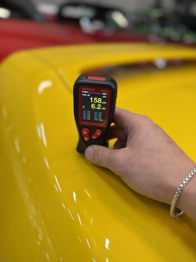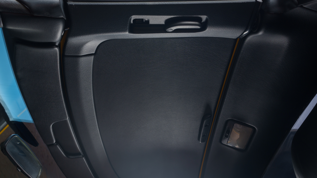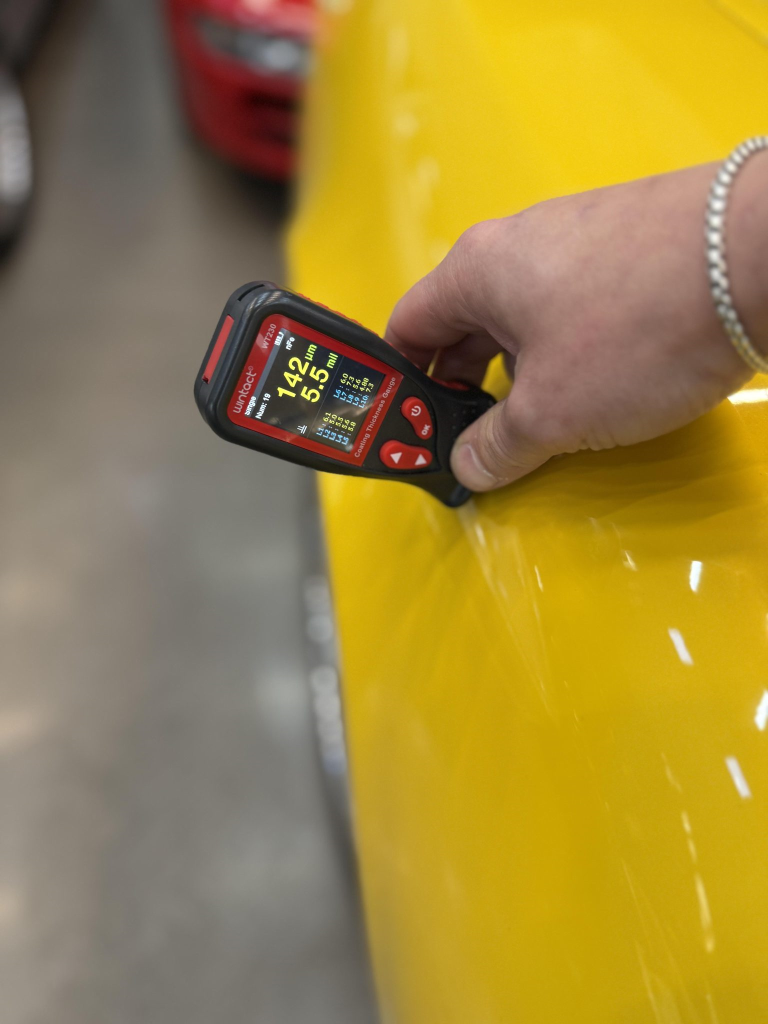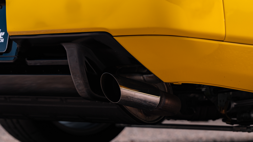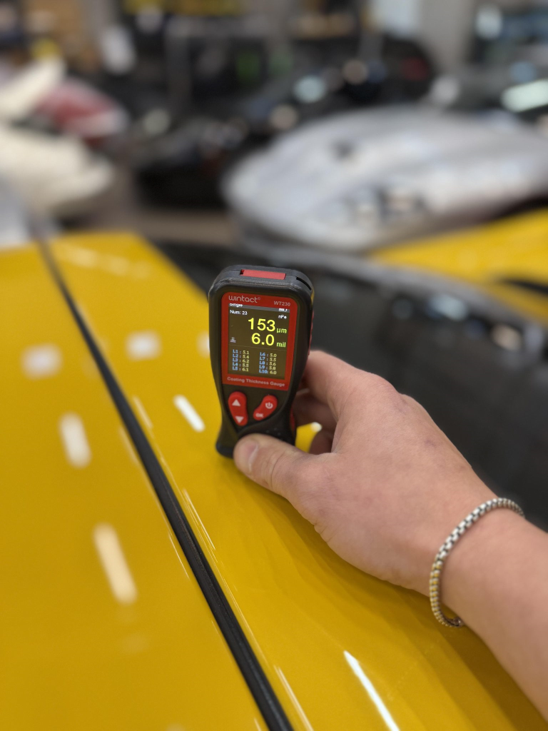 The NSX featured aluminum bodywork, and this example is finished in Spa Yellow Pearl with a body-color removable roof panel. Features include pop-up headlights, an integrated rear wing, side air intakes, power-adjustable side mirrors, and dual exhaust outlets. A ceramic coating has been applied to the body, the trunk struts were replaced in October 2024, and a replacement front spoiler was fitted in July 2025. Paint meter readings are provided in the gallery.
