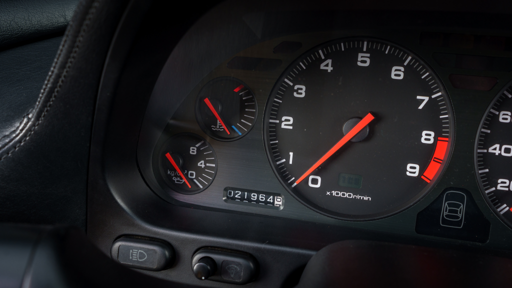 The leather-wrapped steering wheel frames a tachometer with an 8k-rpm redline, a 188-mph speedometer, and gauges for coolant temperature, oil pressure, voltage, and fuel level. The six-digit odometer shows 22k miles, approximately 900 of which were added under current ownership.