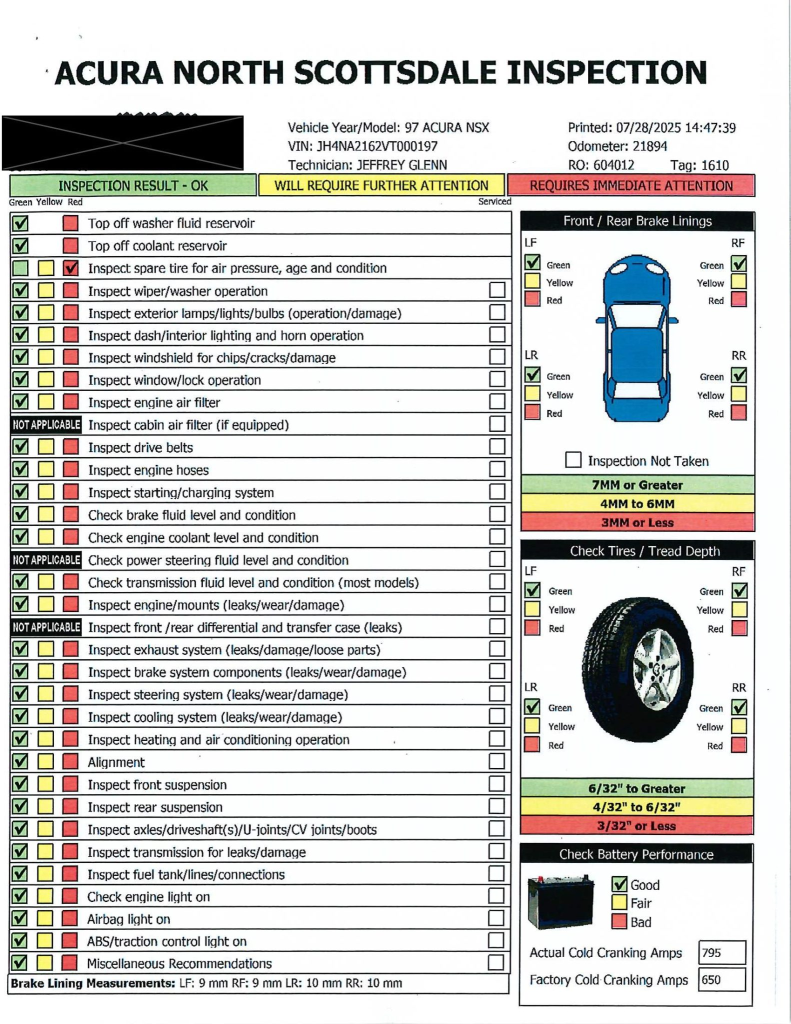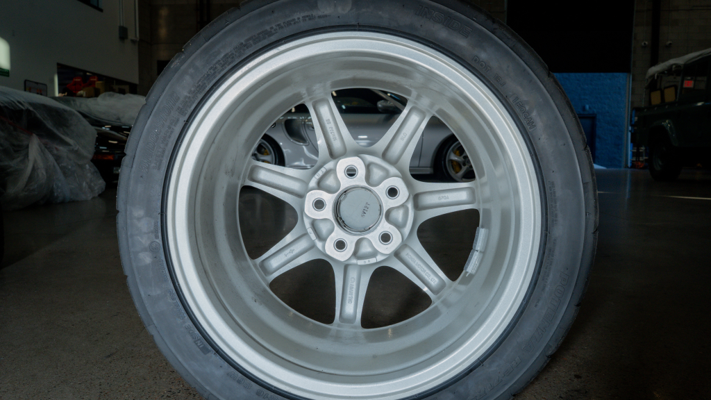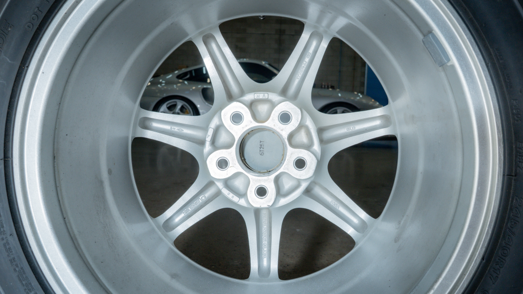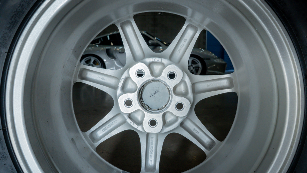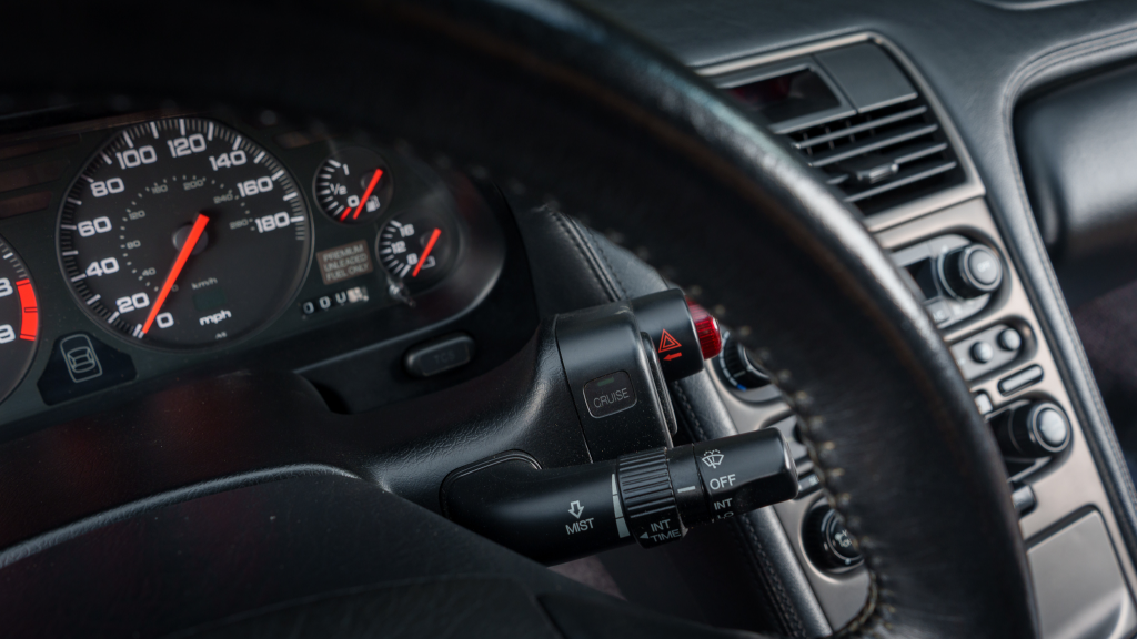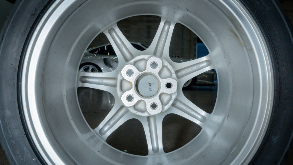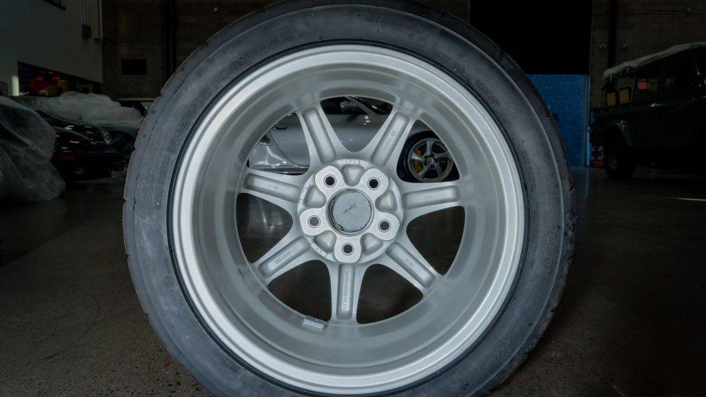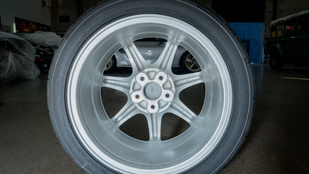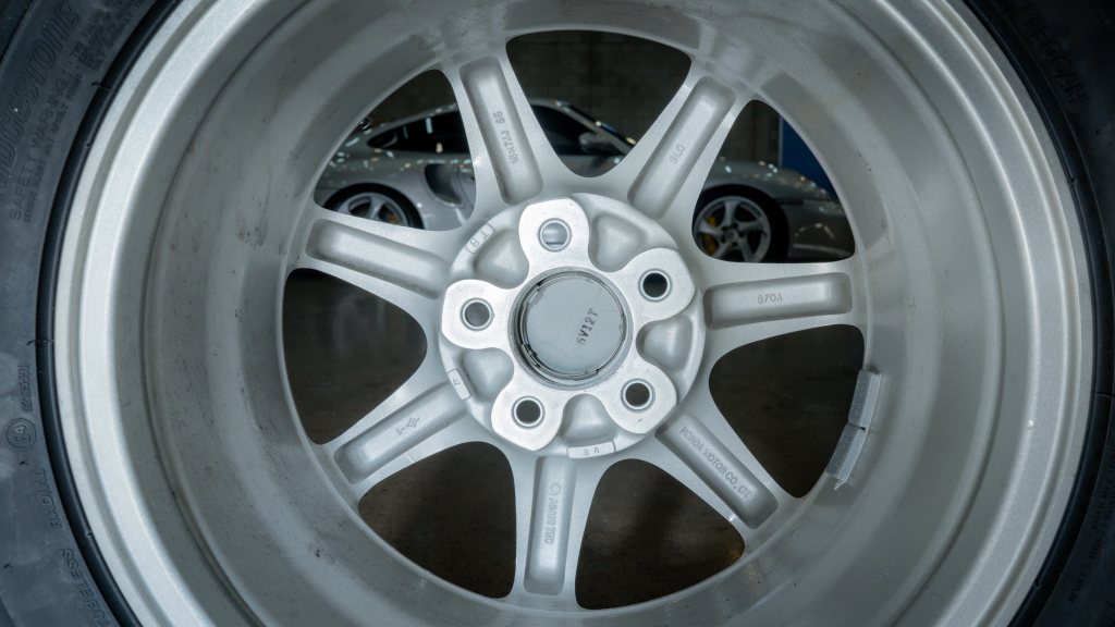 Staggered-diameter 16” and 17” seven-spoke aluminum wheels were refinished in July 2025 and were fitted with Bridgestone tires in October 2025. The car features a four-wheel double-wishbone suspension with front and rear stabilizer bars, and braking is handled by NSX-branded calipers over cross-drilled and slotted rotors at each corner. The brake pad and rotors were replaced in October 2024, at which time the brake fluid was flushed.