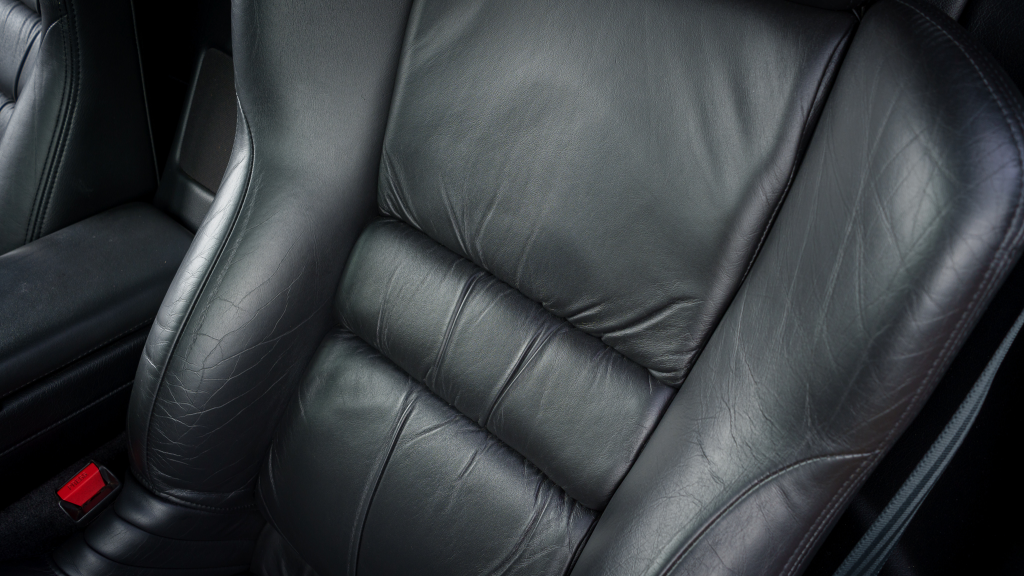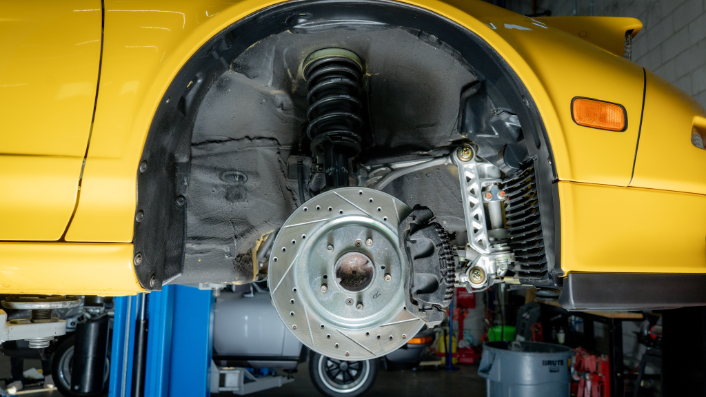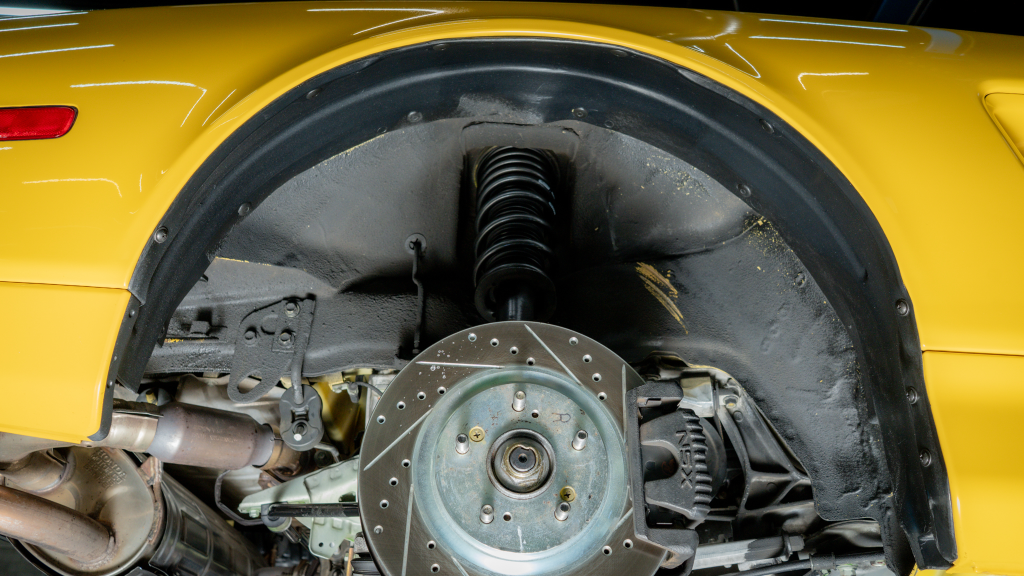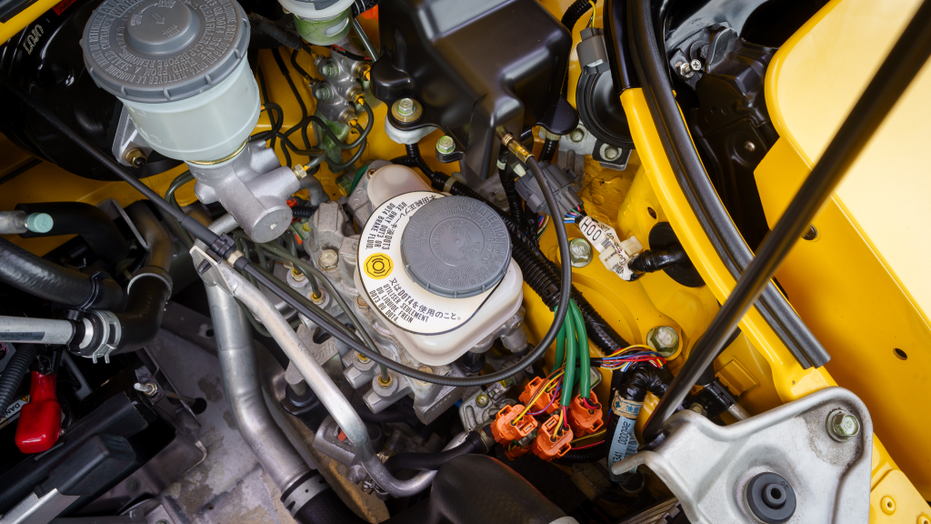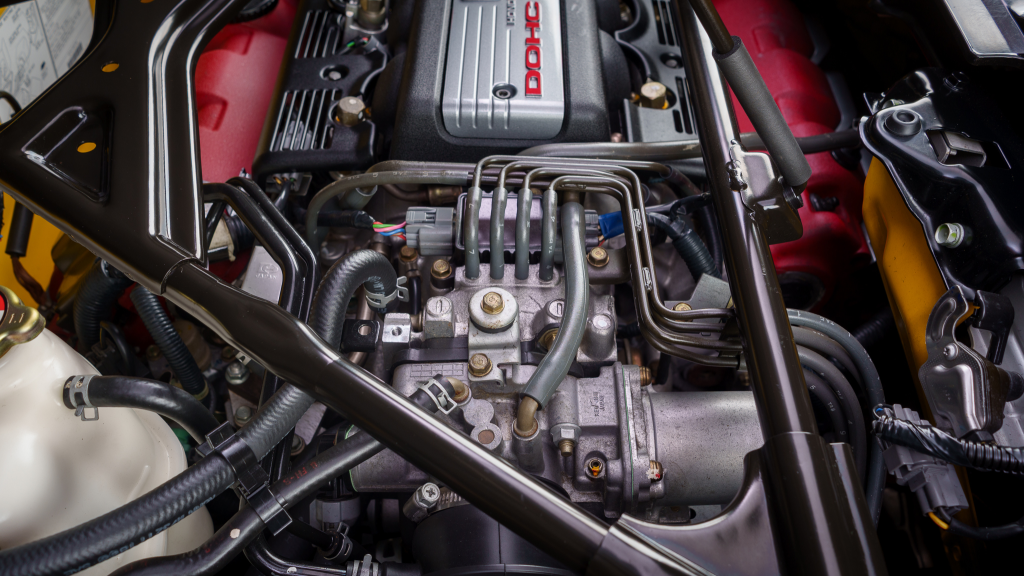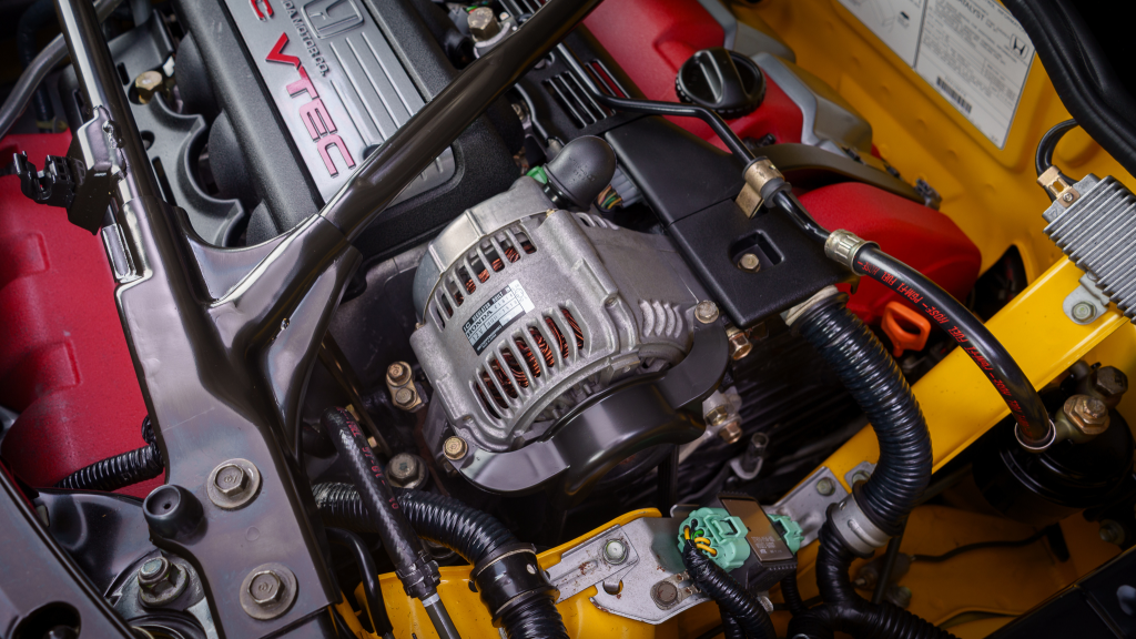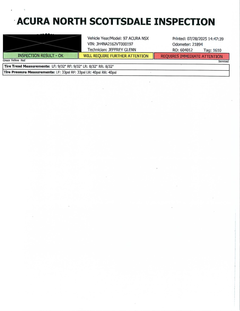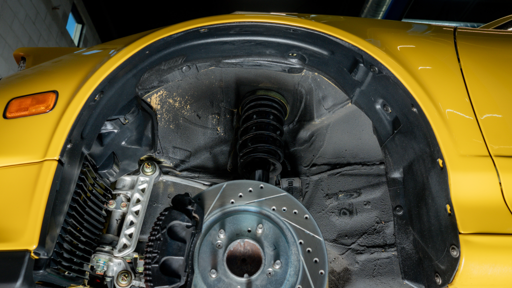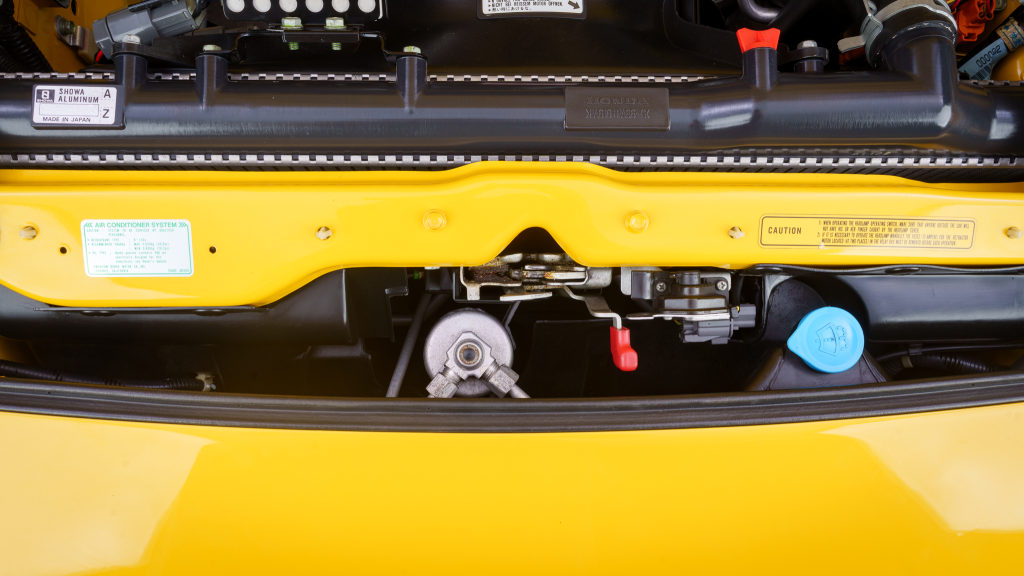Staggered-diameter 16” and 17” seven-spoke aluminum wheels were refinished in July 2025 and were fitted with Bridgestone tires in October 2025. The car features a four-wheel double-wishbone suspension with front and rear stabilizer bars, and braking is handled by NSX-branded calipers over cross-drilled and slotted rotors at each corner. The brake pad and rotors were replaced in October 2024, at which time the brake fluid was flushed.