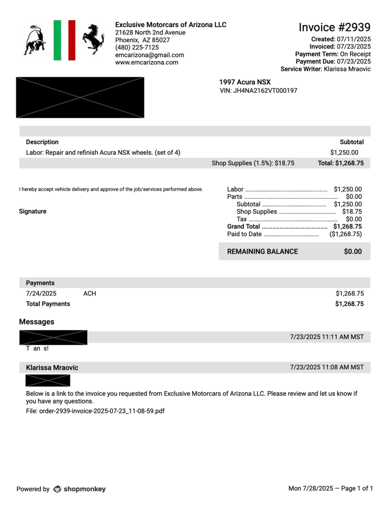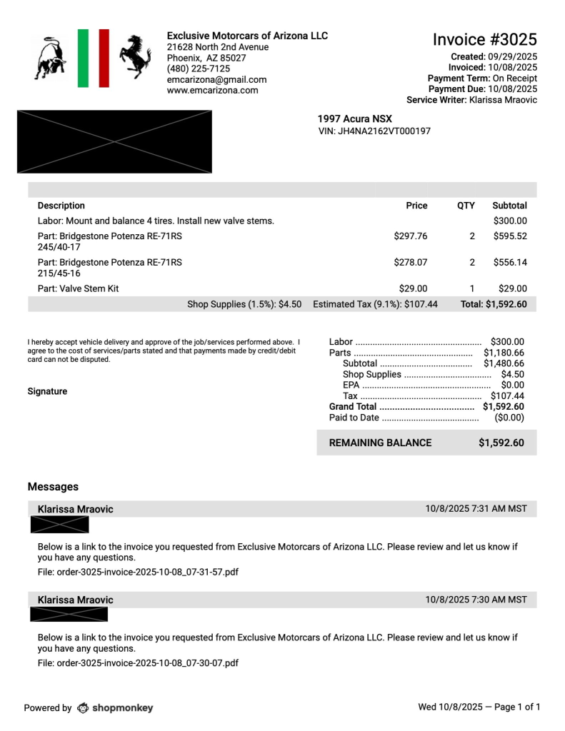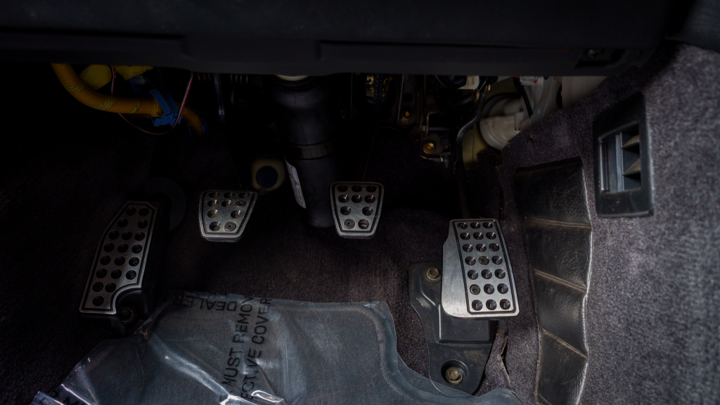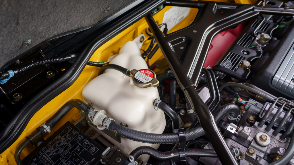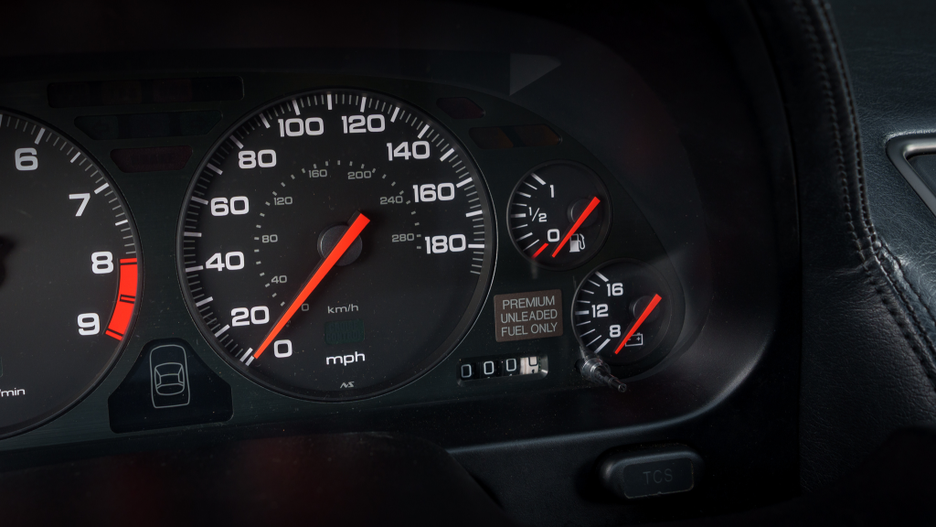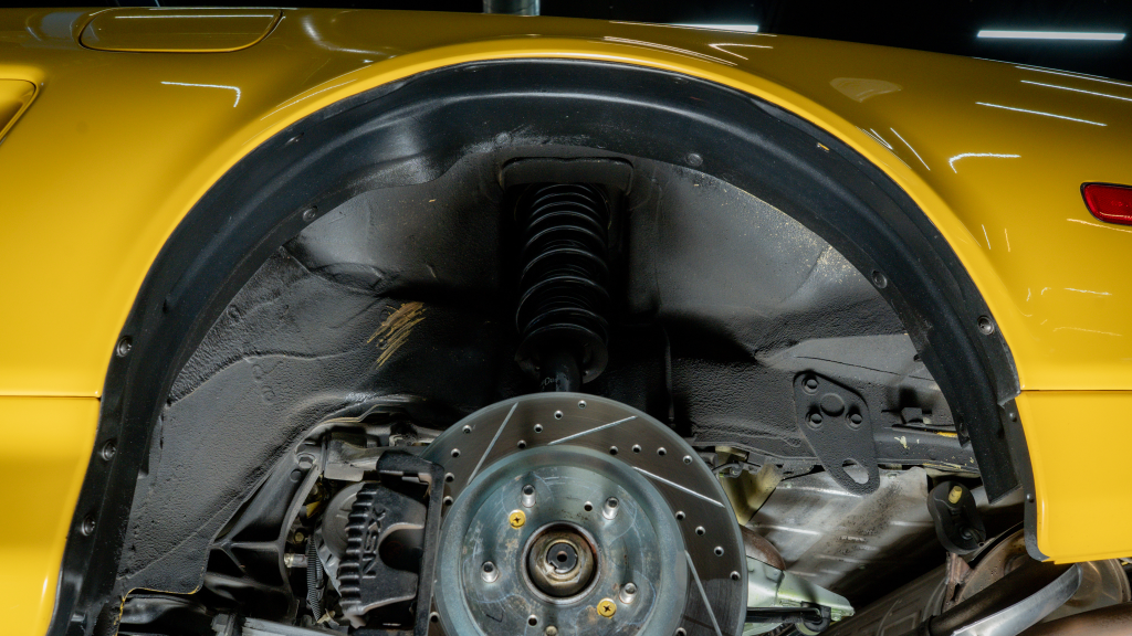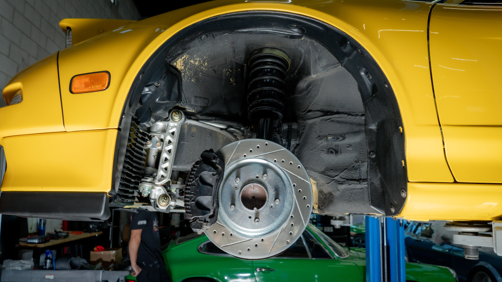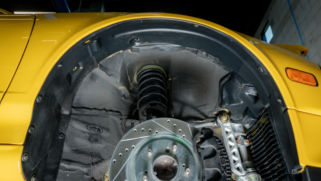 Staggered-diameter 16” and 17” seven-spoke aluminum wheels were refinished in July 2025 and were fitted with Bridgestone tires in October 2025. The car features a four-wheel double-wishbone suspension with front and rear stabilizer bars, and braking is handled by NSX-branded calipers over cross-drilled and slotted rotors at each corner. The brake pad and rotors were replaced in October 2024, at which time the brake fluid was flushed.