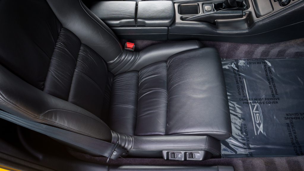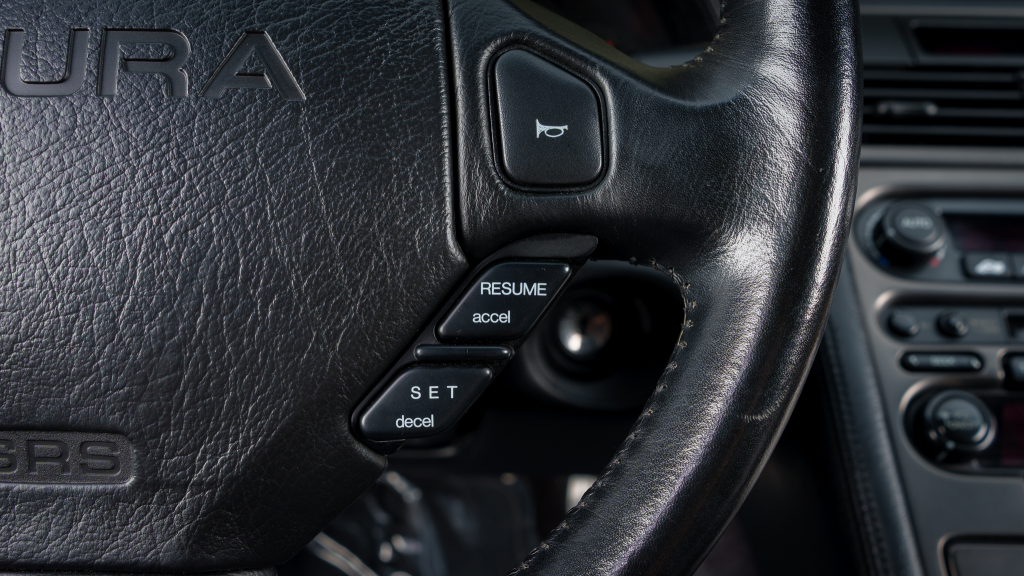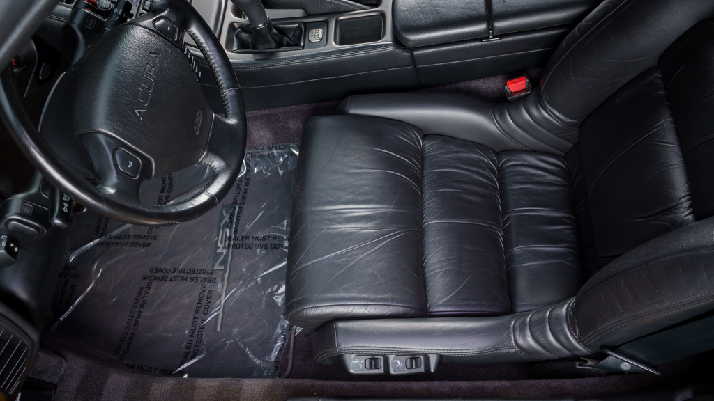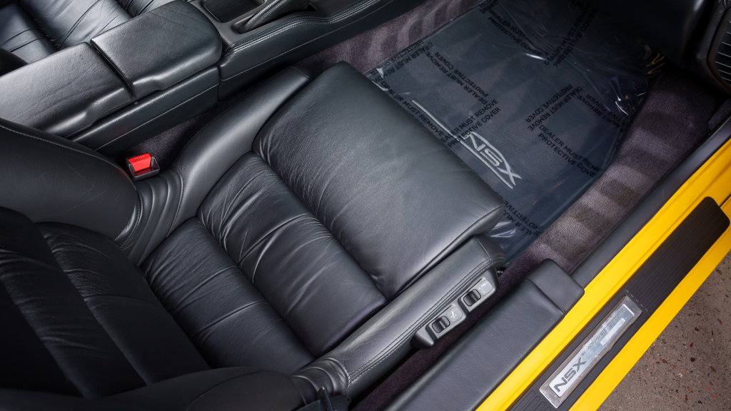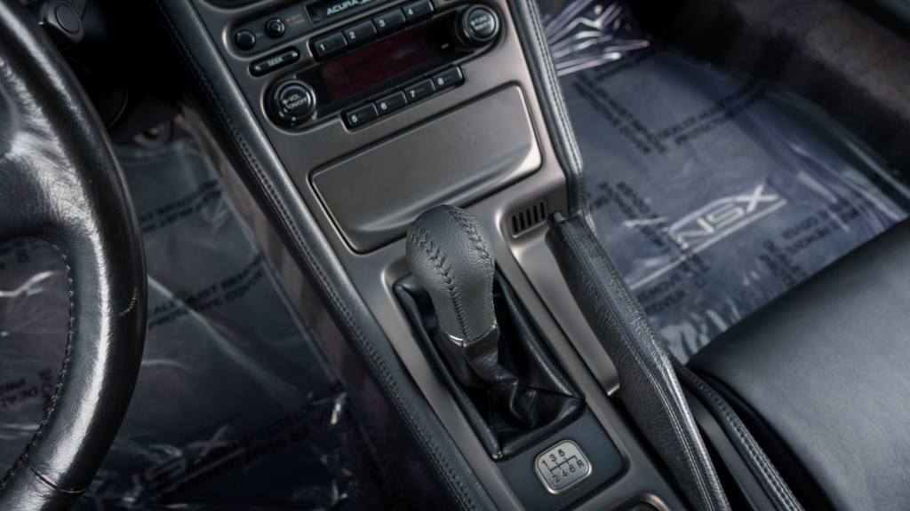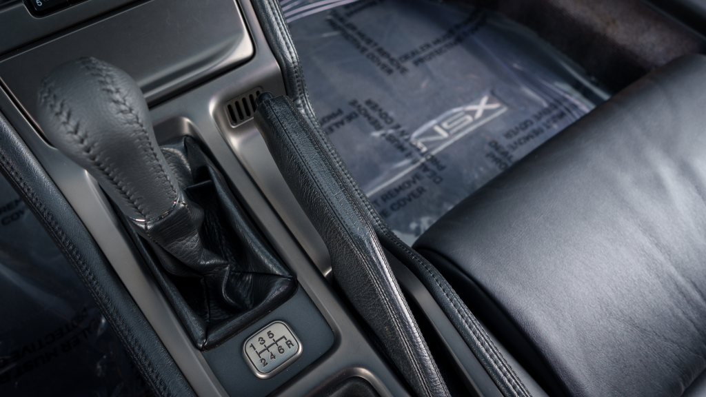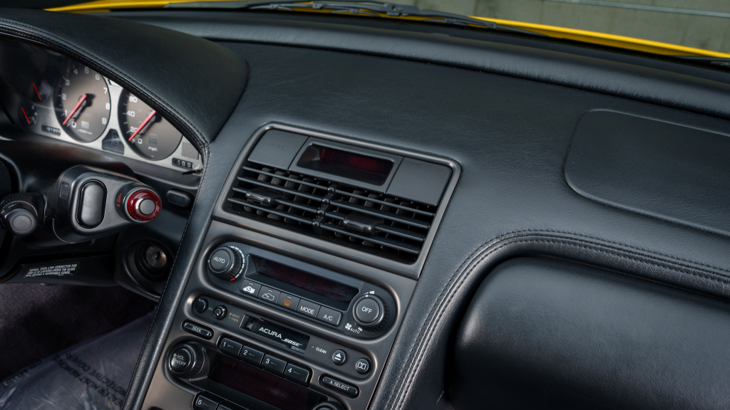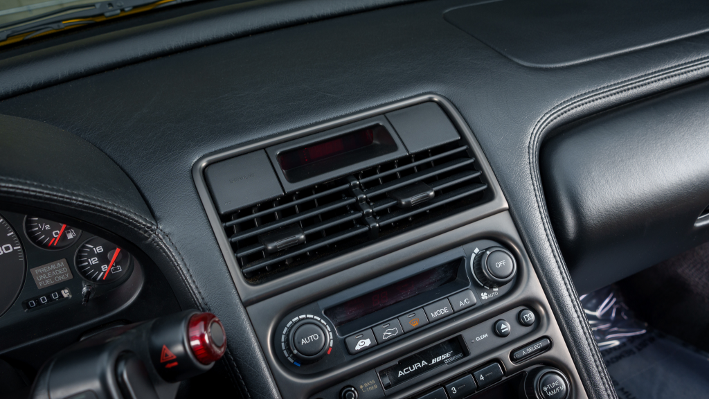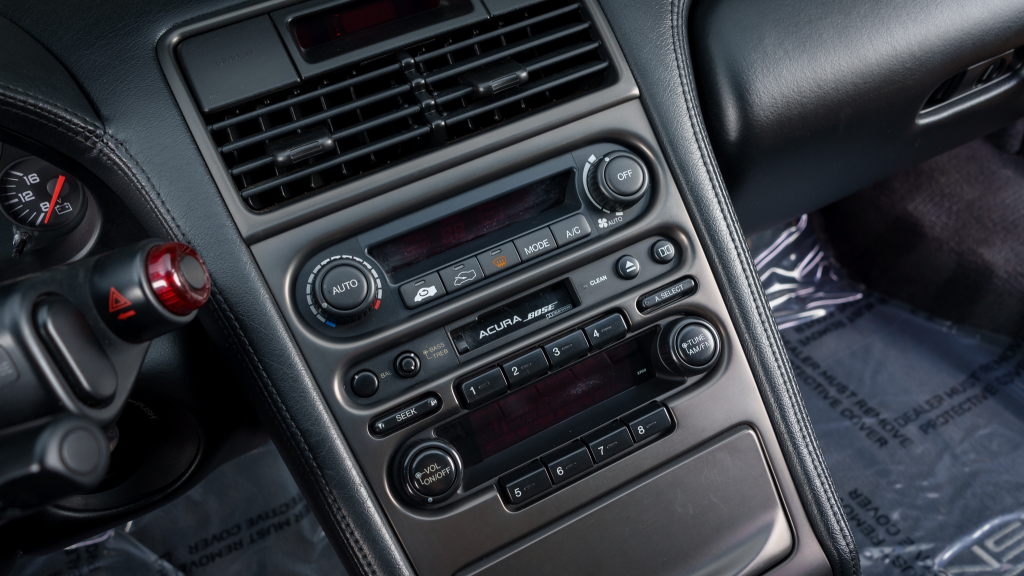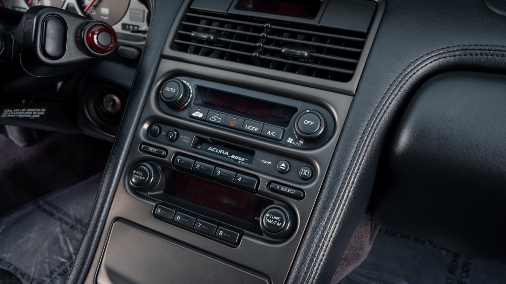 The power-adjustable sport seats are upholstered in Onyx leather, while NSX-branded floor mats line the footwells. Interior appointments include automatic climate control, cruise control, a Bose sound system, aftermarket pedal covers, and a cassette stereo linked to a six-disc CD changer. The stainless-steel door sill plates are stamped with the car’s serial number. According to a July 2025 invoice, the door lock knobs are missing. The shift knob was replaced in October 2024.