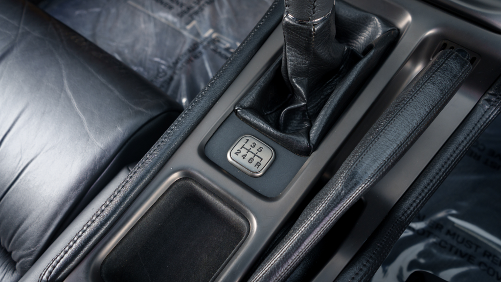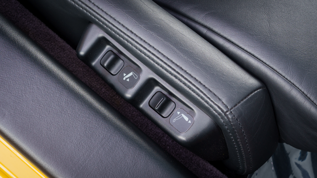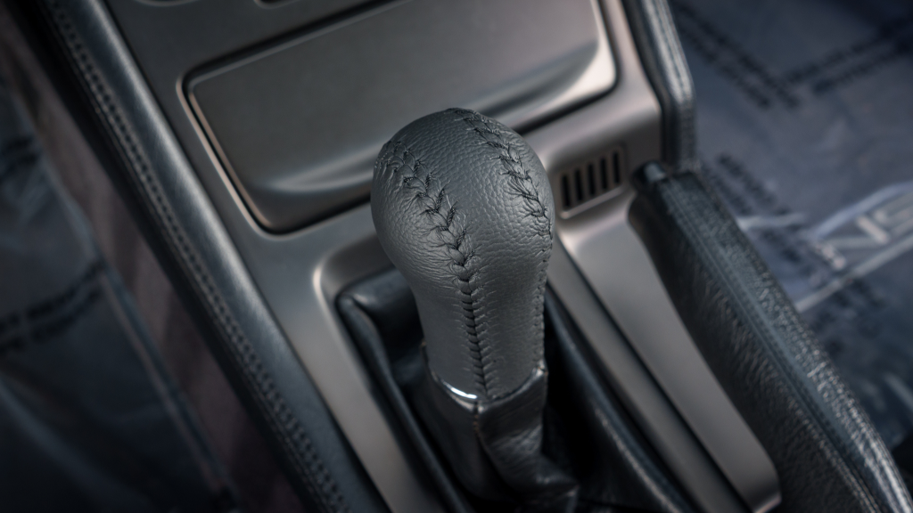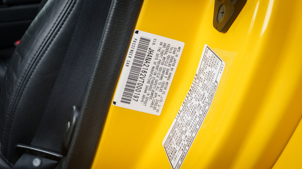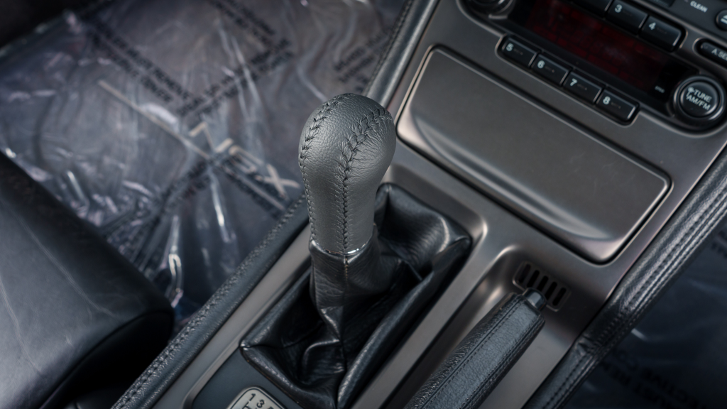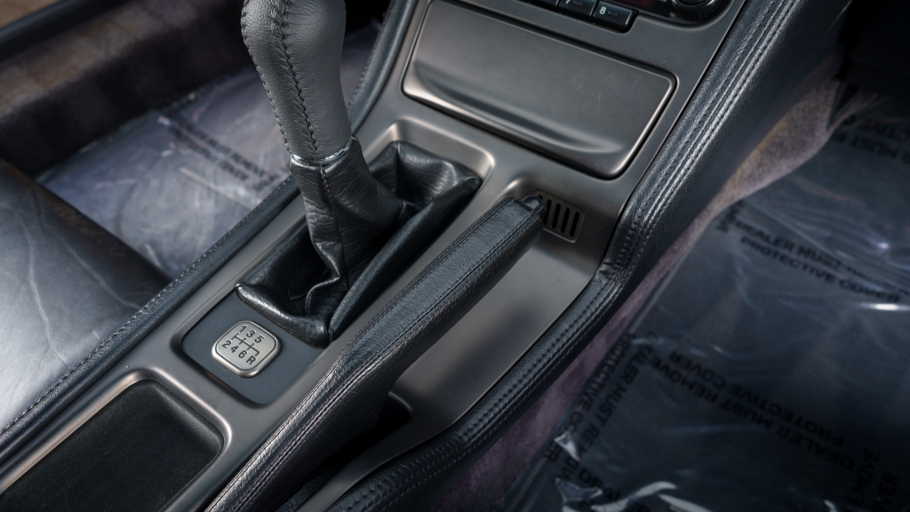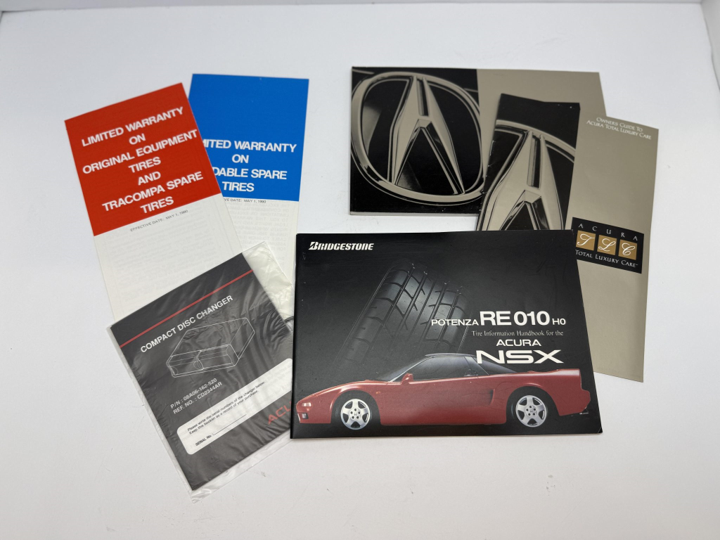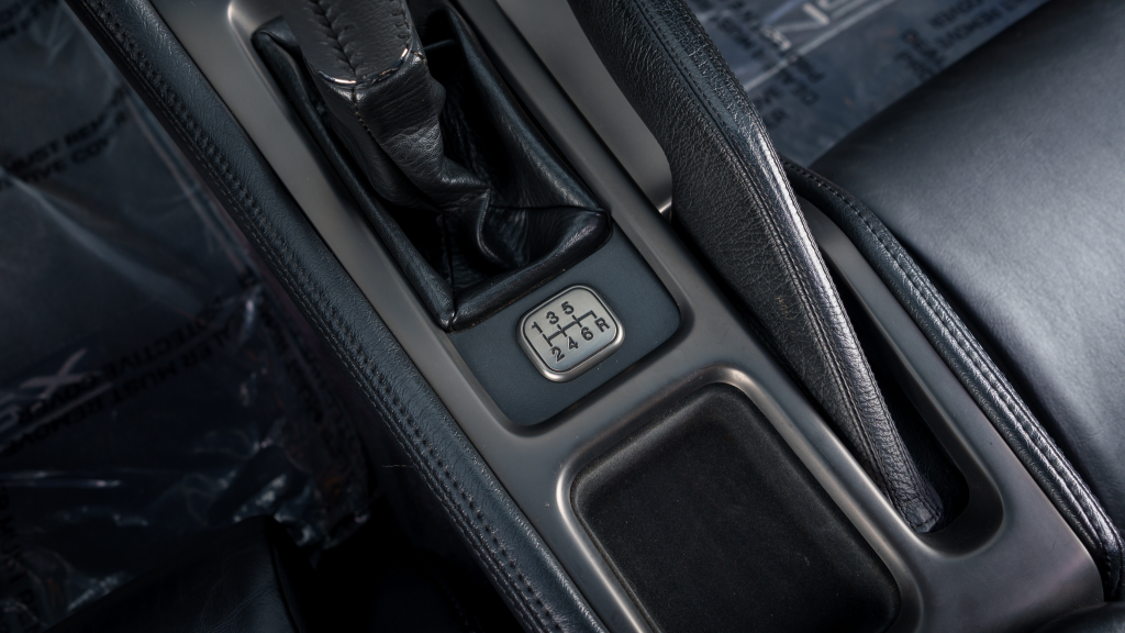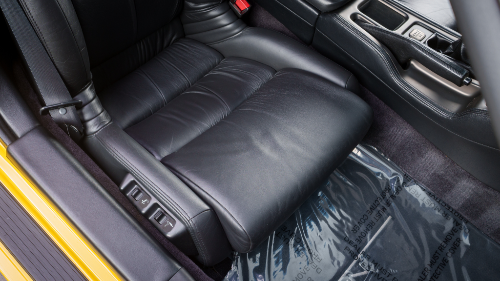 The power-adjustable sport seats are upholstered in Onyx leather, while NSX-branded floor mats line the footwells. Interior appointments include automatic climate control, cruise control, a Bose sound system, aftermarket pedal covers, and a cassette stereo linked to a six-disc CD changer. The stainless-steel door sill plates are stamped with the car’s serial number. According to a July 2025 invoice, the door lock knobs are missing. The shift knob was replaced in October 2024.
