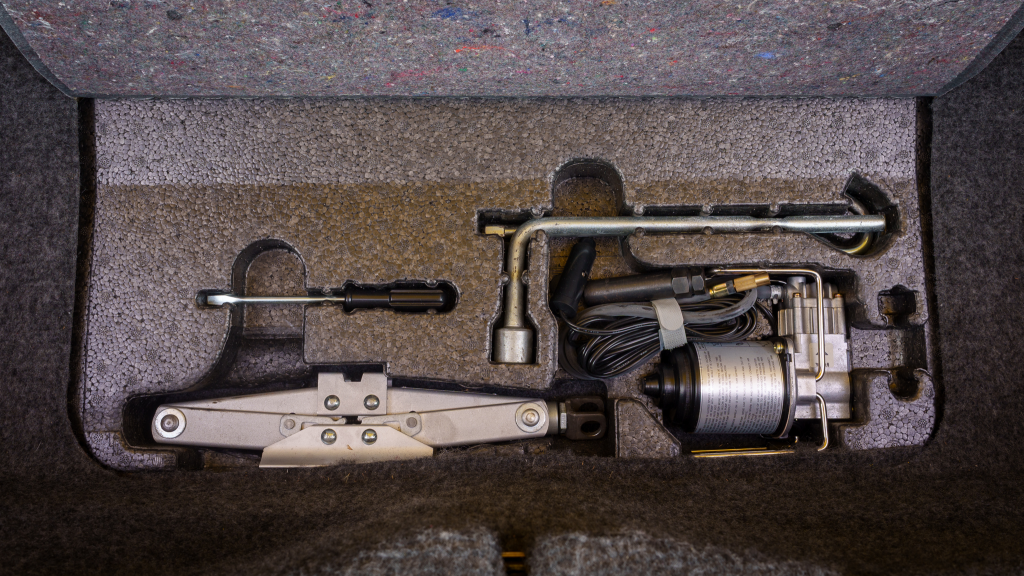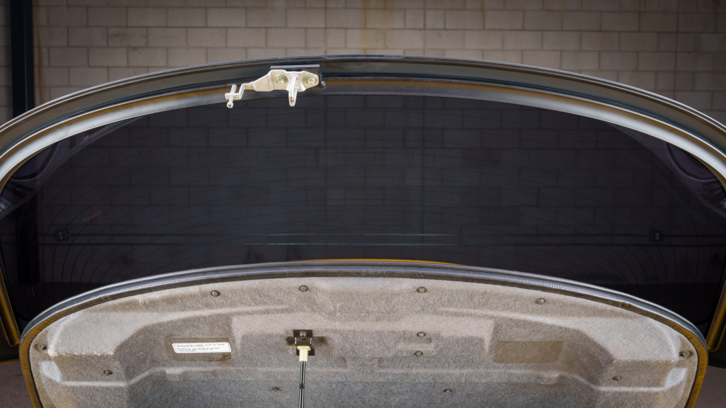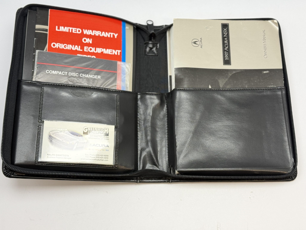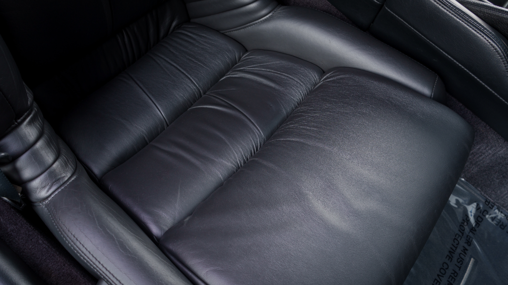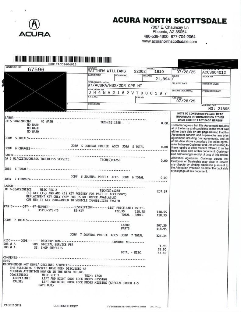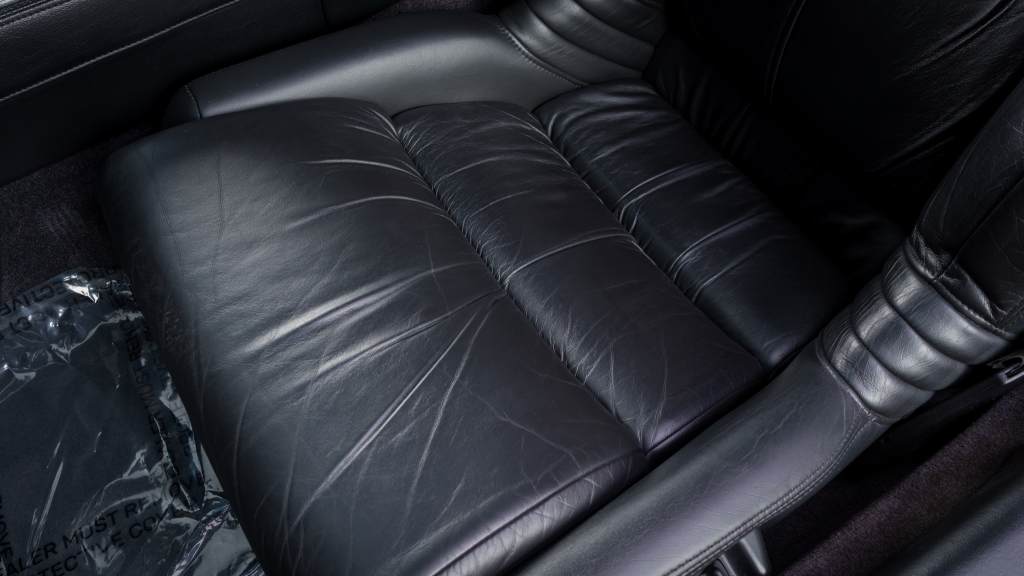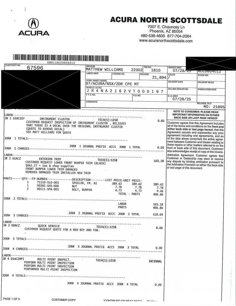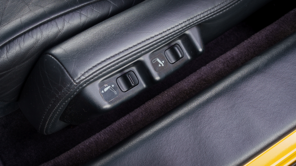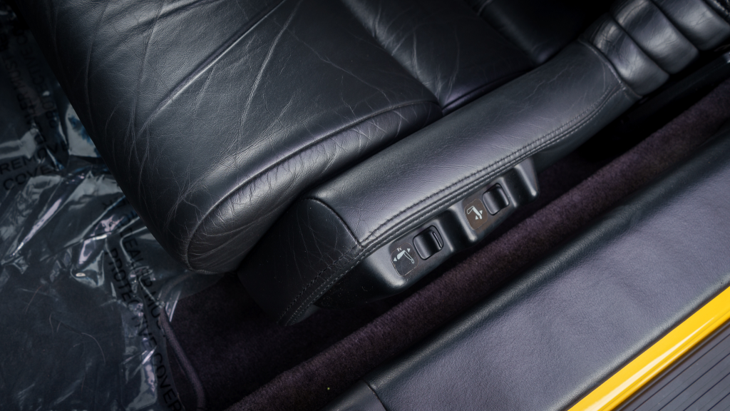 The power-adjustable sport seats are upholstered in Onyx leather, while NSX-branded floor mats line the footwells. Interior appointments include automatic climate control, cruise control, a Bose sound system, aftermarket pedal covers, and a cassette stereo linked to a six-disc CD changer. The stainless-steel door sill plates are stamped with the car’s serial number. According to a July 2025 invoice, the door lock knobs are missing. The shift knob was replaced in October 2024.