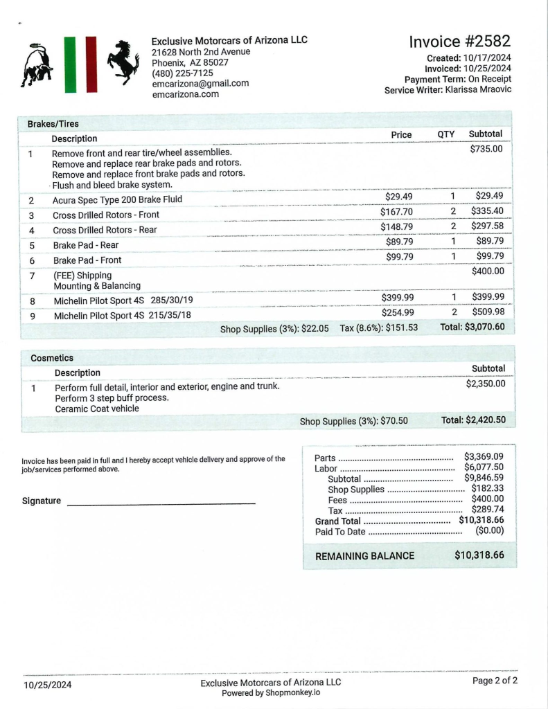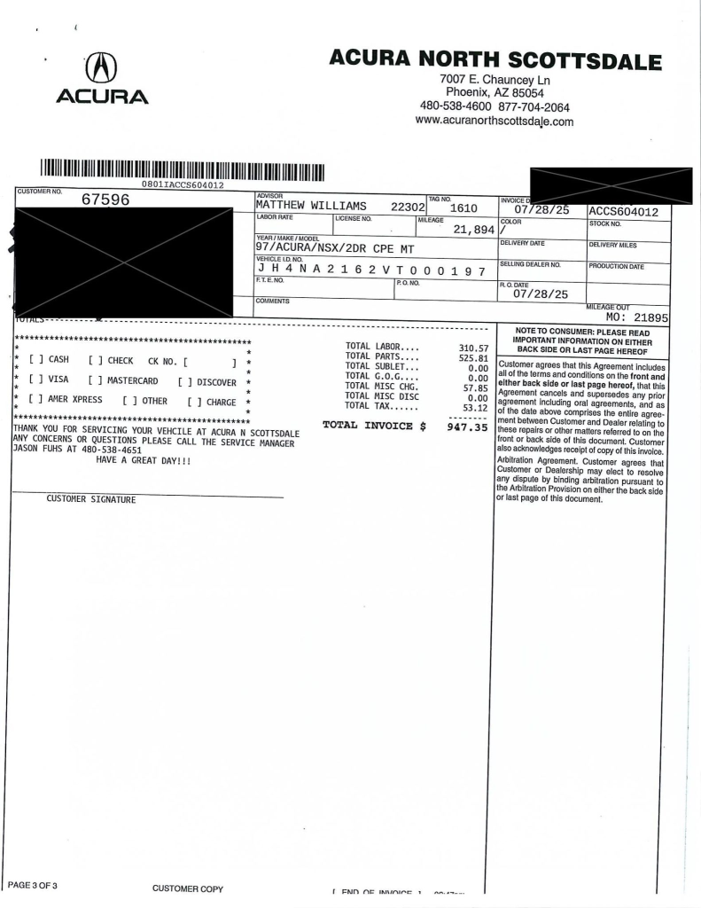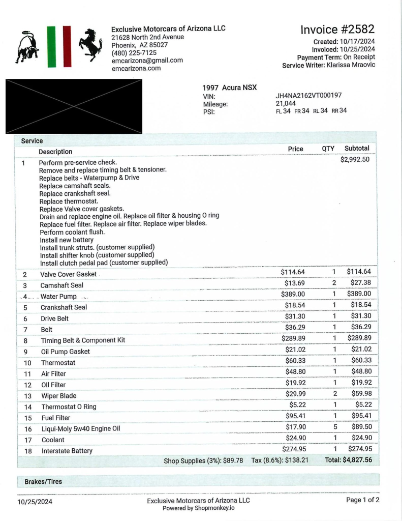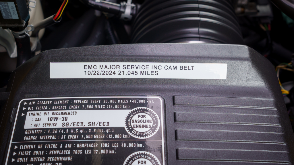 The 3.2-liter C32B V6 features dual overhead camshafts on each cylinder bank and utilizes VTEC variable valve timing. Factory-rated output was 290 horsepower and 224 lb-ft of torque. Work in October 2024 included changing the oil, flushing the coolant, and replacing the timing and drive belts, air filter, fuel filter, battery, thermostat, and camshaft and crankshaft seals.
