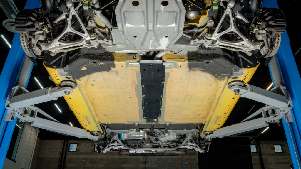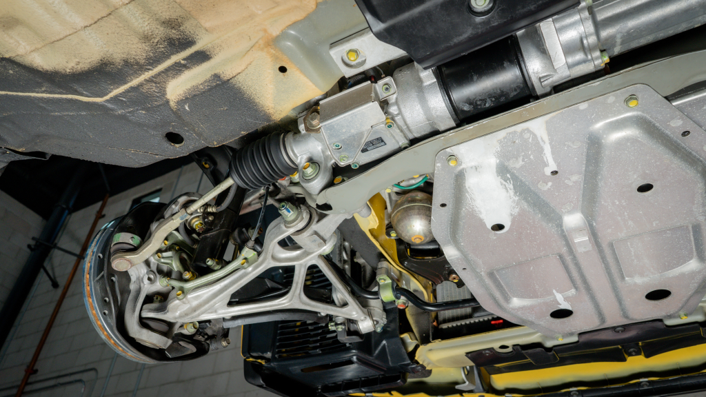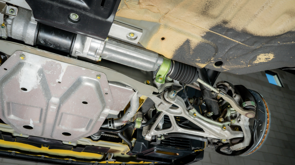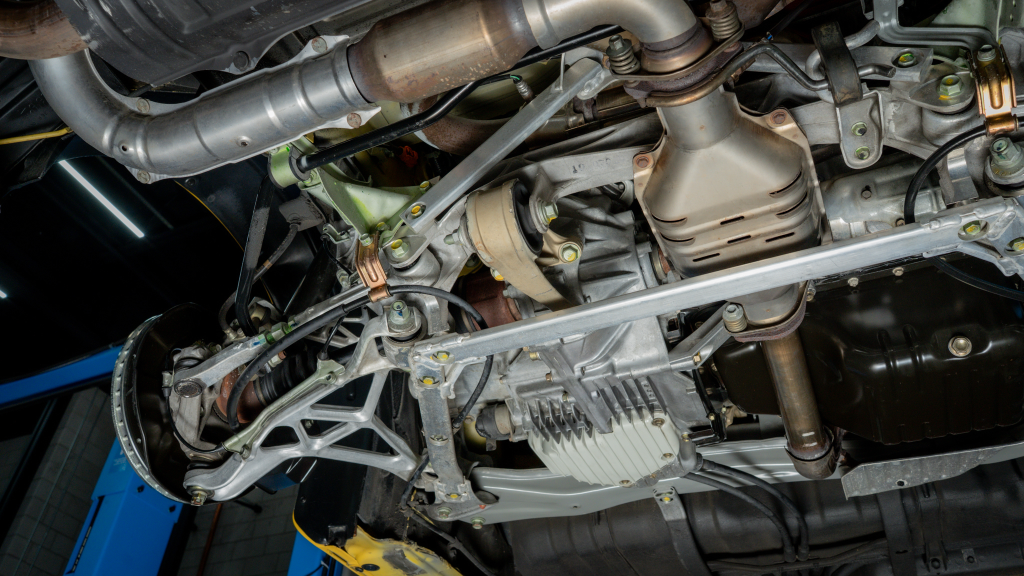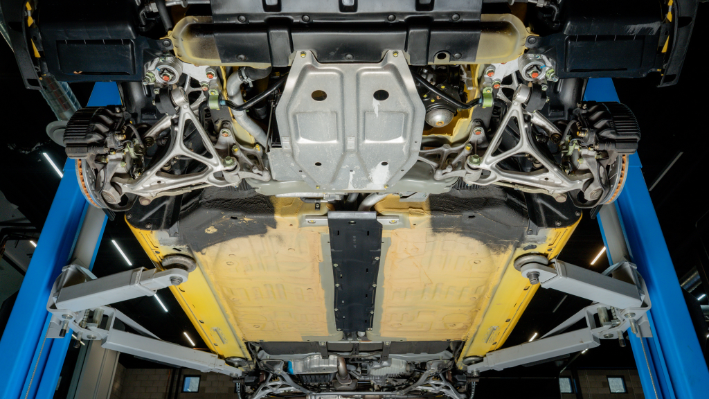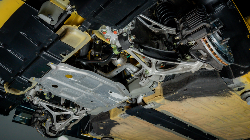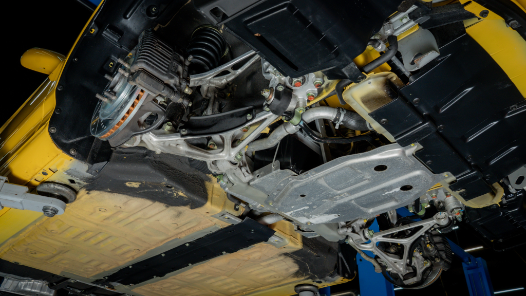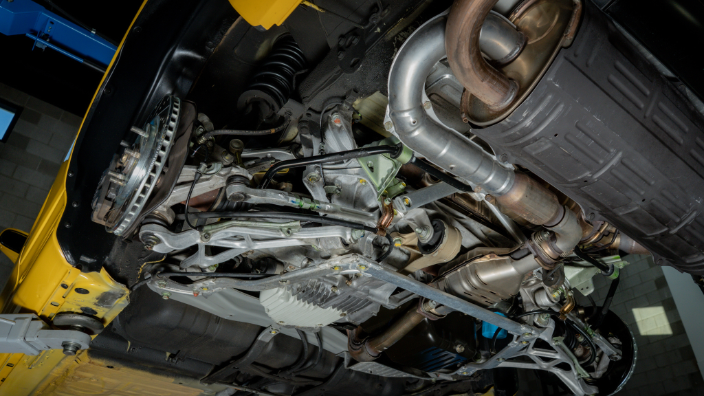 Power is routed to the rear wheels via a six-speed manual transaxle and a limited-slip differential. Additional photos of the underside are provided in the gallery.
