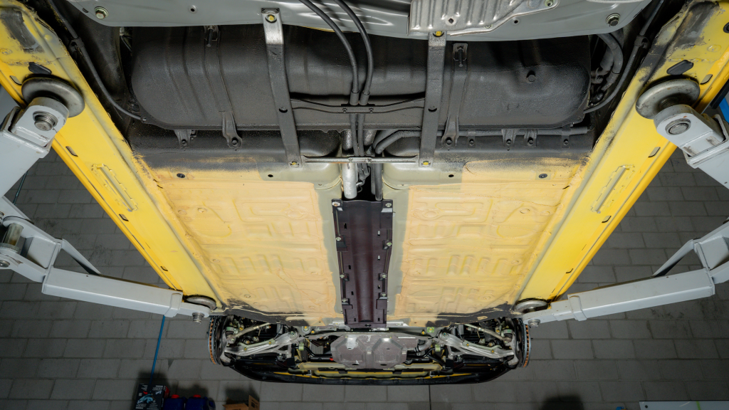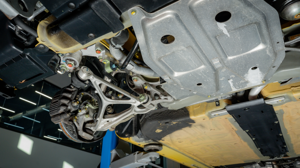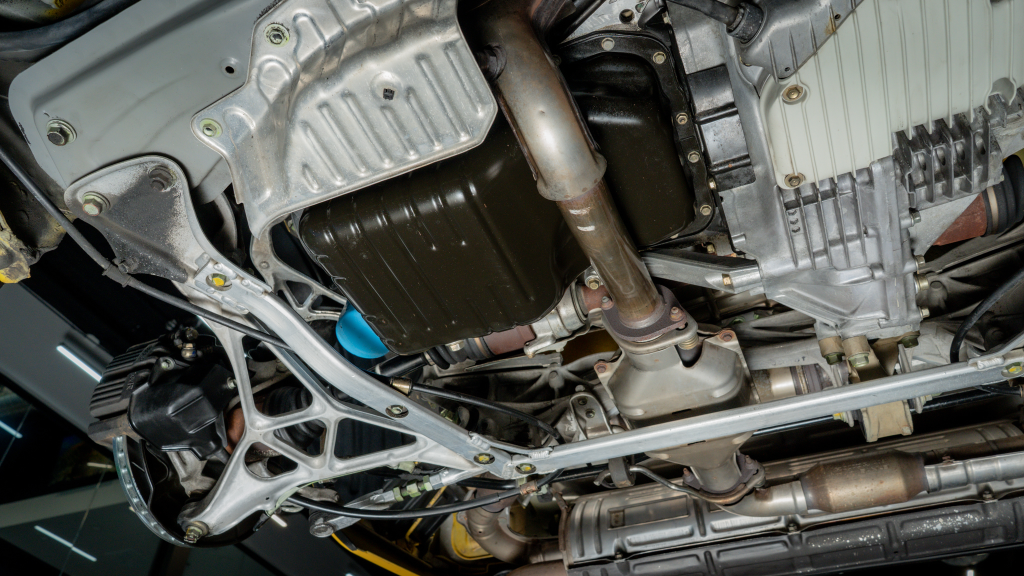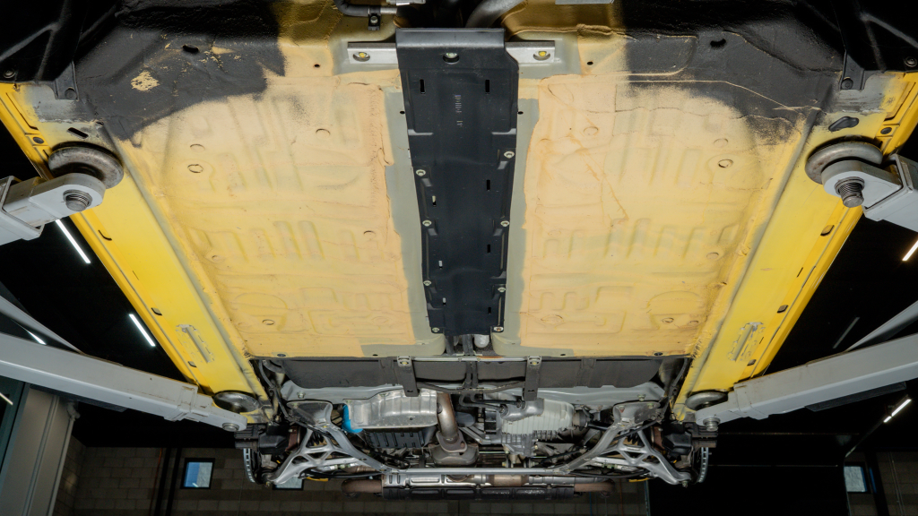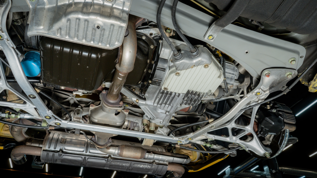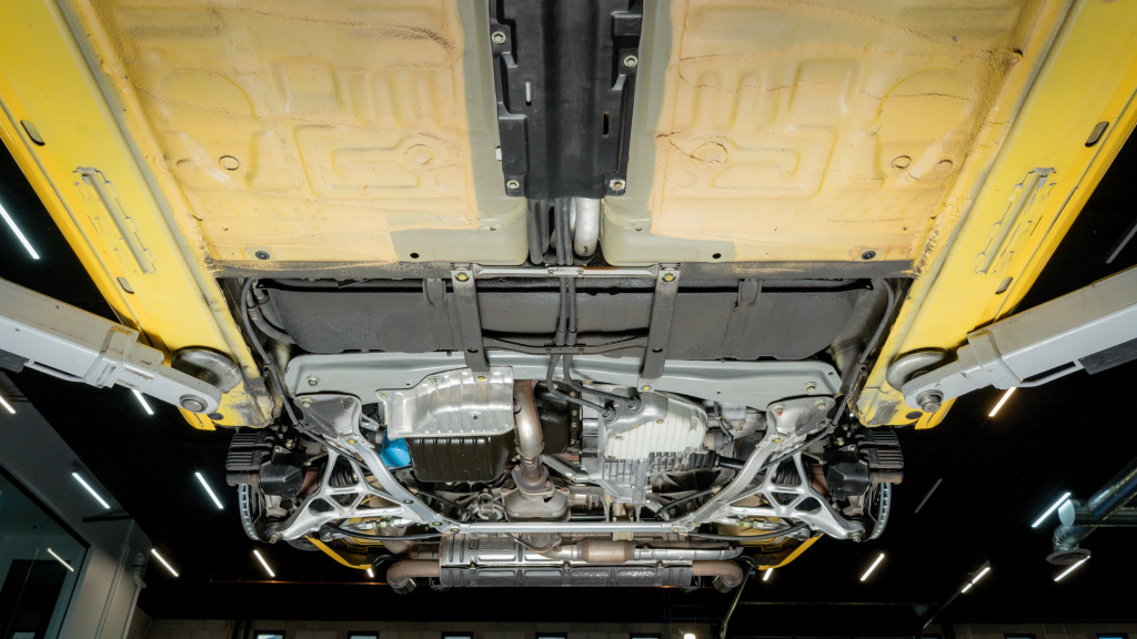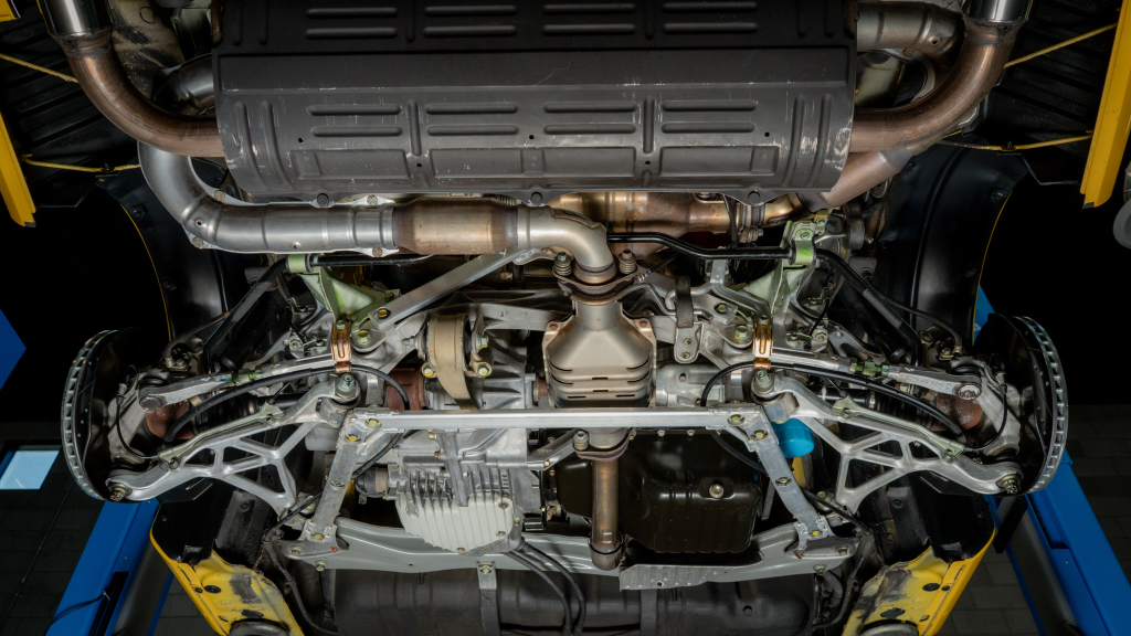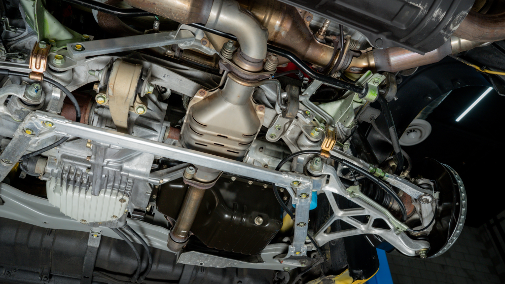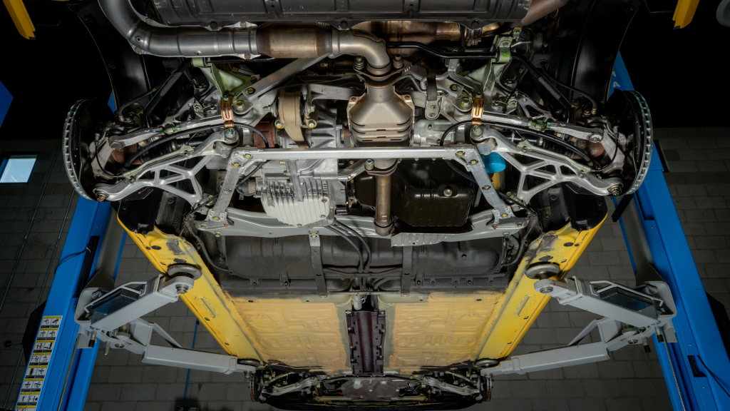 Power is routed to the rear wheels via a six-speed manual transaxle and a limited-slip differential. Additional photos of the underside are provided in the gallery.