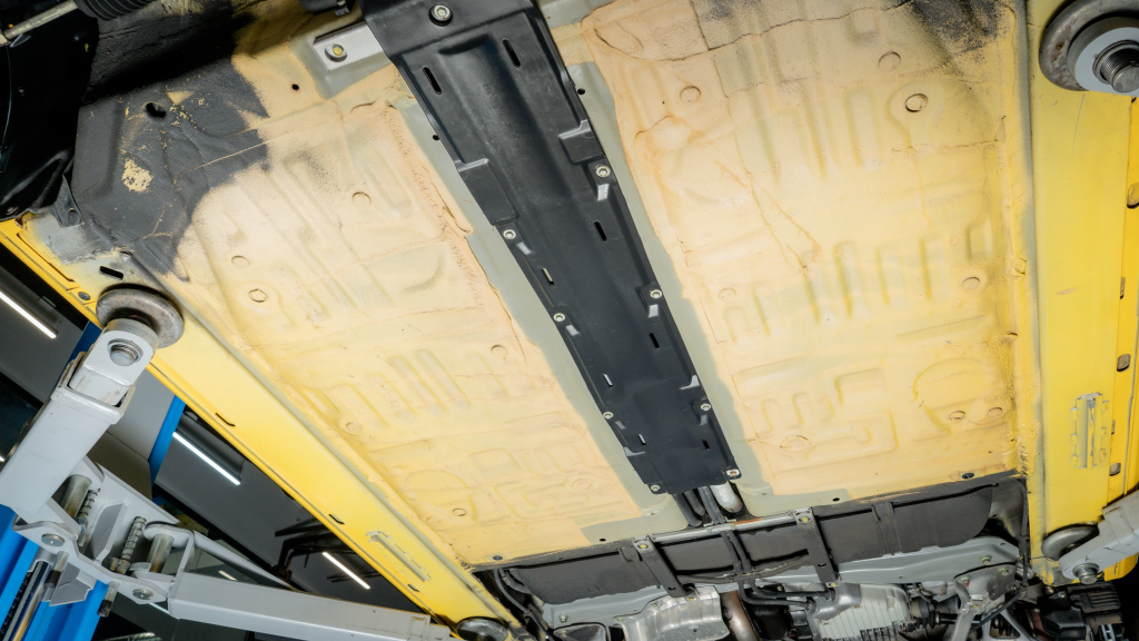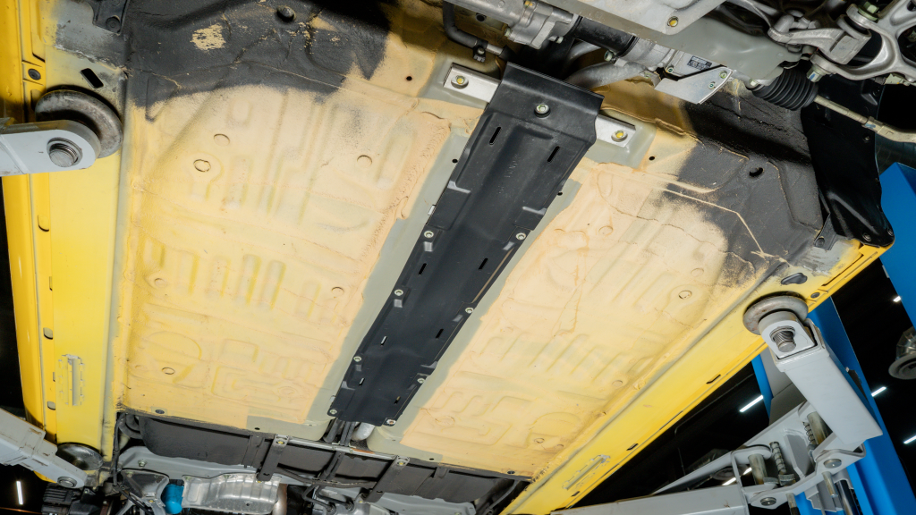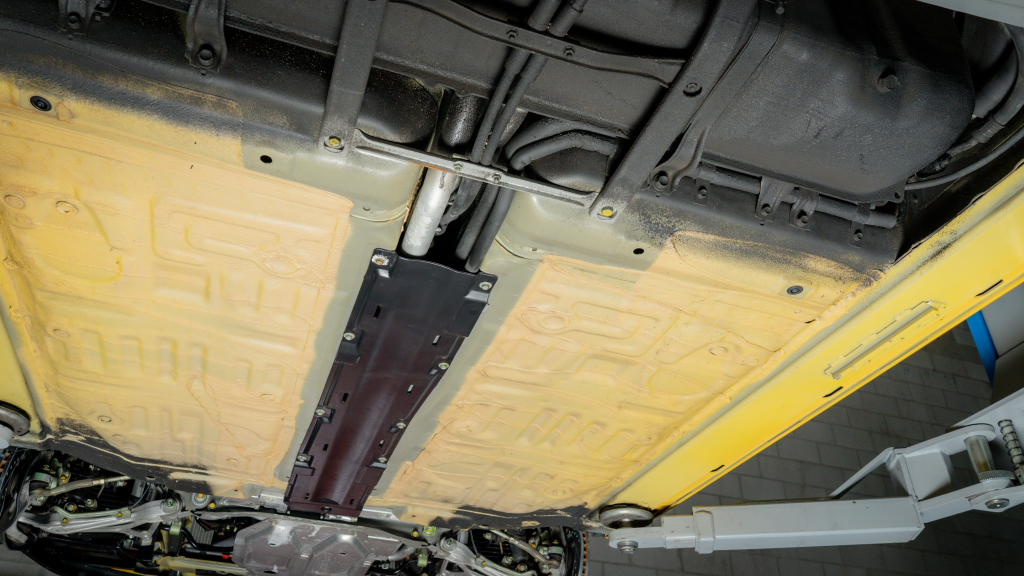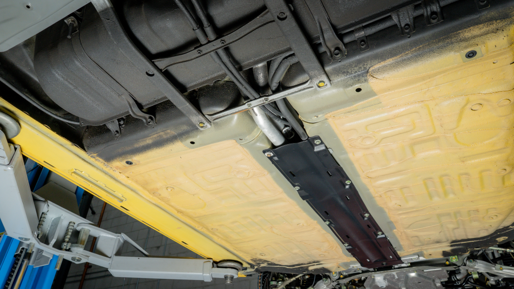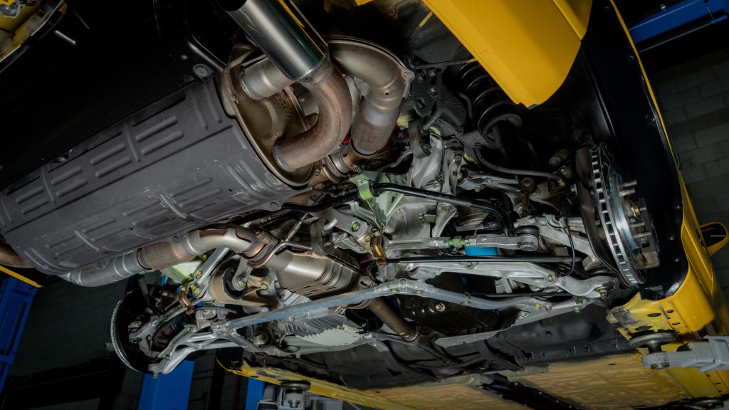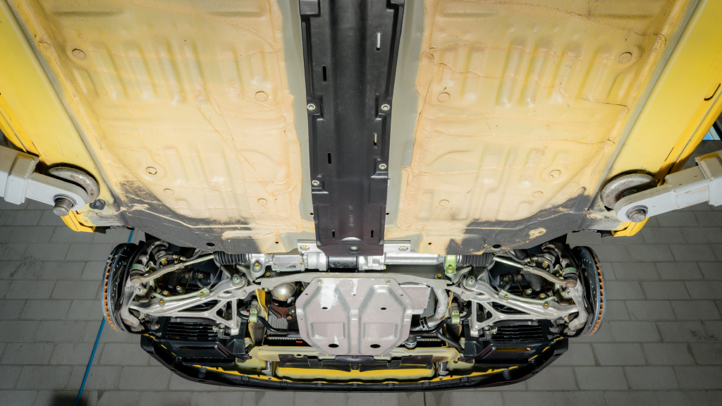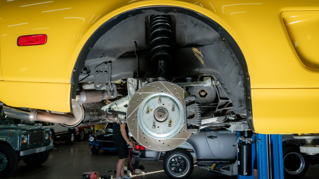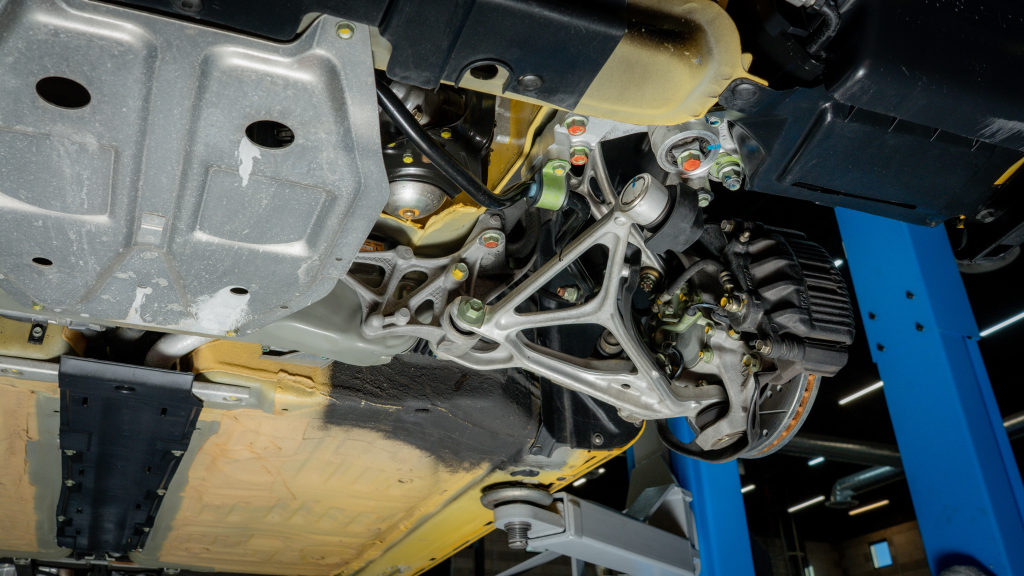 Power is routed to the rear wheels via a six-speed manual transaxle and a limited-slip differential. Additional photos of the underside are provided in the gallery.