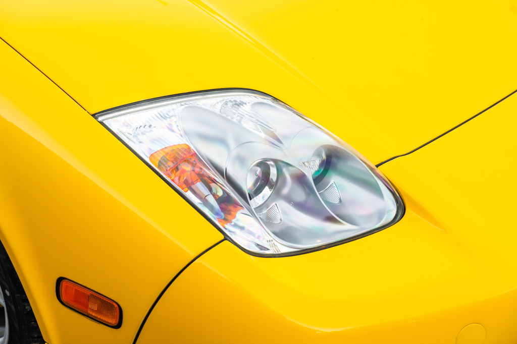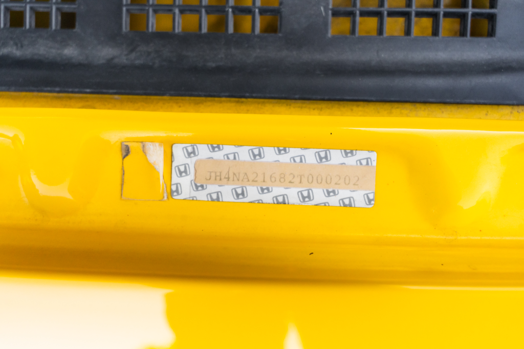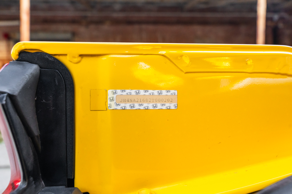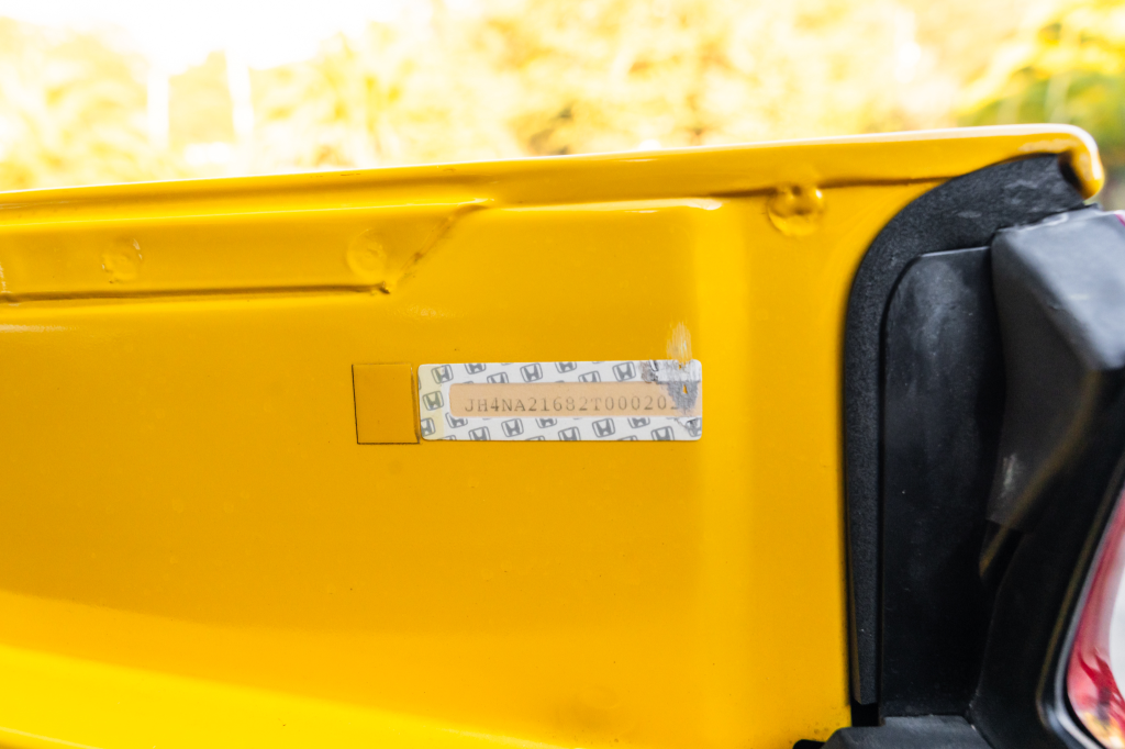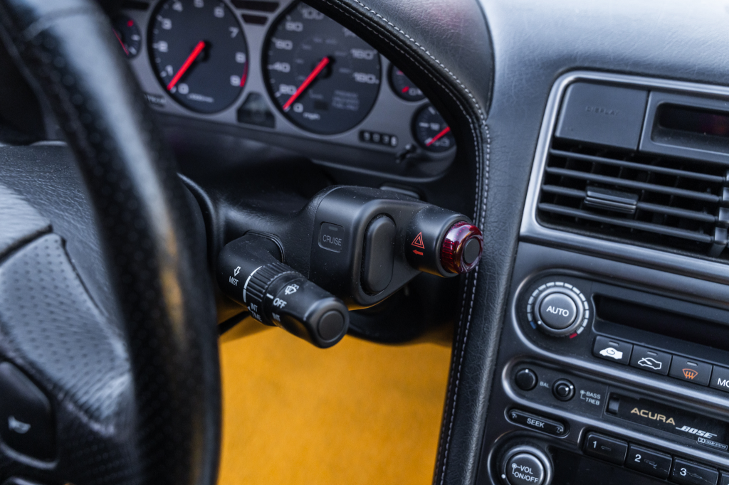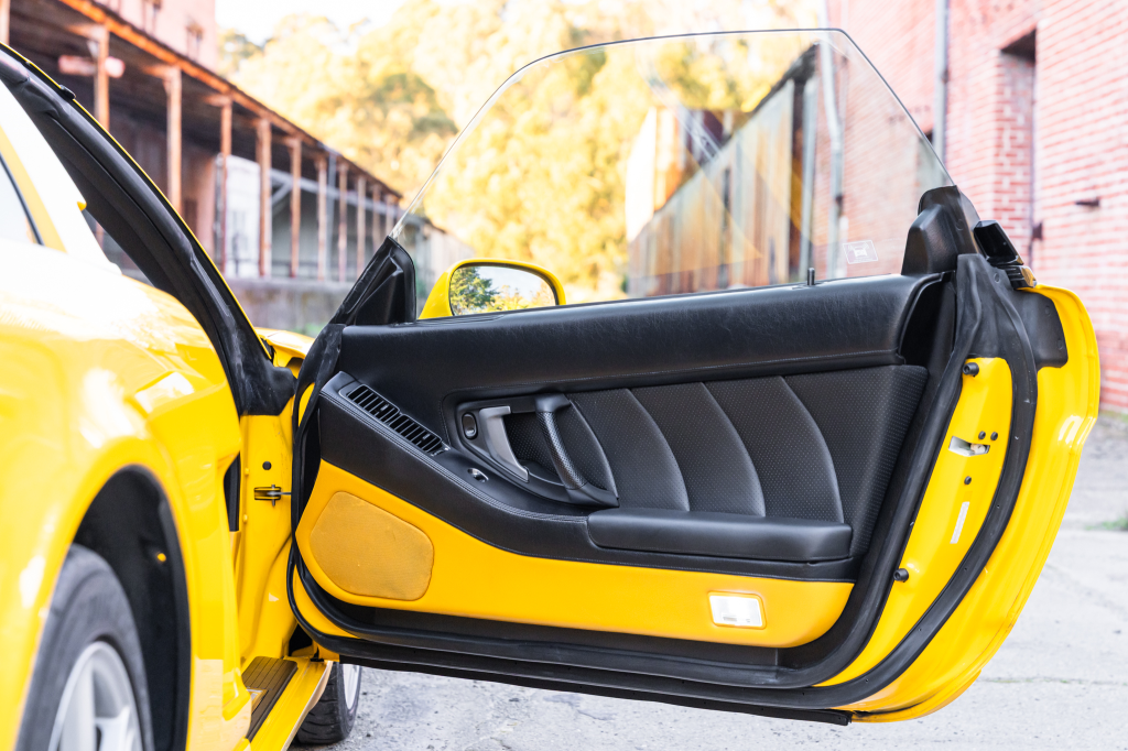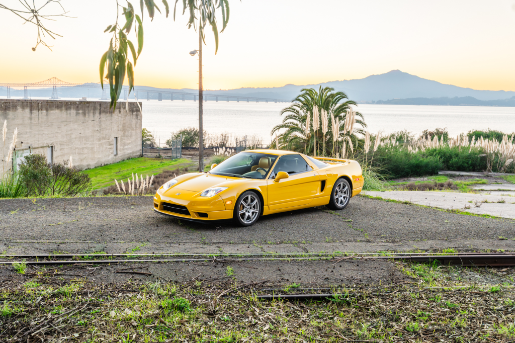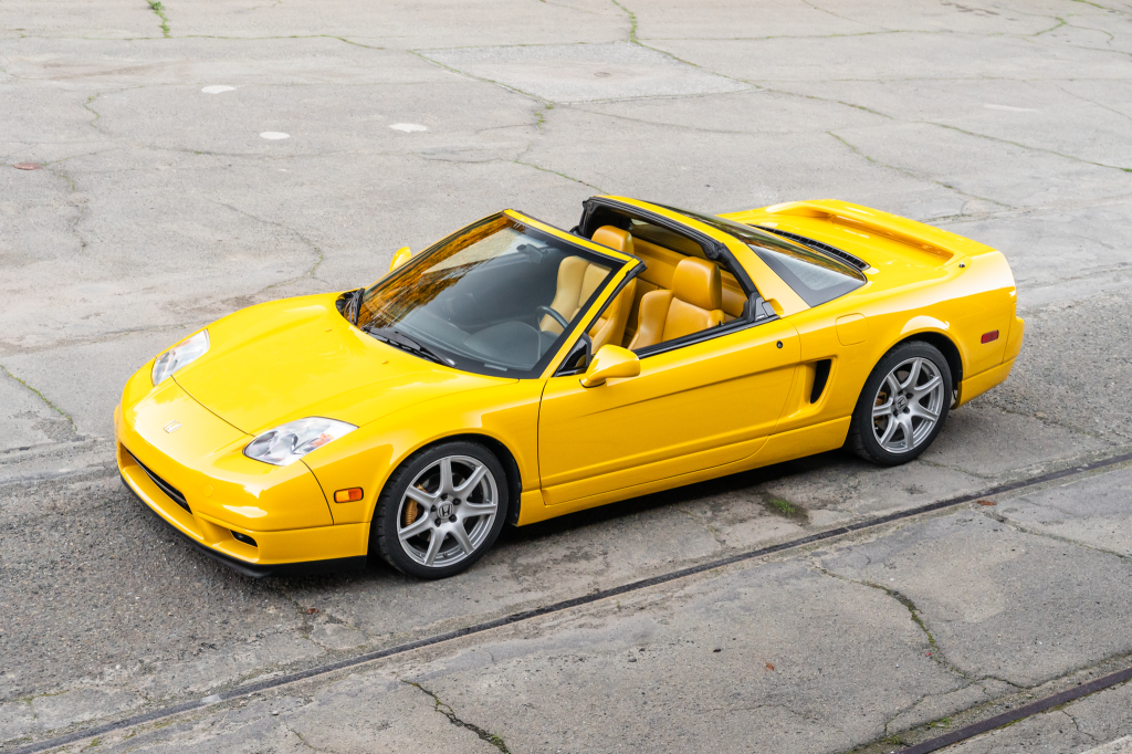 This 2002 Acura NSX-T is one of a reported 27 examples produced with Spa Yellow Pearl paint and Yellow leather upholstery, and it has been modified with a lightweight flywheel, Comptech headers, a Pride muffler, and Type-R suspension. Showing 60k miles, the car had been registered in Florida and Nevada prior to being relocated to California and purchased by its current owner in 2023. Power is provided by a 3.2-liter DOHC V6 paired with a six-speed manual transaxle, and additional equipment includes forged 17″ wheels, a limited-slip differential, a removable body-color roof panel, xenon headlights, power-adjustable seats, automatic climate control, cruise control, a Bose sound system, a cassette stereo, and a CD changer. Work under current ownership has included changing the oil and transmission fluid, flushing the brake fluid, and replacing the timing belt, water pump, VTEC seals, valve-cover gaskets, spark plugs, and more as detailed below. This NSX-T is offered on dealer consignment with owner’s manuals, a tool kit, service records, spare mats, a clean Carfax report, and a clean California title.