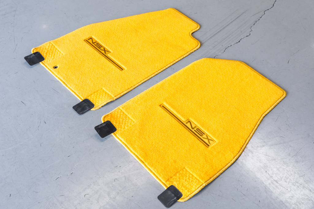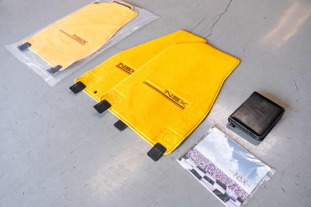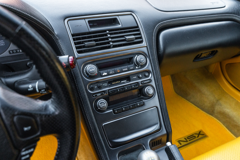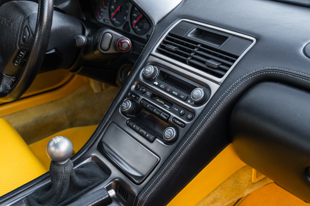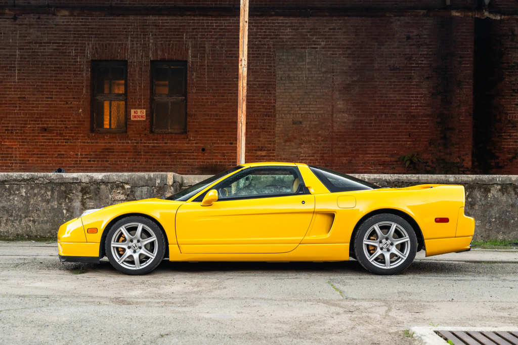 The NSX featured aluminum bodywork, and this example is finished in Spa Yellow Pearl with a body-color removable roof panel. Exterior details include xenon headlights, side air intakes, power-adjustable side mirrors, dual exhaust outlets, and an integrated rear wing with an LED brake light.