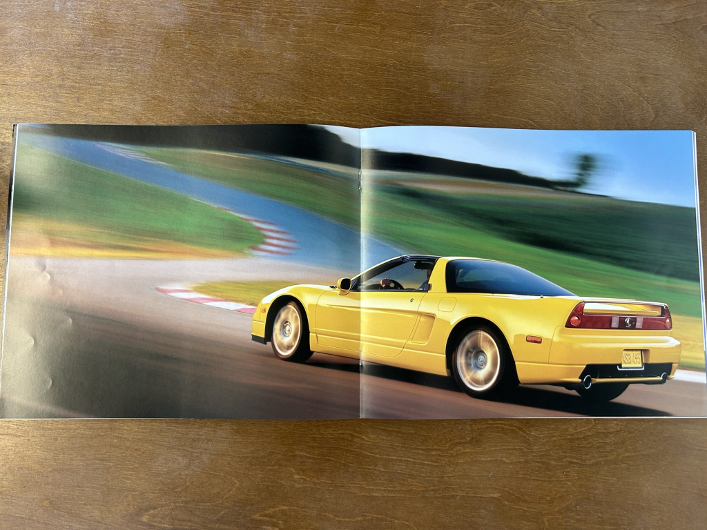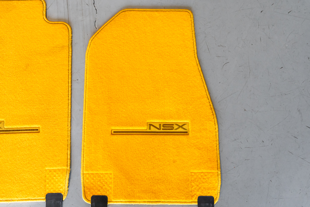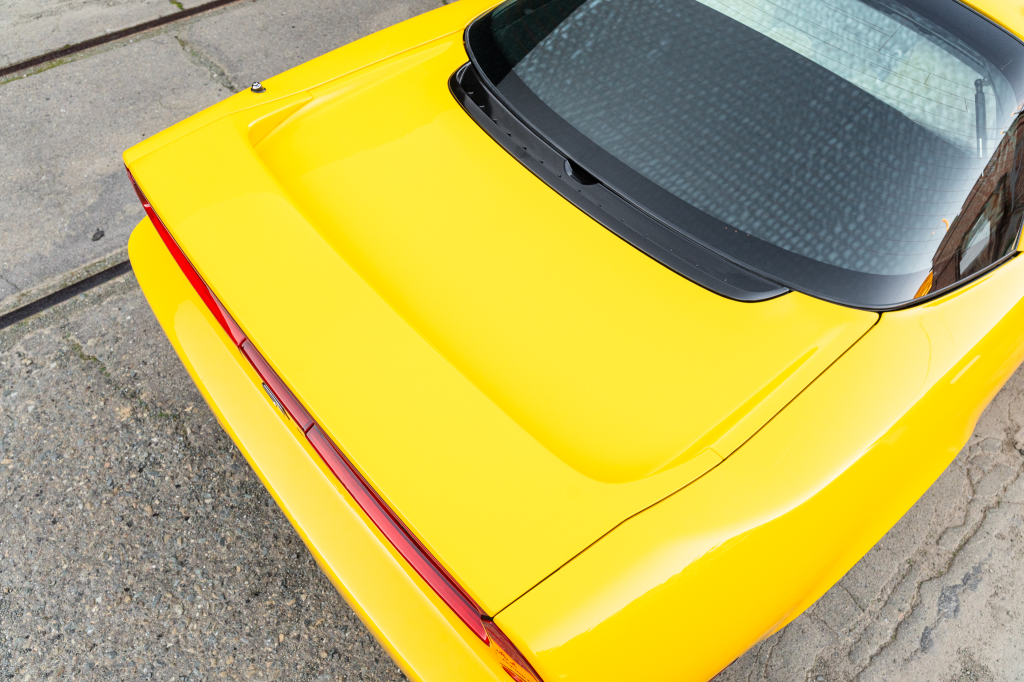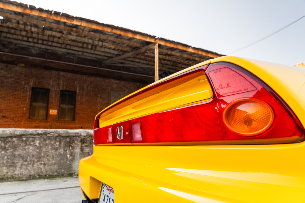 The NSX featured aluminum bodywork, and this example is finished in Spa Yellow Pearl with a body-color removable roof panel. Exterior details include xenon headlights, side air intakes, power-adjustable side mirrors, dual exhaust outlets, and an integrated rear wing with an LED brake light.
