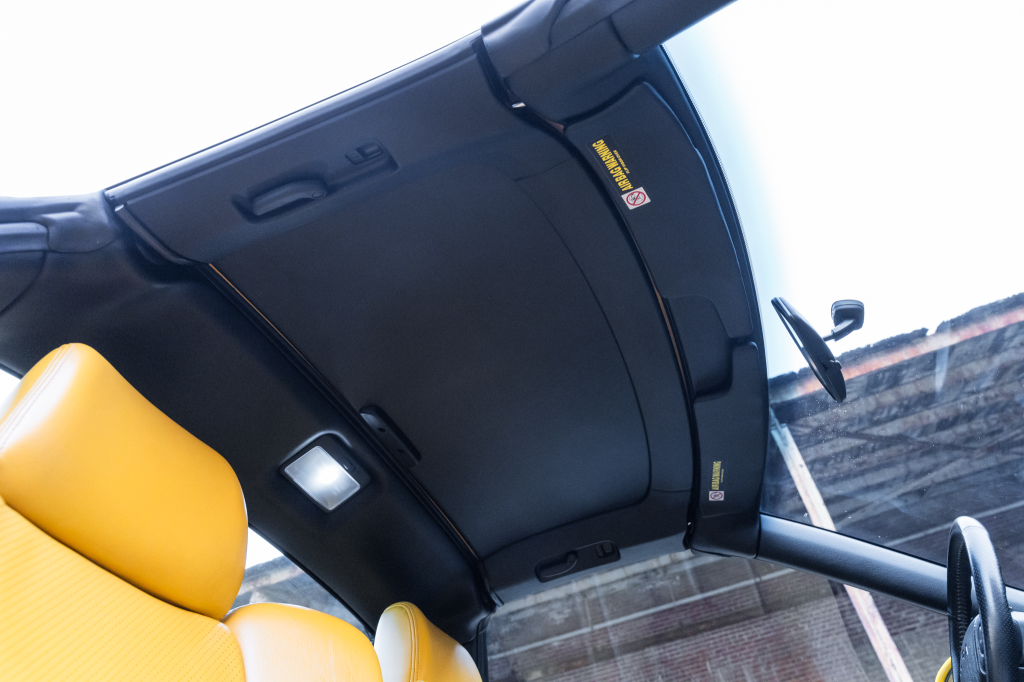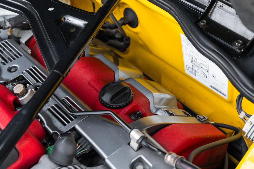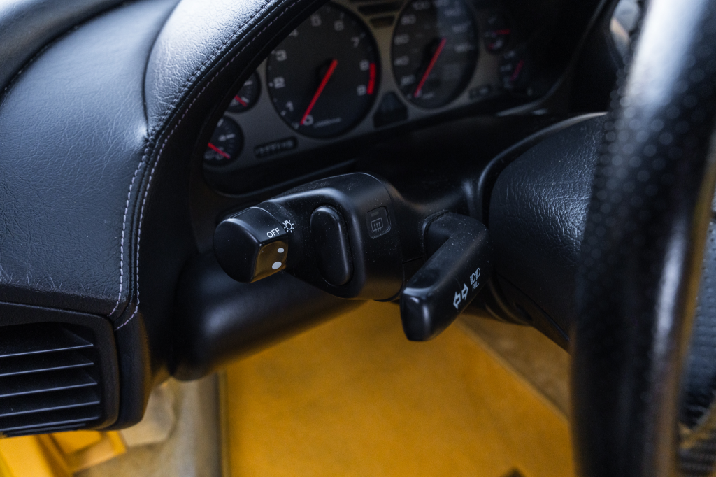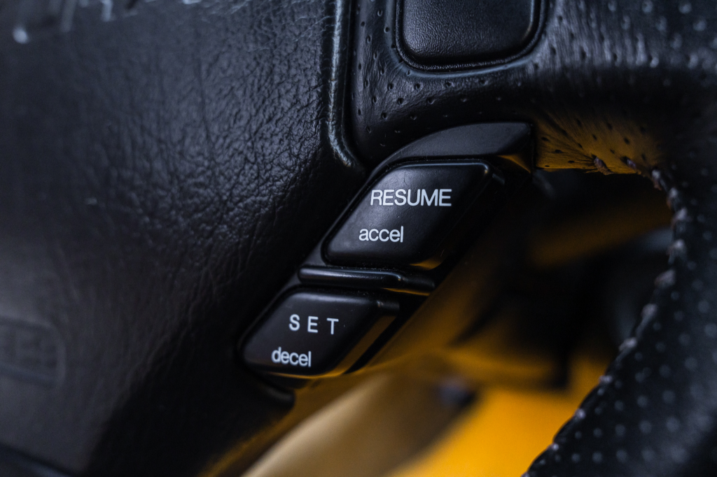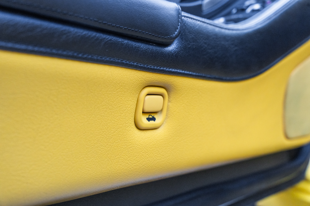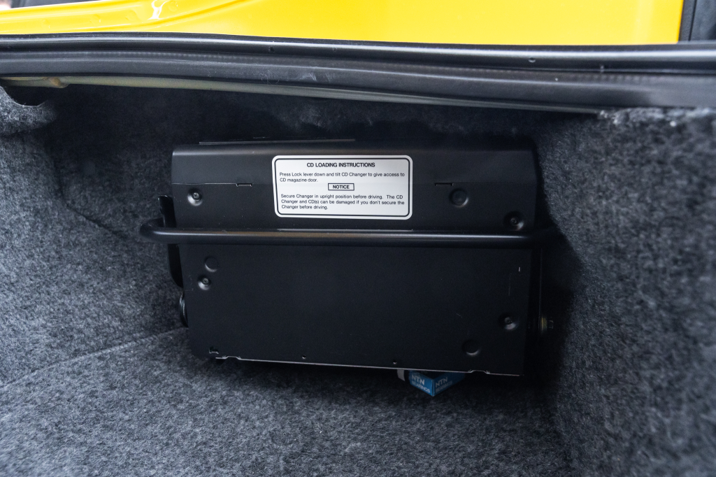 The power-adjustable sport seats are upholstered in Yellow leather, and additional appointments include automatic climate control, power windows and locks, cruise control, a titanium shift knob, a Bose sound system, and a cassette stereo linked to a six-disc CD changer. The stainless-steel door sill plates are stamped with the car’s serial number.