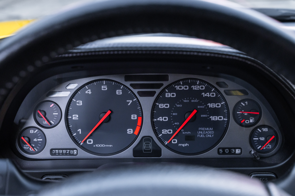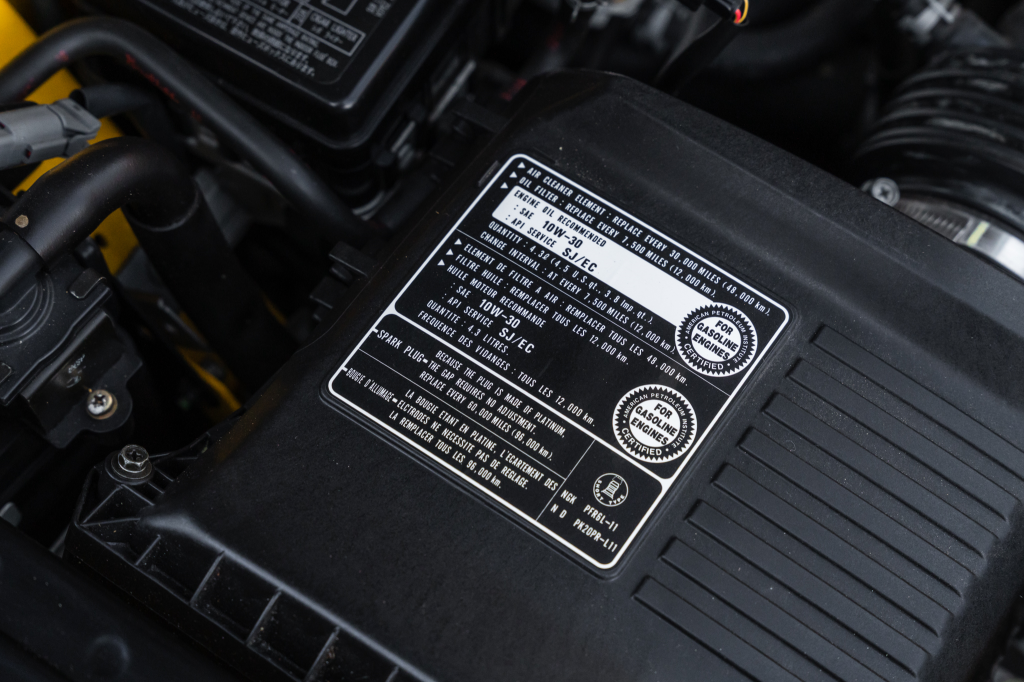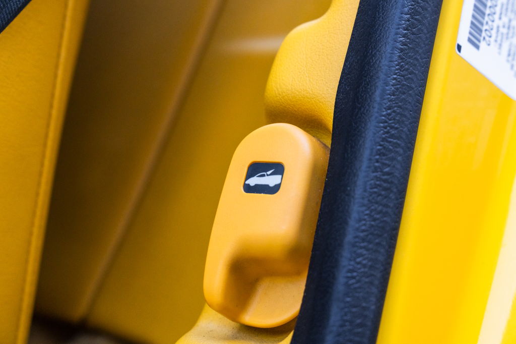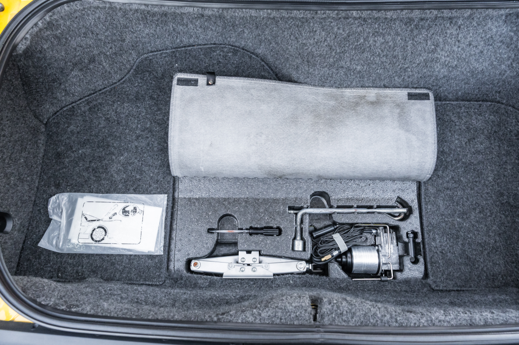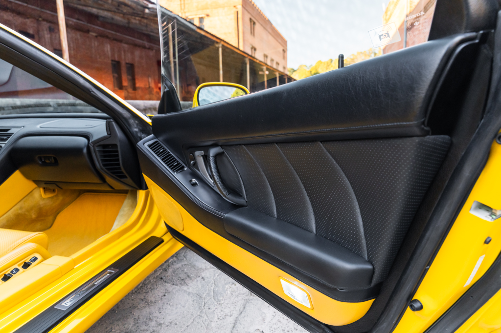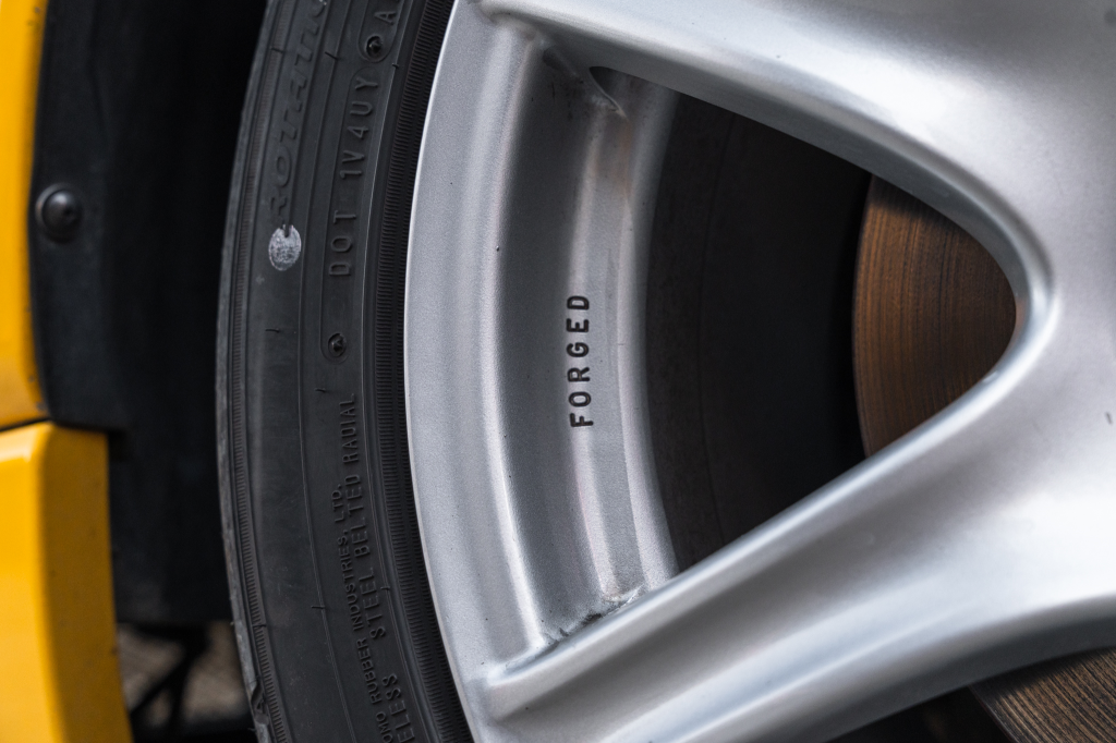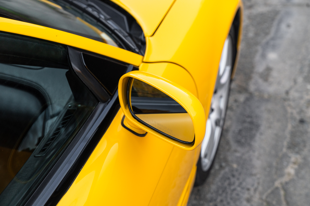 The power-adjustable sport seats are upholstered in Yellow leather, and additional appointments include automatic climate control, power windows and locks, cruise control, a titanium shift knob, a Bose sound system, and a cassette stereo linked to a six-disc CD changer. The stainless-steel door sill plates are stamped with the car’s serial number.