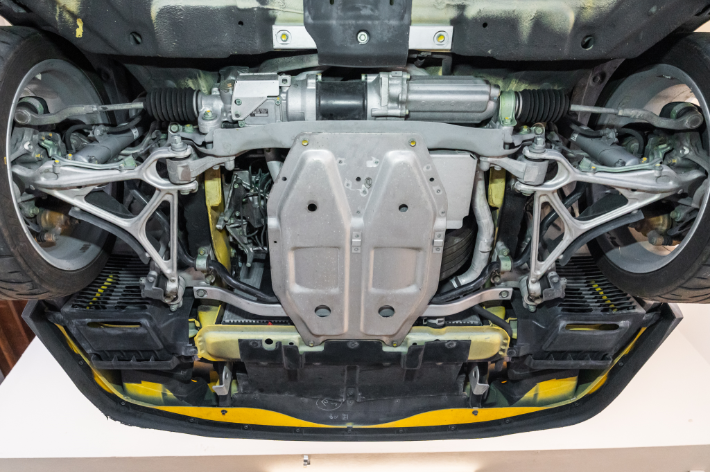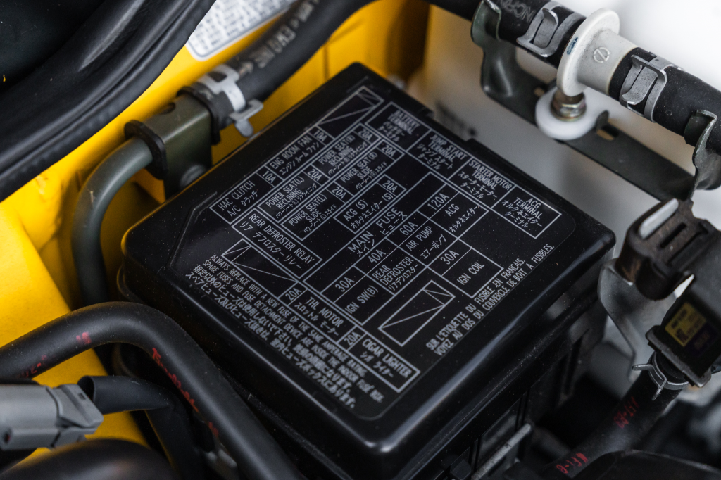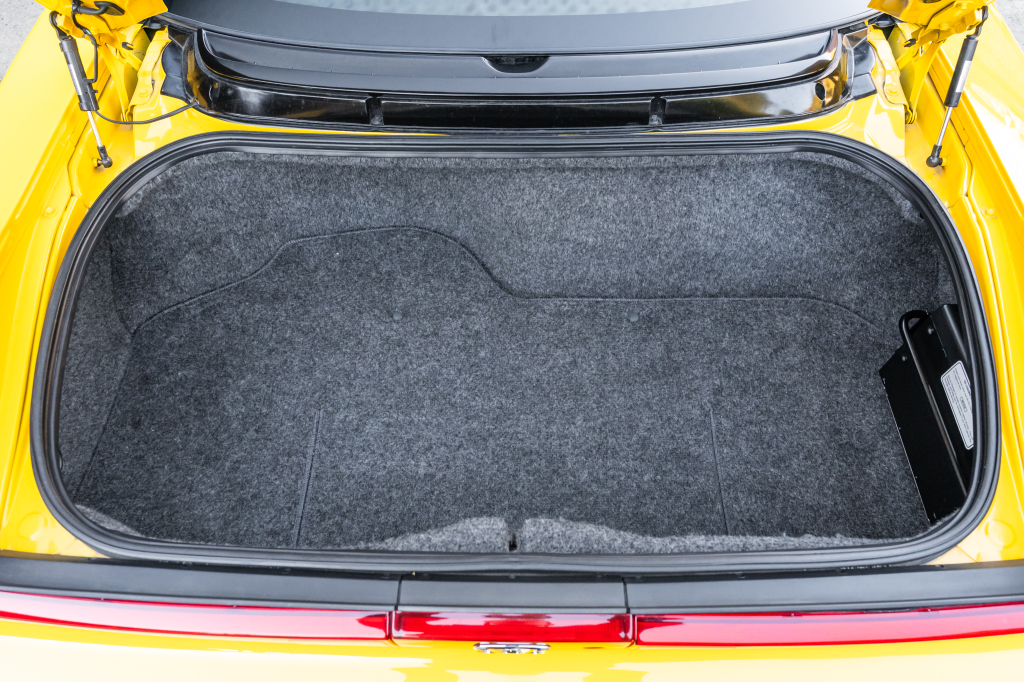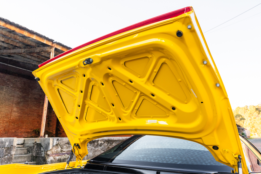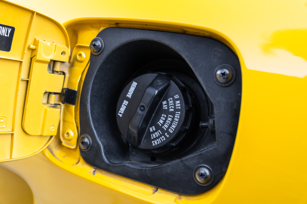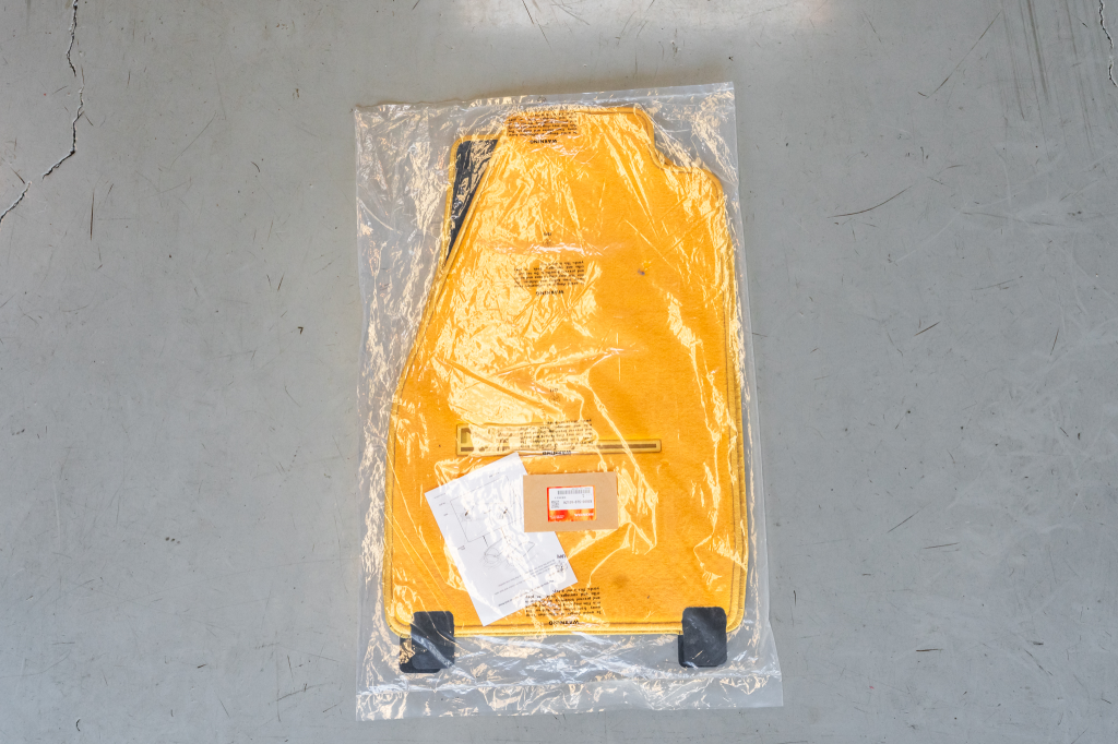 The power-adjustable sport seats are upholstered in Yellow leather, and additional appointments include automatic climate control, power windows and locks, cruise control, a titanium shift knob, a Bose sound system, and a cassette stereo linked to a six-disc CD changer. The stainless-steel door sill plates are stamped with the car’s serial number.