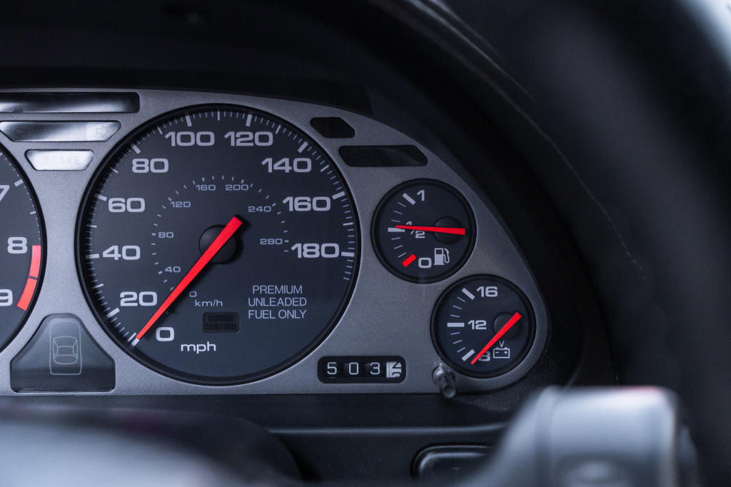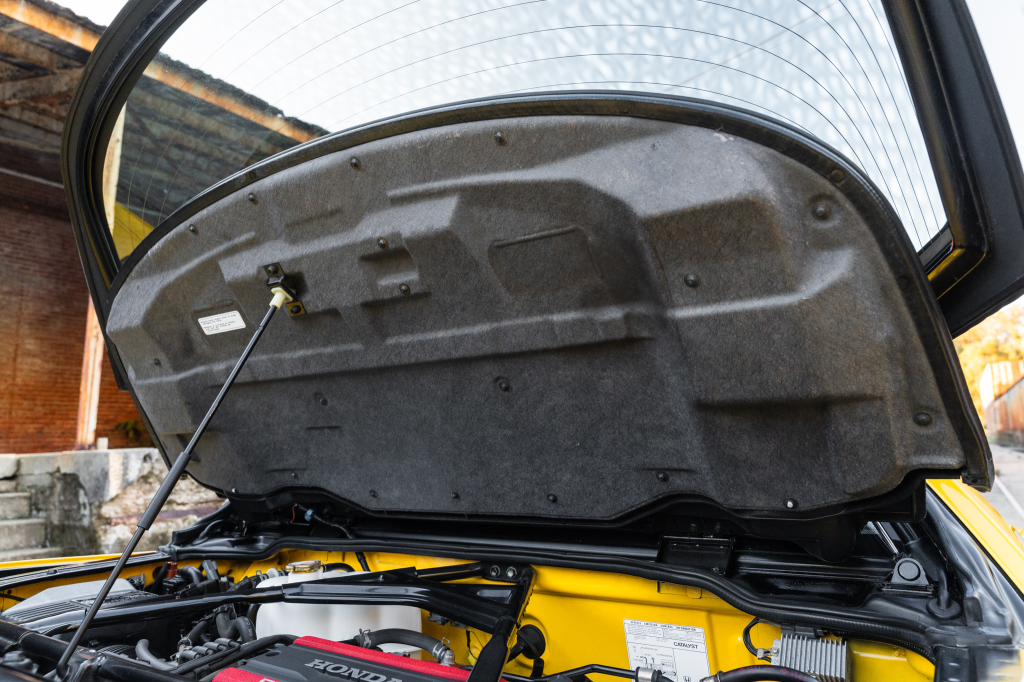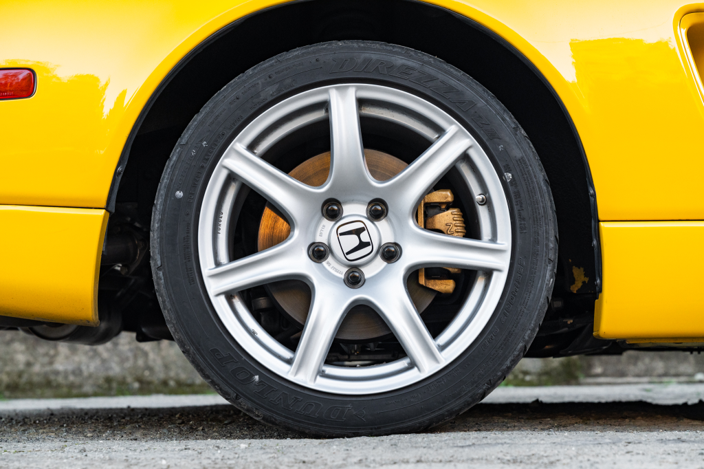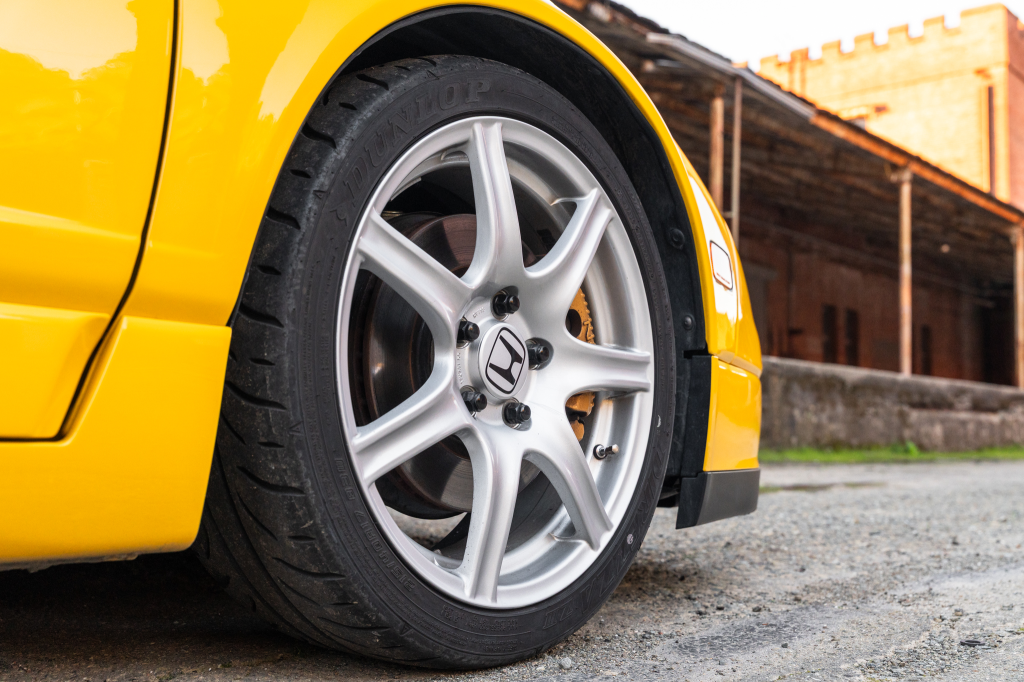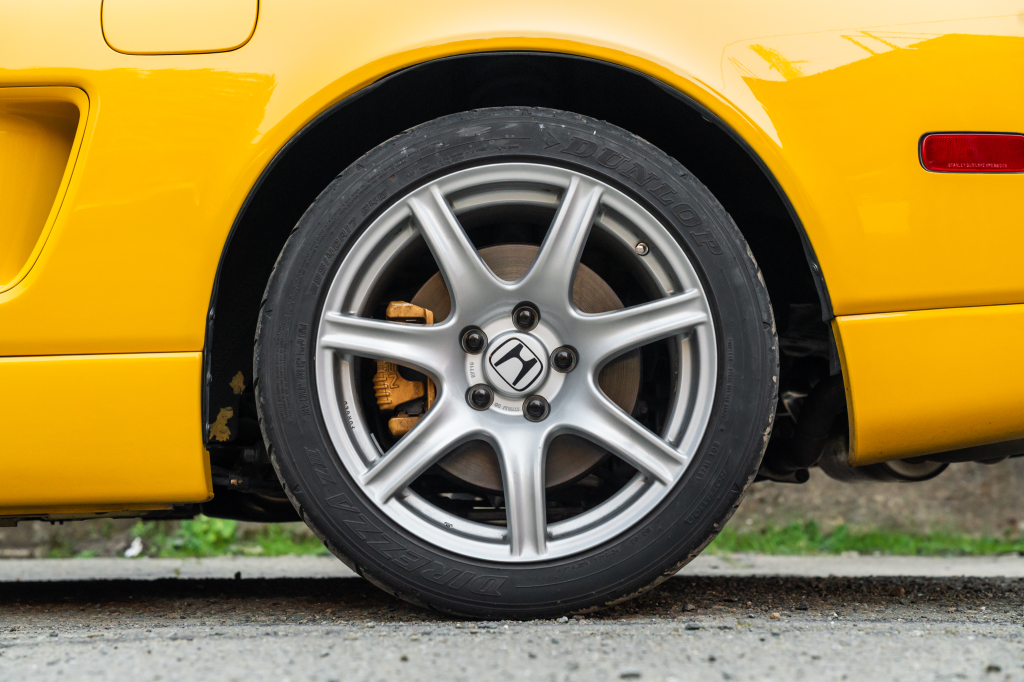 Silver-finished 17″ forged wheels are mounted with 215/40 front and 255/40 rear Dunlop Direzza Z III tires. Type-R suspension has been fitted, and braking is handled by an NSX-branded caliper and a ventilated rotor at each corner. The brake fluid was flushed in October 2024, and the rear pads are said to have been replaced under current ownership.