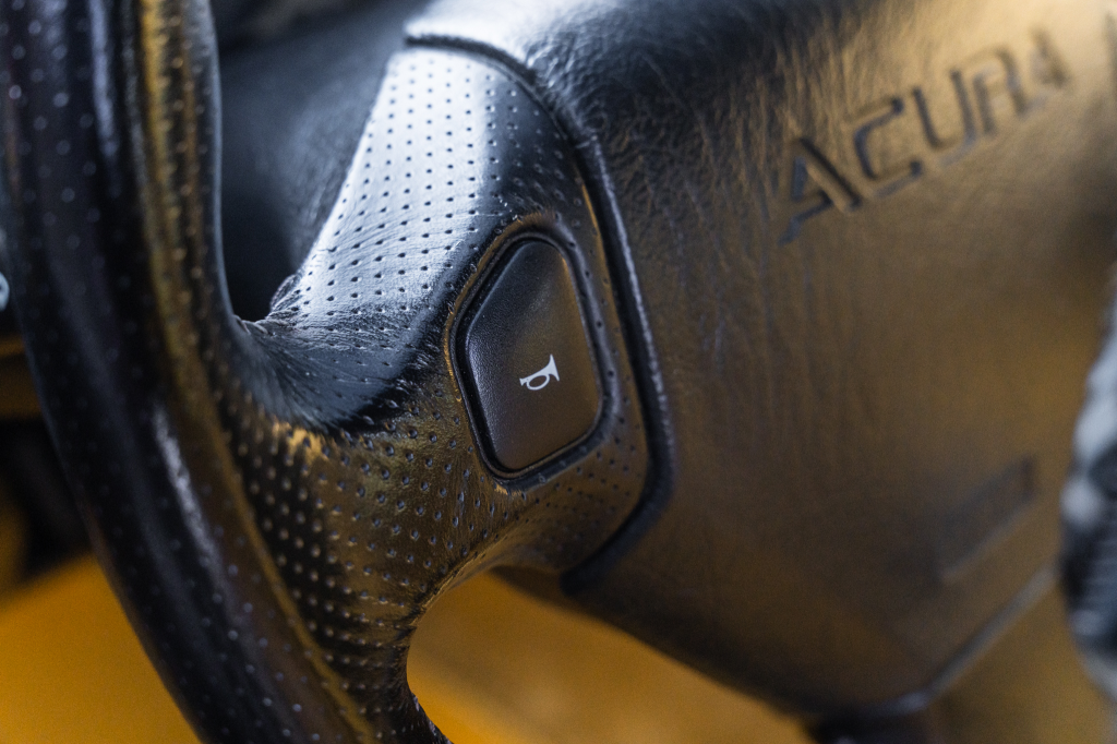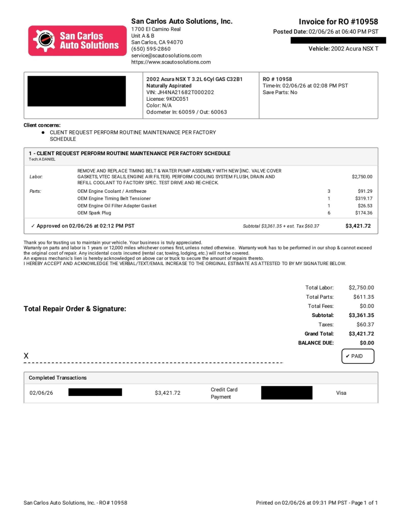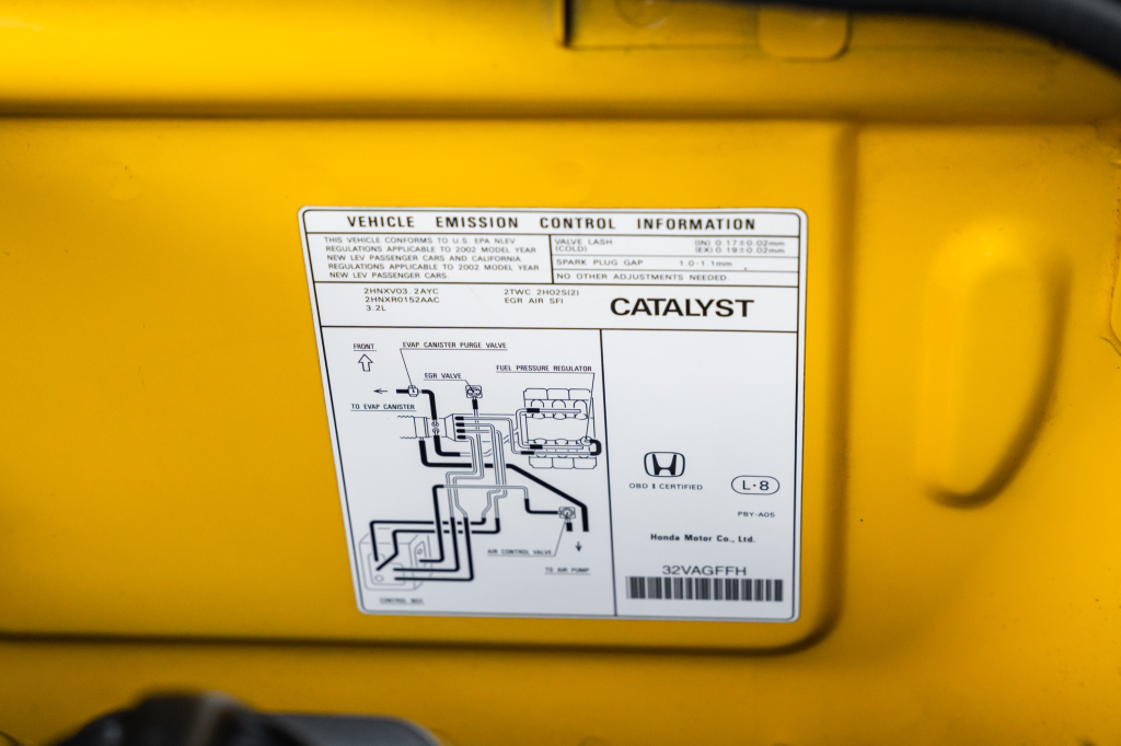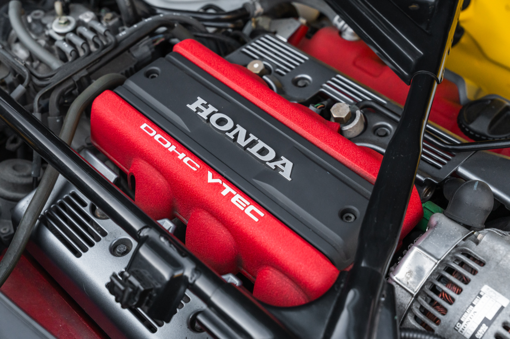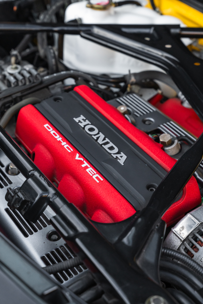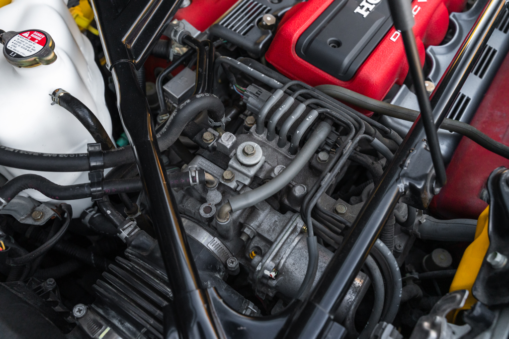 The 3.2-liter C32B V6 features dual overhead camshafts on each cylinder bank and utilizes VTEC variable valve timing. Factory-rated output was 290 horsepower and 224 lb-ft of torque. A Pride muffler and Comptech headers are in place, and a lightweight flywheel is said to have been installed. The coolant expansion tank was replaced in September 2024, and service in February 2026 included replacing the timing belt and tensioner along with the water pump, air filter, oil-filter adapter gasket, valve-cover gaskets, VTEC seals, and spark plugs.