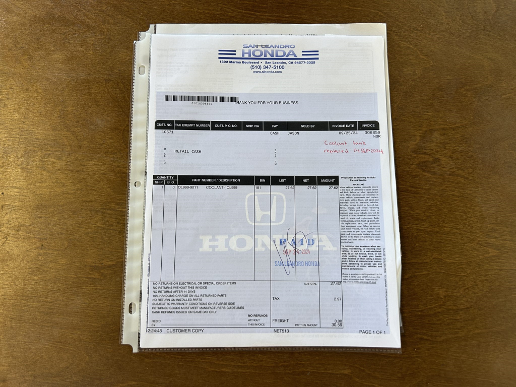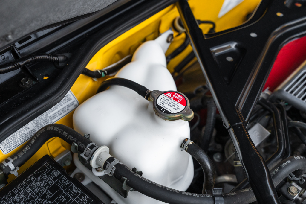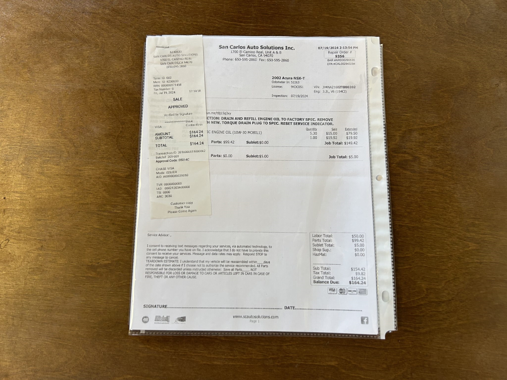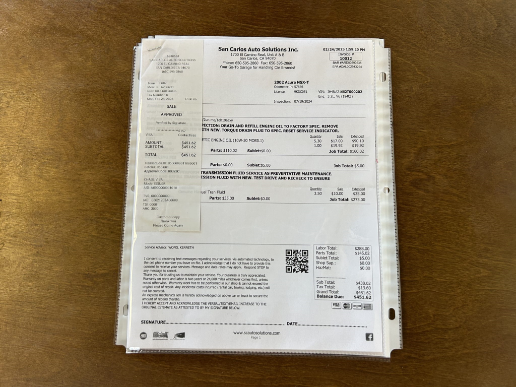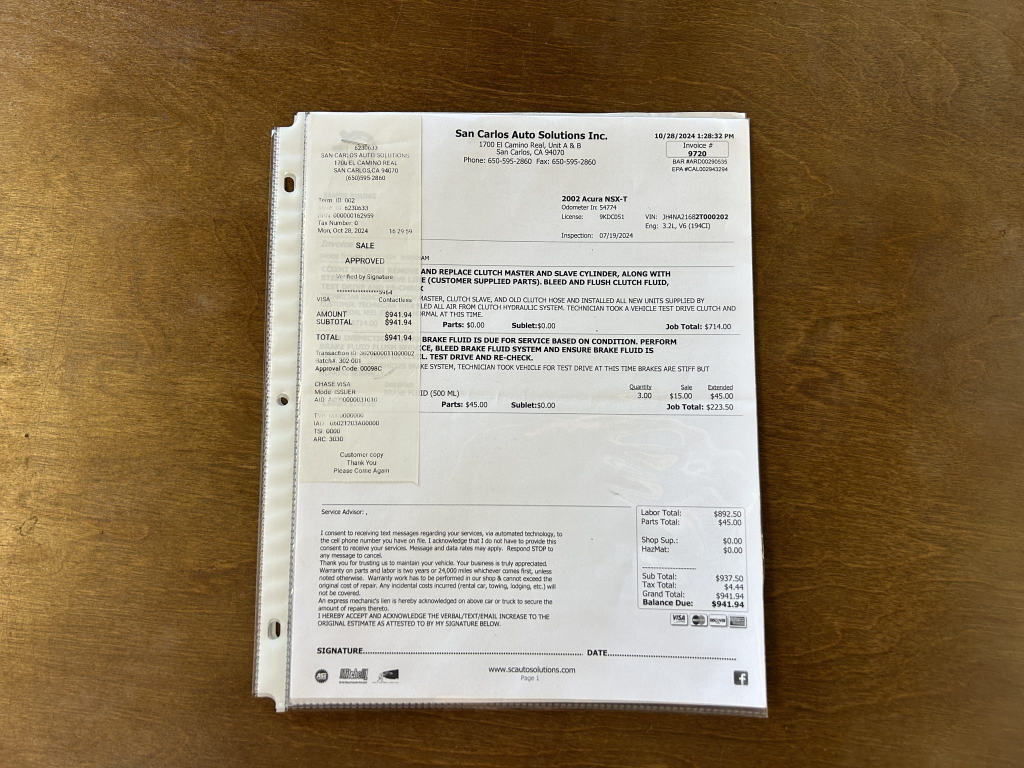 The 3.2-liter C32B V6 features dual overhead camshafts on each cylinder bank and utilizes VTEC variable valve timing. Factory-rated output was 290 horsepower and 224 lb-ft of torque. A Pride muffler and Comptech headers are in place, and a lightweight flywheel is said to have been installed. The coolant expansion tank was replaced in September 2024, and service in February 2026 included replacing the timing belt and tensioner along with the water pump, air filter, oil-filter adapter gasket, valve-cover gaskets, VTEC seals, and spark plugs.