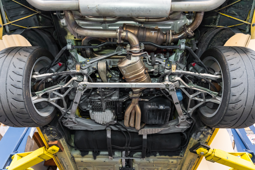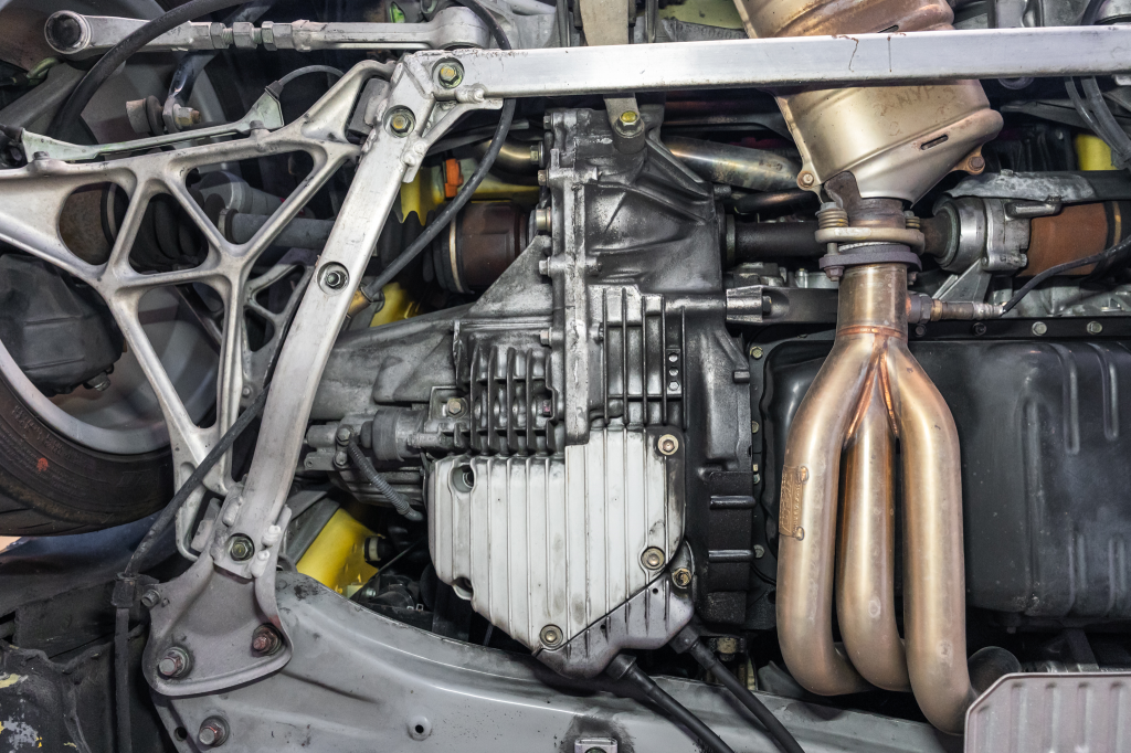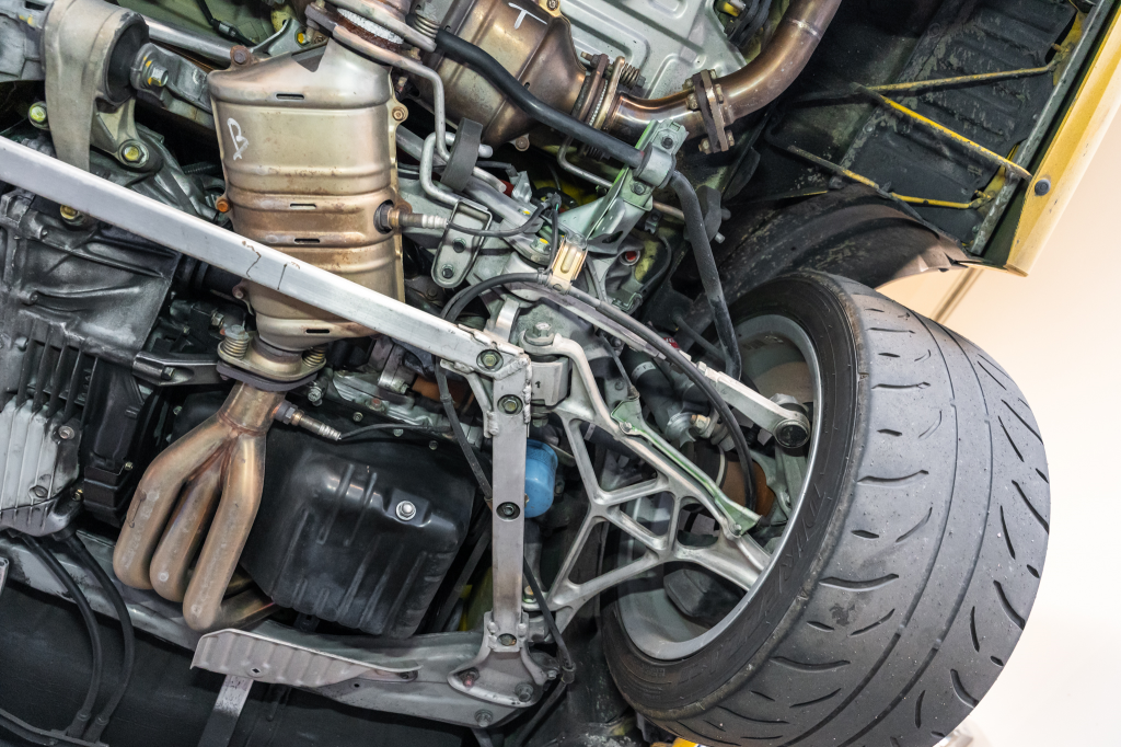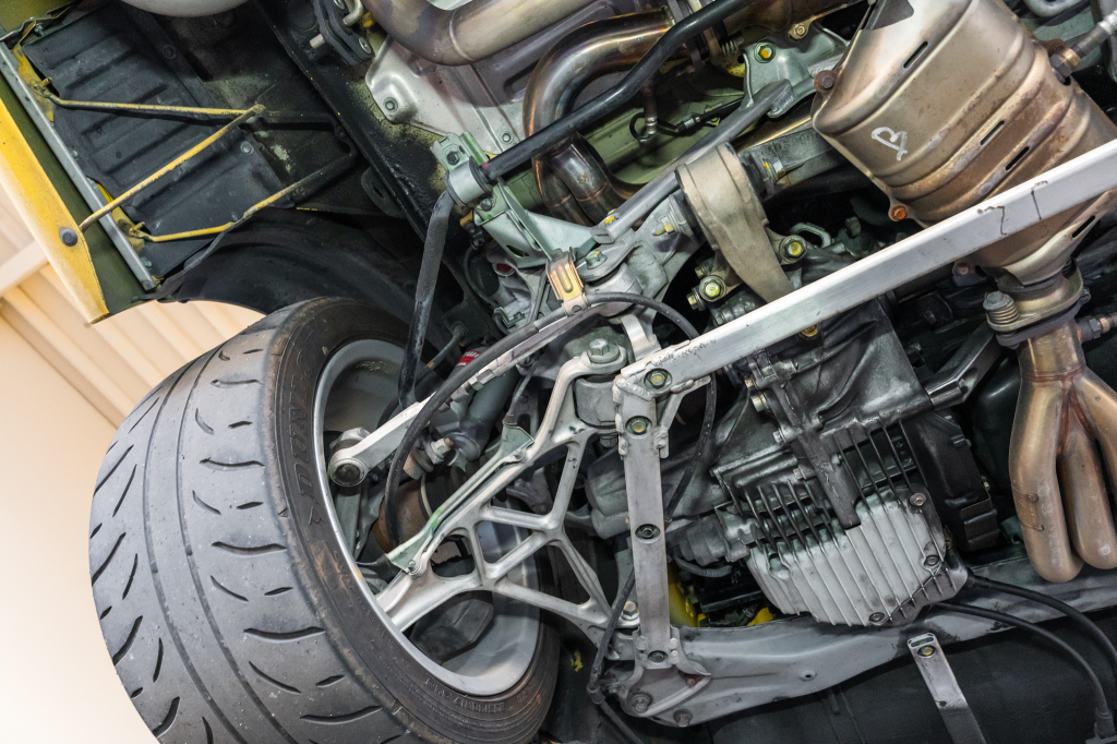 Power is routed to the rear wheels via a six-speed manual transaxle and a limited-slip differential. Replacement clutch hydraulic cylinders and a stainless-steel line were fitted in October 2024, and the transmission fluid was changed the following February.