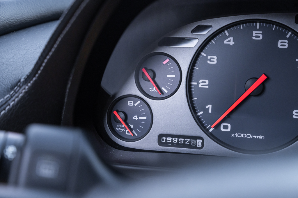 The leather-wrapped steering wheel frames a tachometer with an 8k-rpm redline, a 188-mph speedometer, and gauges for coolant temperature, oil pressure, voltage, and fuel level. The six-digit odometer shows 60k miles, approximately 14k of which were added under current ownership.