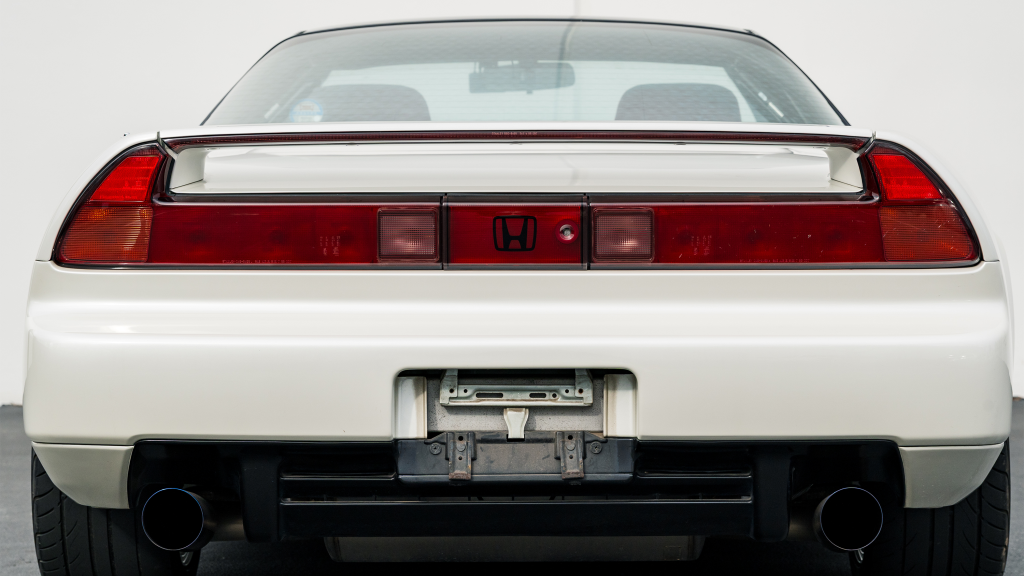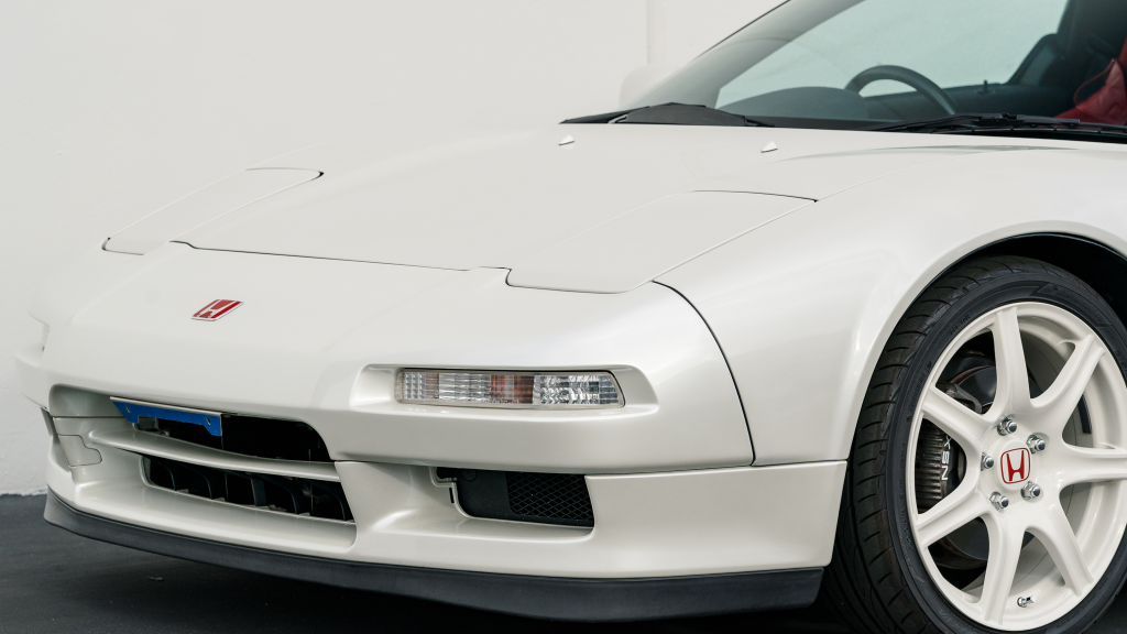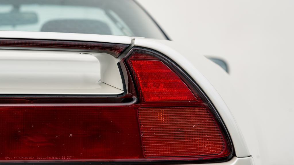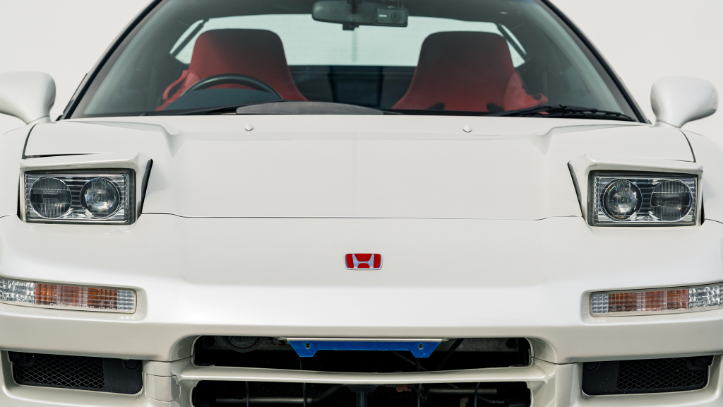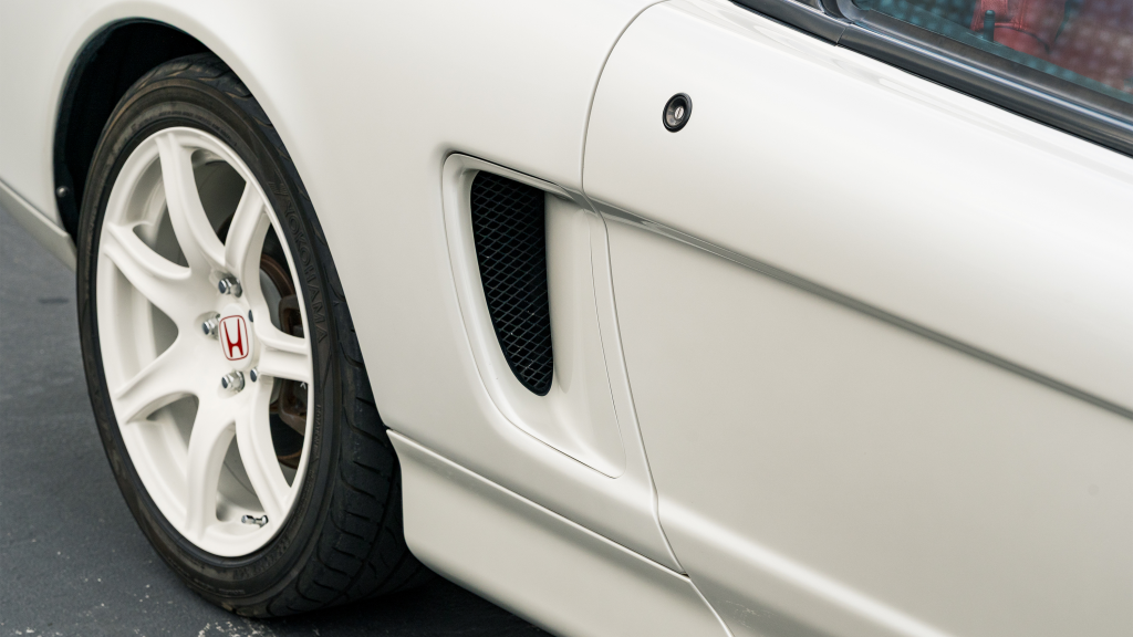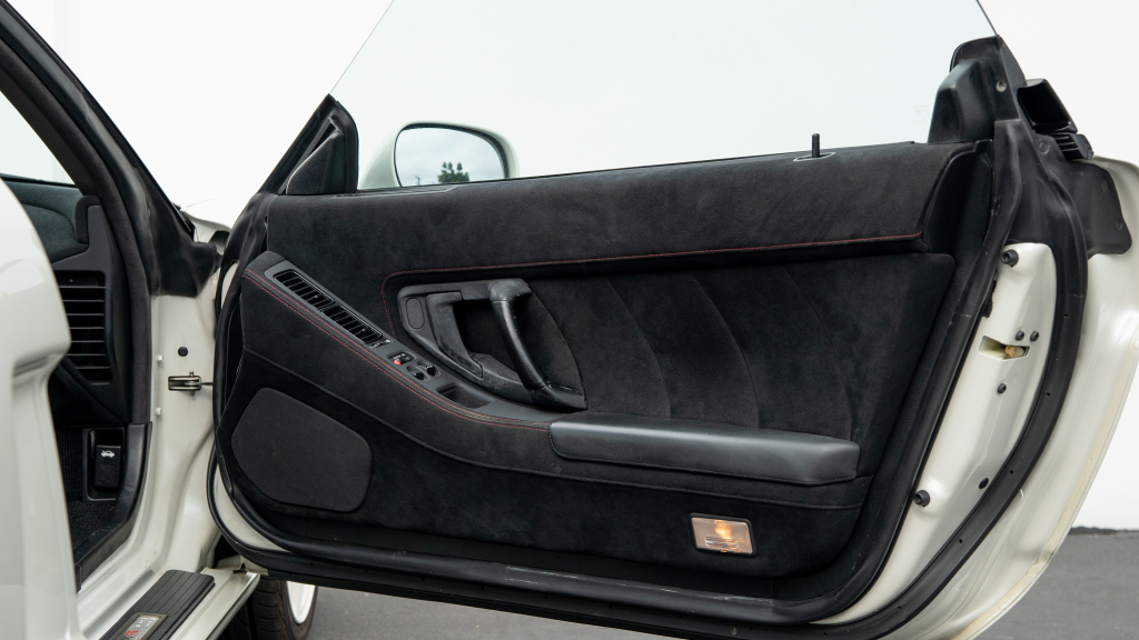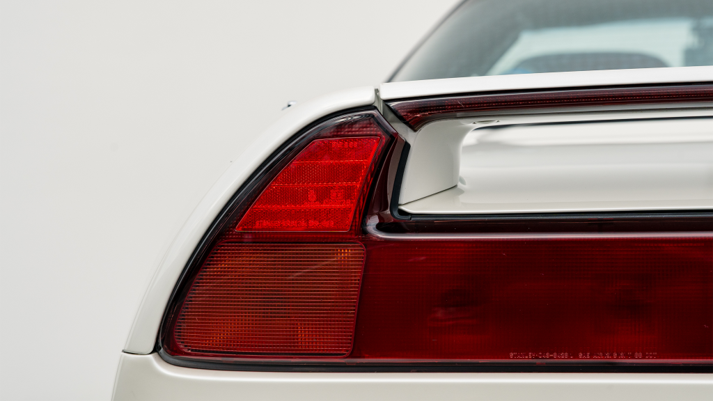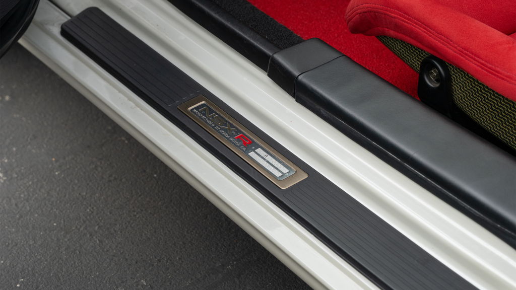 The Type R variant of the NSX was introduced in 1992 as a track-oriented offering exclusively for the Japanese market with several amenities eliminated in favor of a claimed weight savings of approximately 265 pounds. This example is finished in Neutron White Pearl (NH-545P) with a black roof panel. Exterior features distinct to the NSX-R model include a red Honda nose badge as well as mesh grilles integrated into the front air inlets.