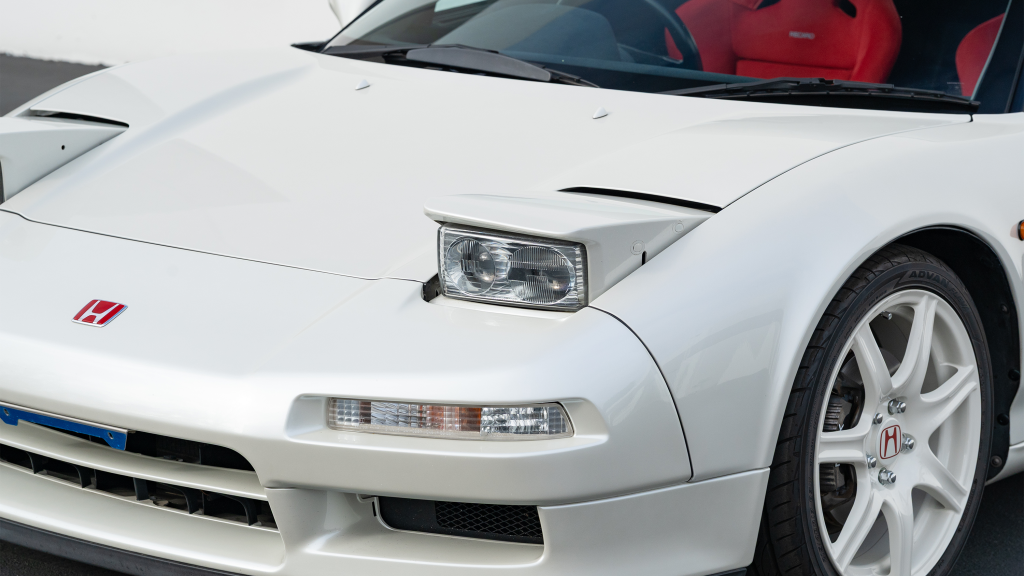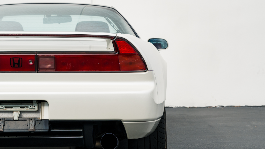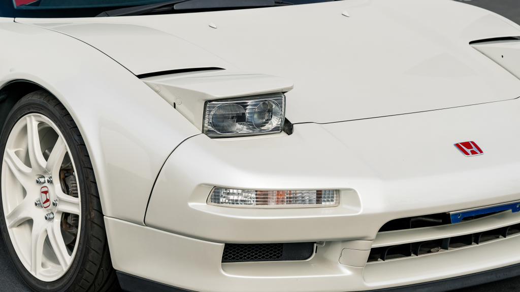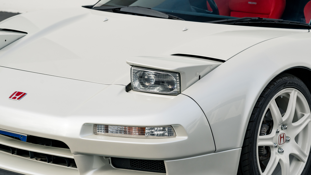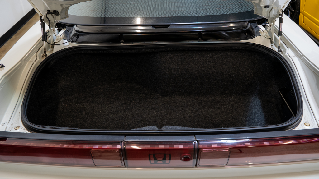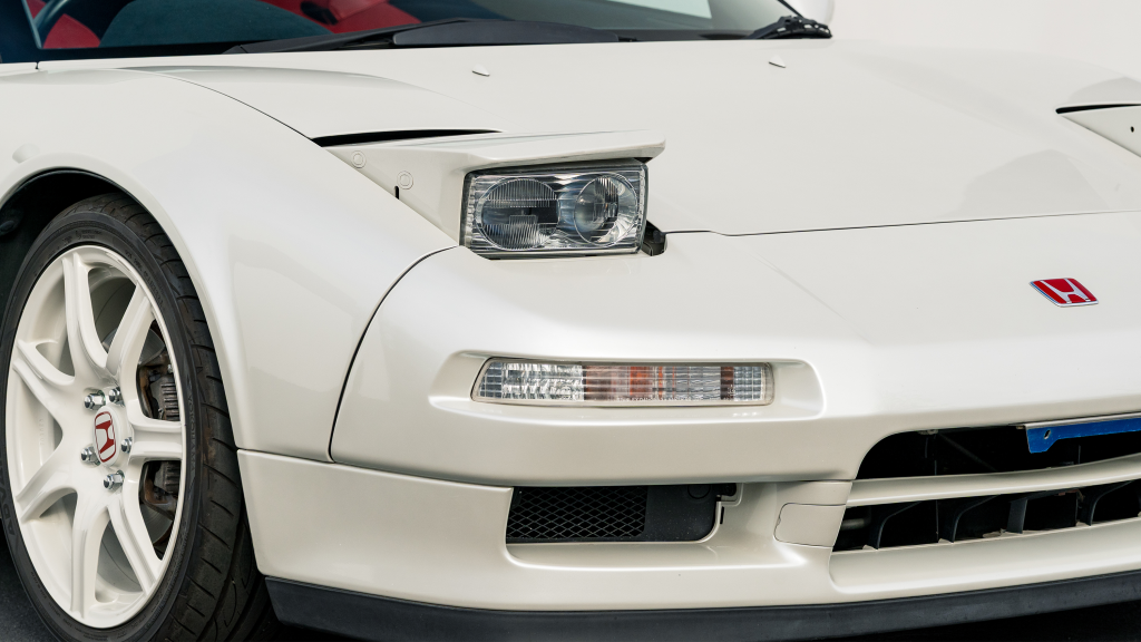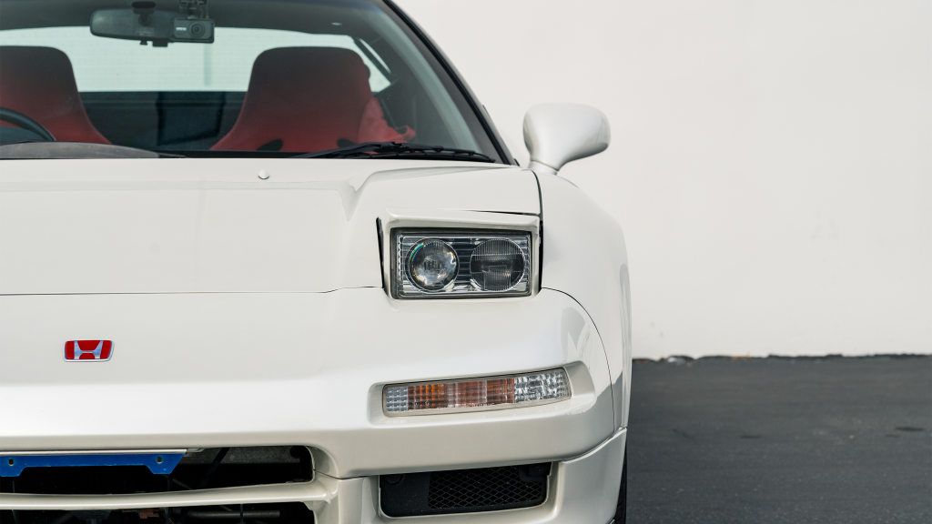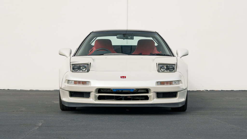 The Type R variant of the NSX was introduced in 1992 as a track-oriented offering exclusively for the Japanese market with several amenities eliminated in favor of a claimed weight savings of approximately 265 pounds. This example is finished in Neutron White Pearl (NH-545P) with a black roof panel. Exterior features distinct to the NSX-R model include a red Honda nose badge as well as mesh grilles integrated into the front air inlets.