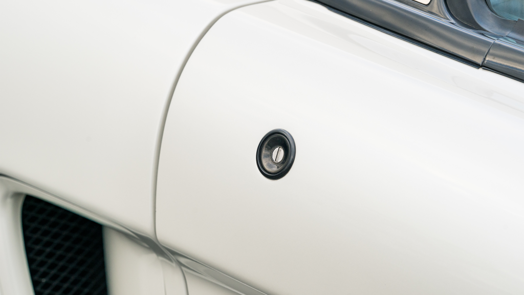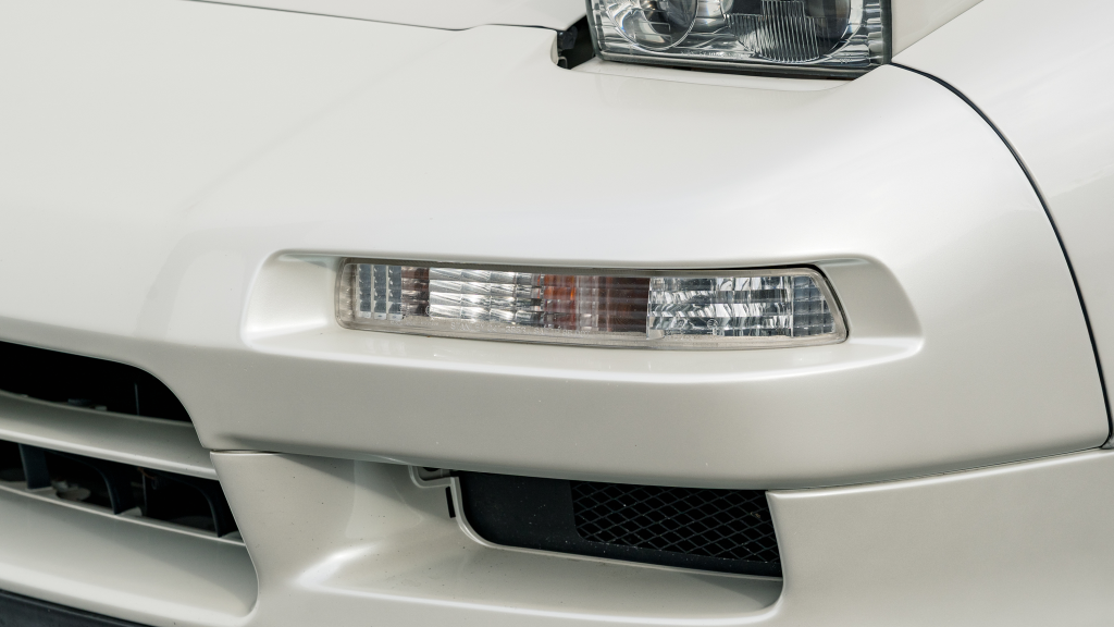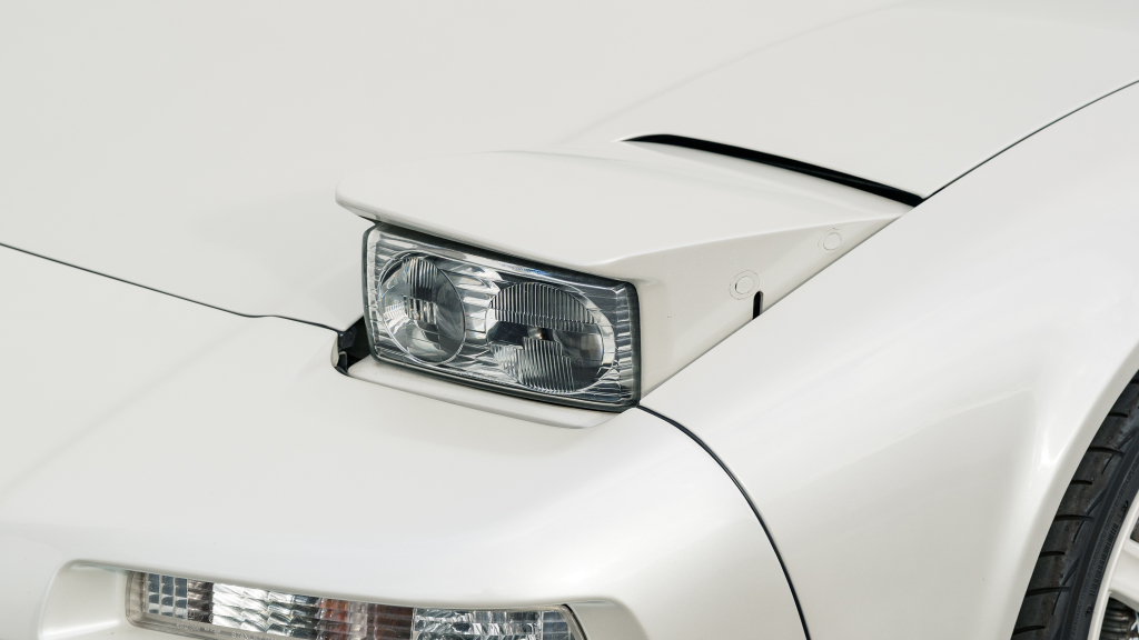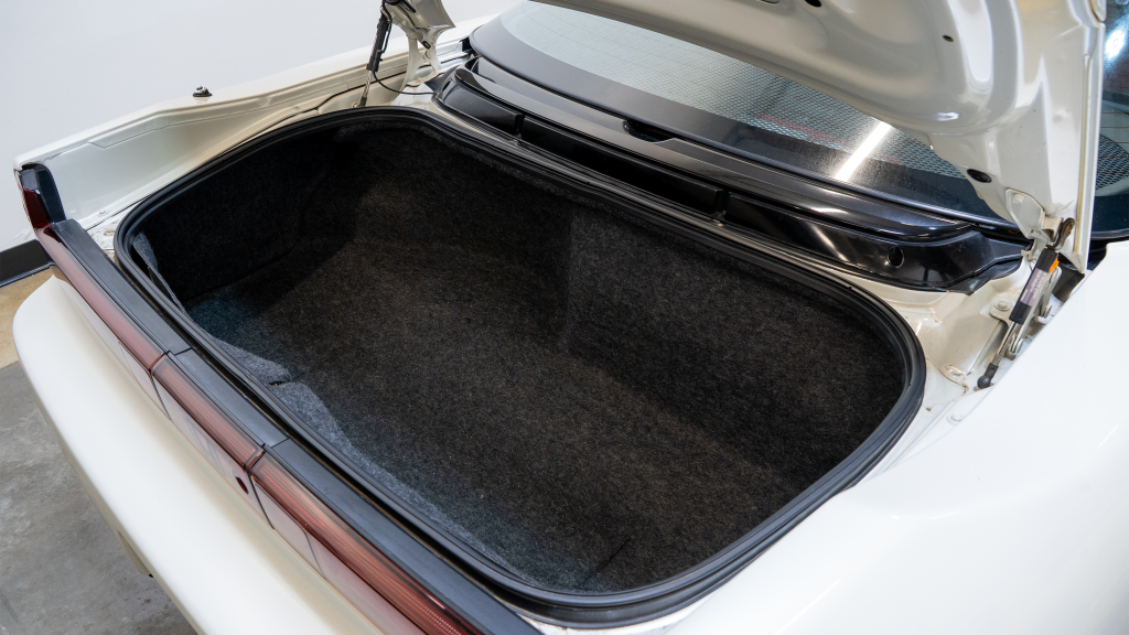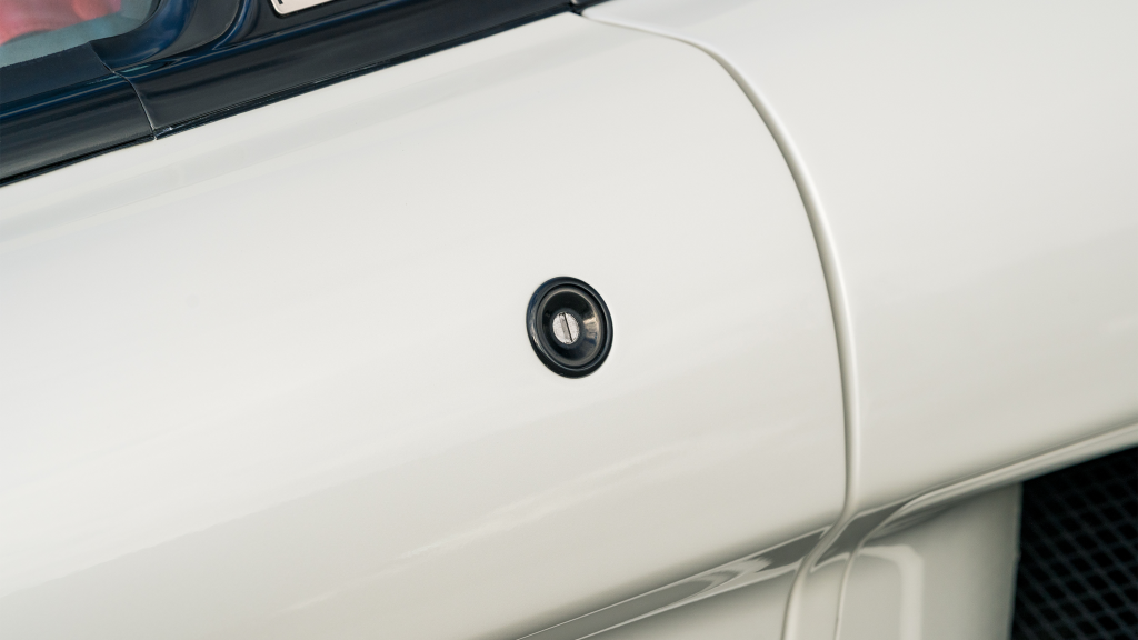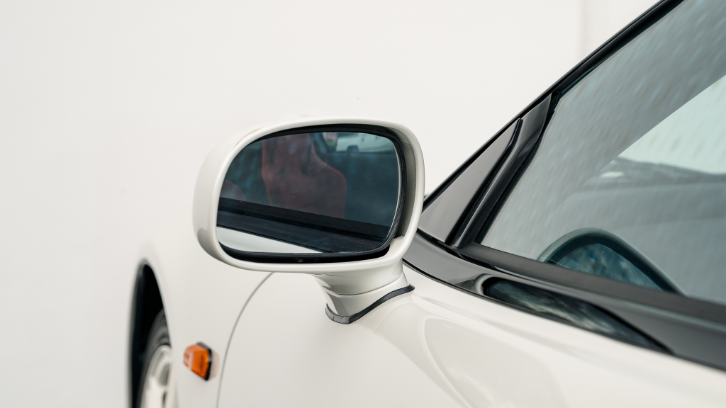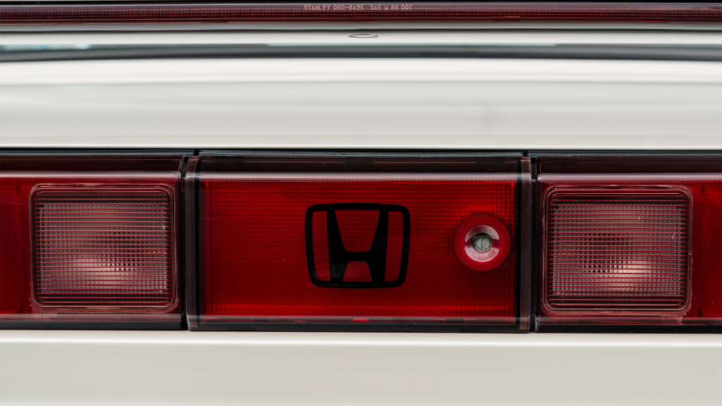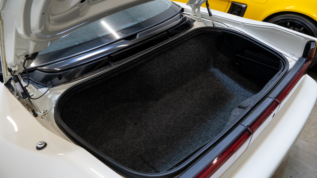 The Type R variant of the NSX was introduced in 1992 as a track-oriented offering exclusively for the Japanese market with several amenities eliminated in favor of a claimed weight savings of approximately 265 pounds. This example is finished in Neutron White Pearl (NH-545P) with a black roof panel. Exterior features distinct to the NSX-R model include a red Honda nose badge as well as mesh grilles integrated into the front air inlets.