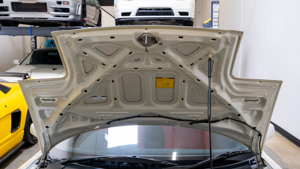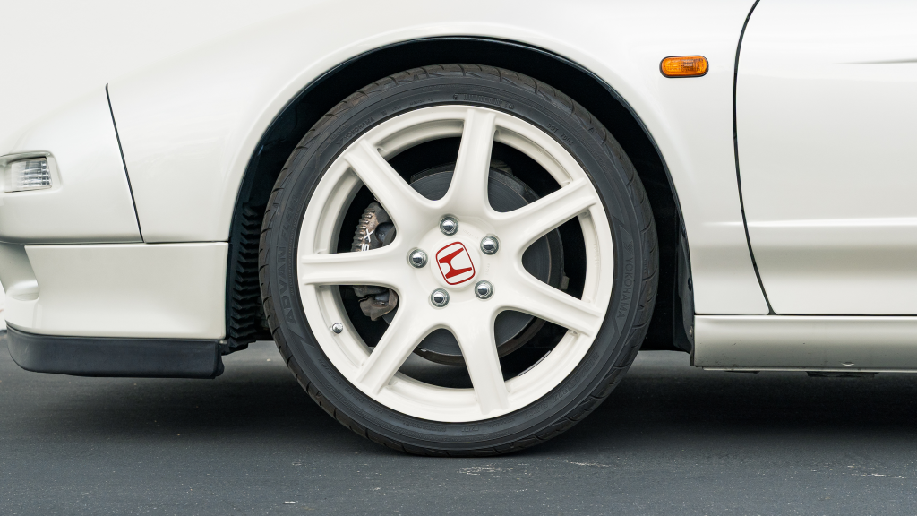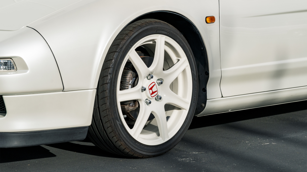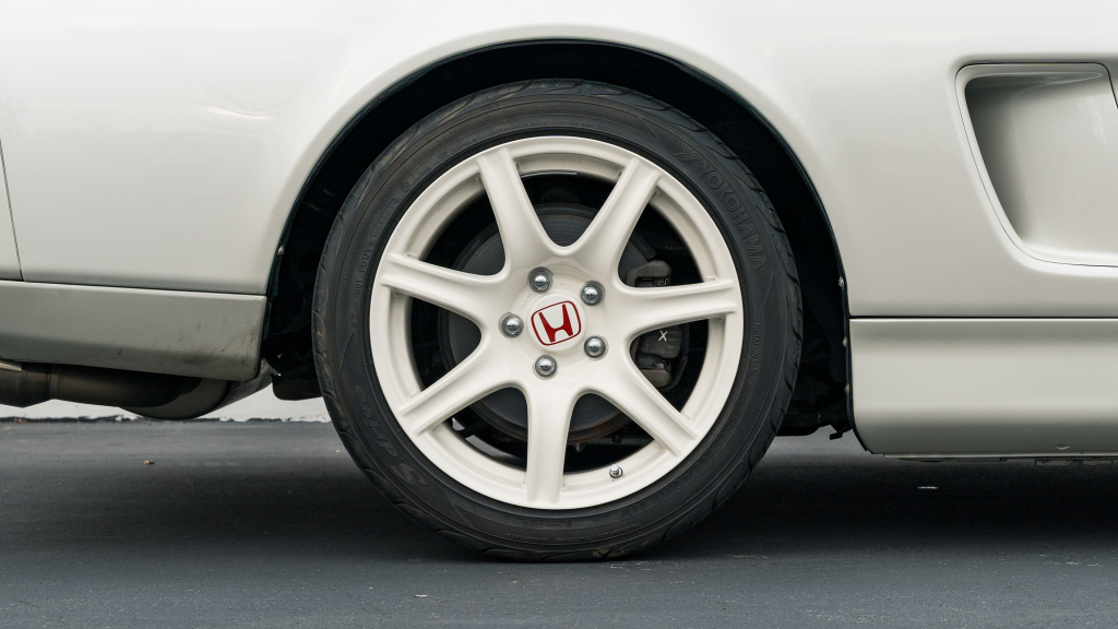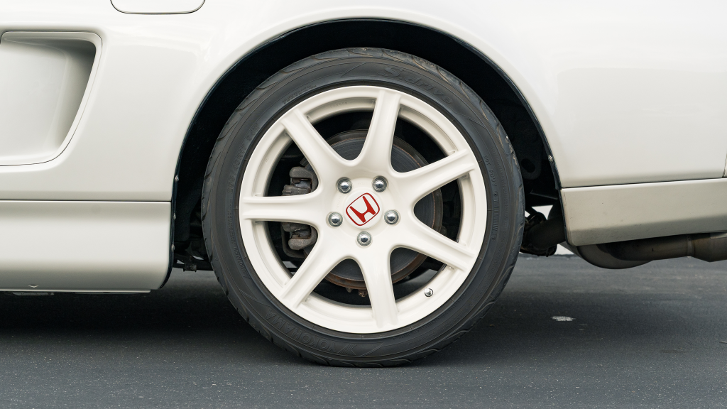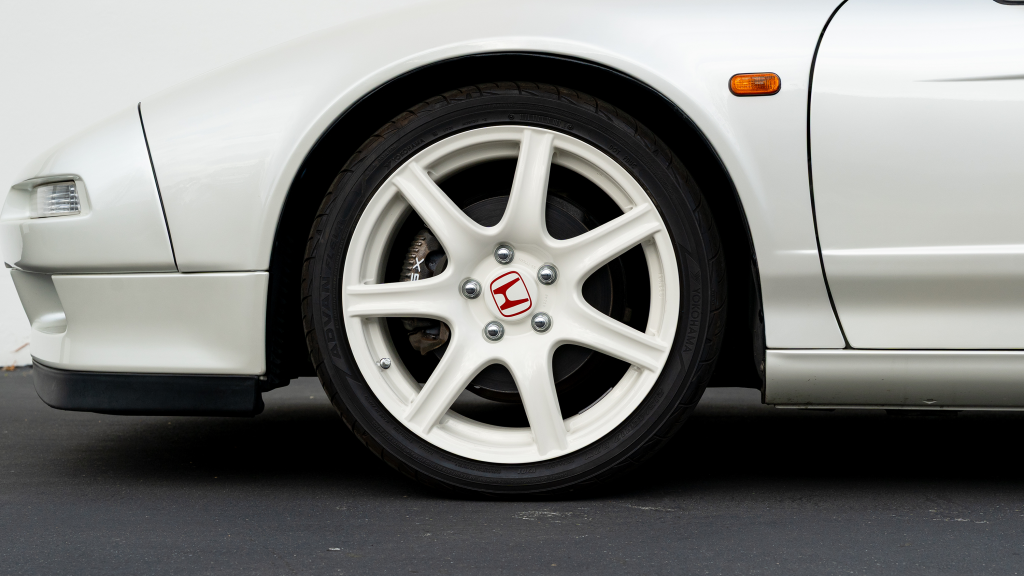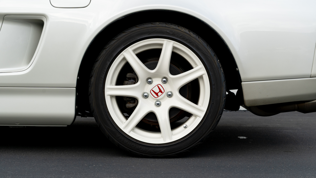 White-painted forged alloy wheels measure 17×7” up front and 17×9” at the rear and are wrapped in Yokohama S-drive and Advan Fleva tires. The NSX-R was equipped with a performance-focused suspension setup that included stiffer springs, shocks, and sway bars as well as reversed spring bias and two front chassis braces. Power assistance was eliminated from the steering system for Type R examples, which were also built without traction control. Braking is handled by ventilated discs with four-channel ABS.