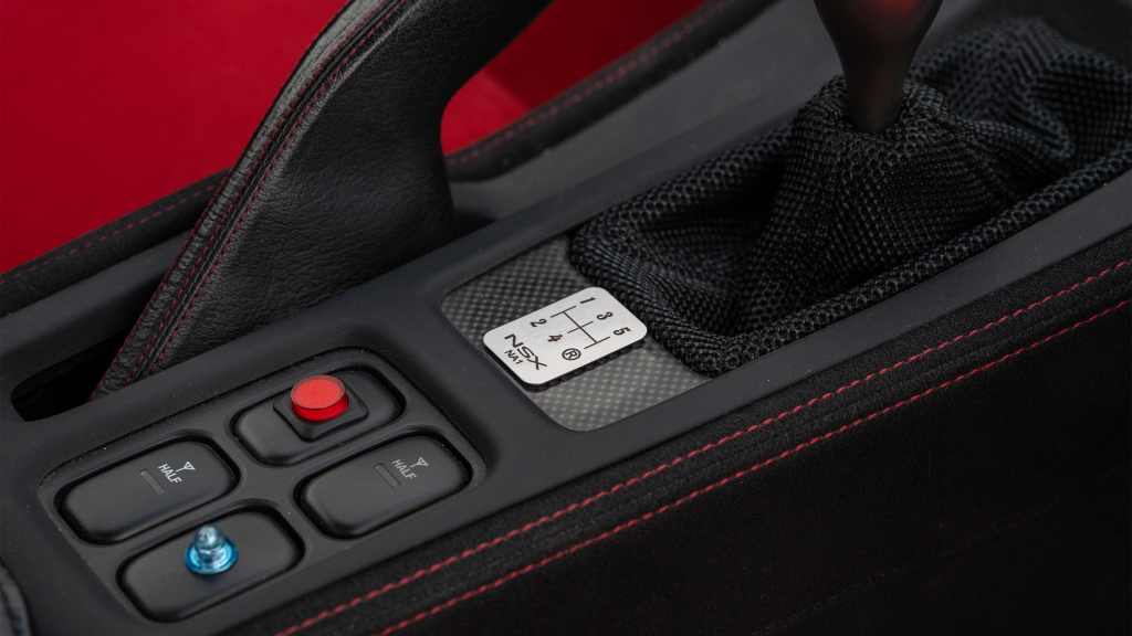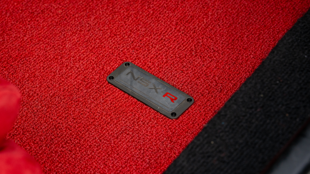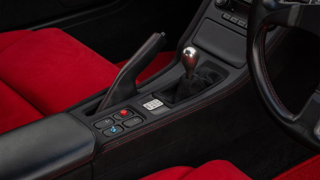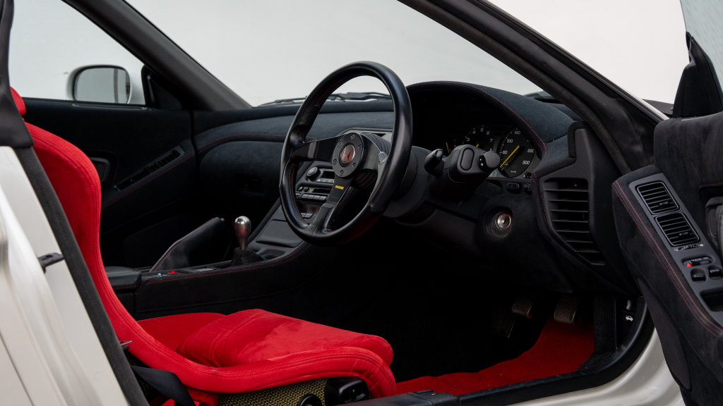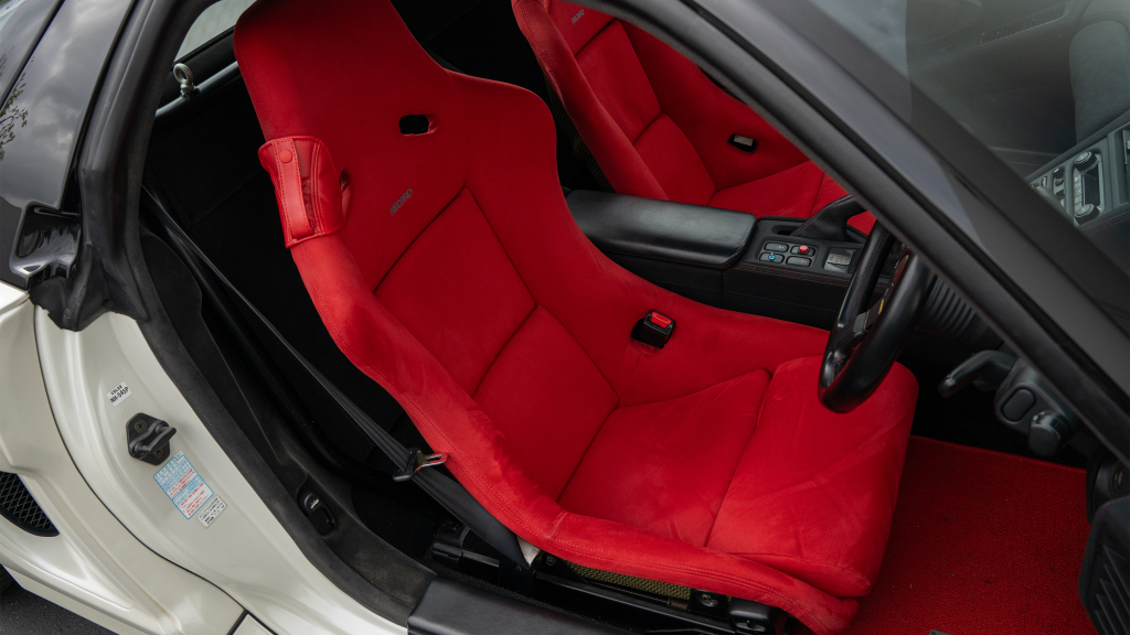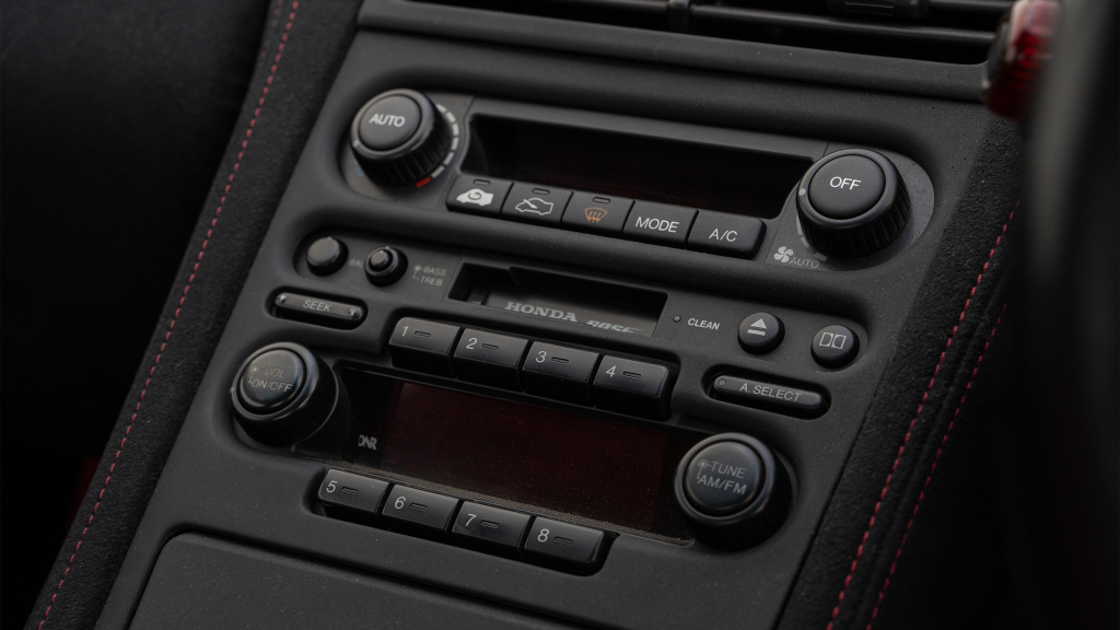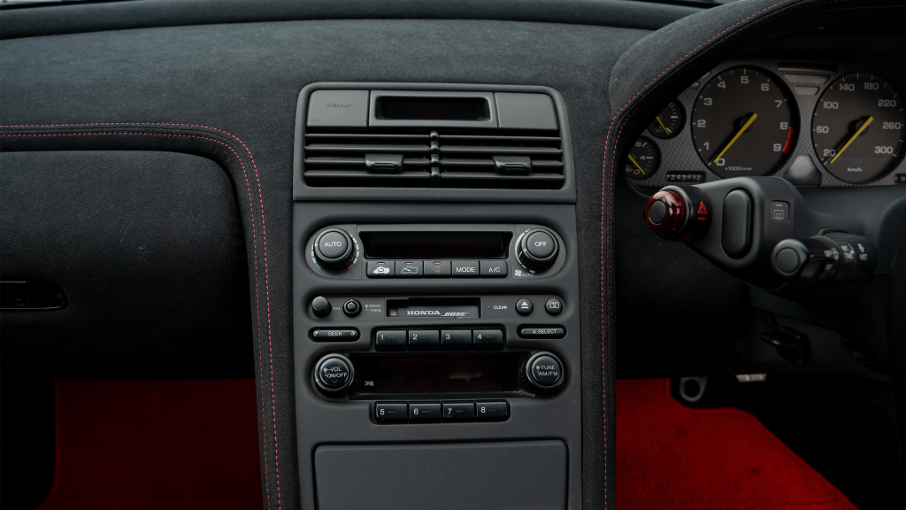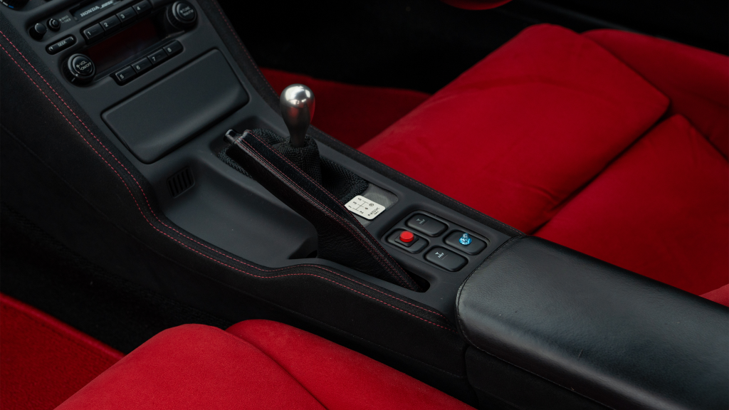 The right-hand-drive cockpit houses a pair of carbon-Kevlar Recaro buckets seats that are trimmed in red Alcantara and feature forward and aft power adjustment. Black upholstery covers the door panels, dash, and center stack, which are accented by red stitching. Neither air conditioning nor an audio system was standard on the NSX-R, though this example is equipped with both options.