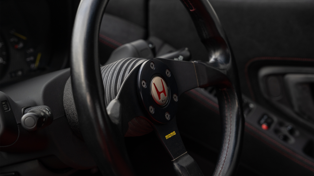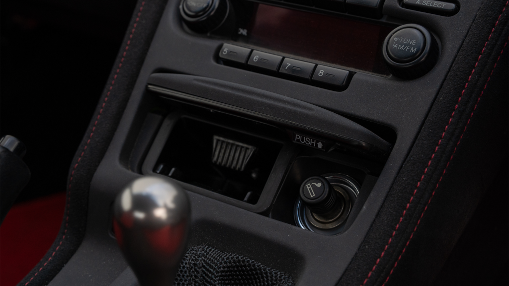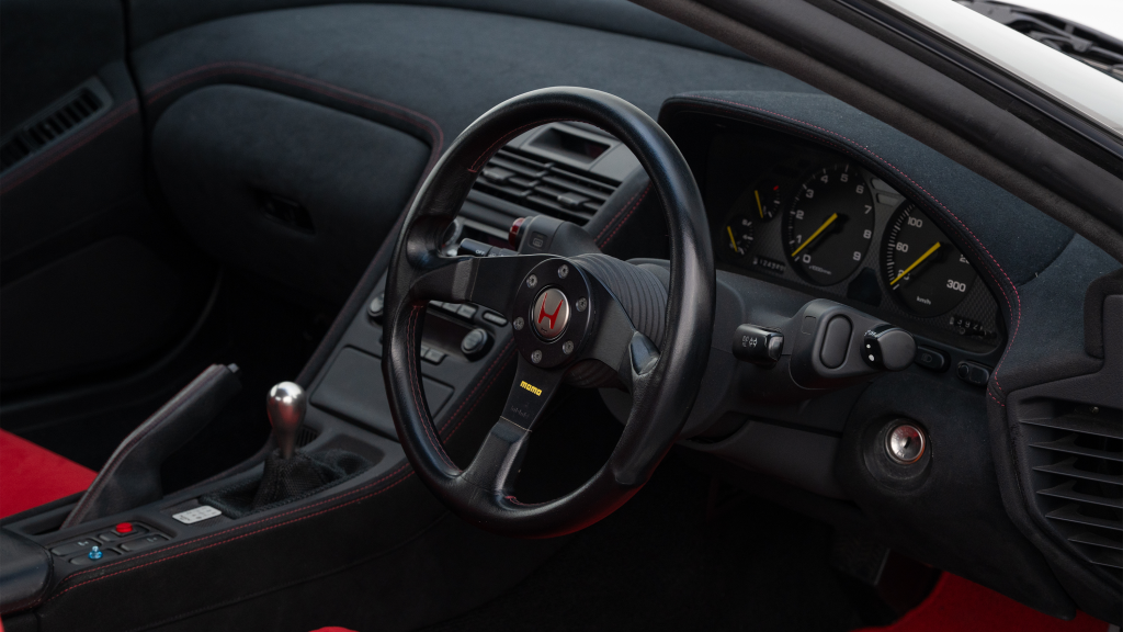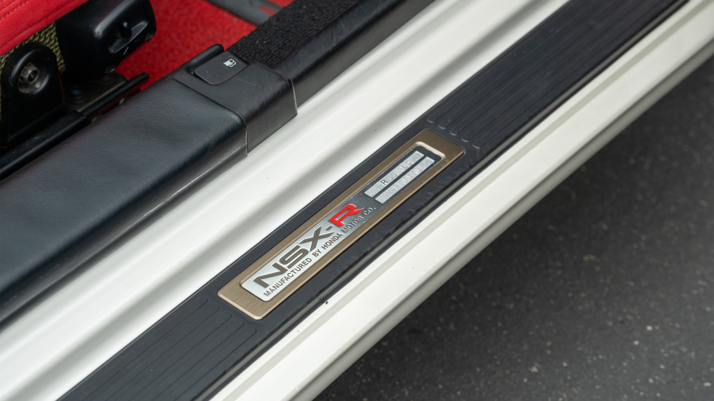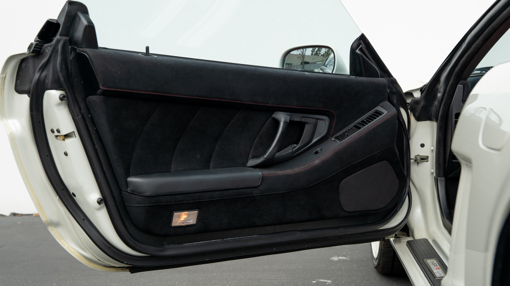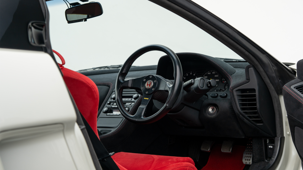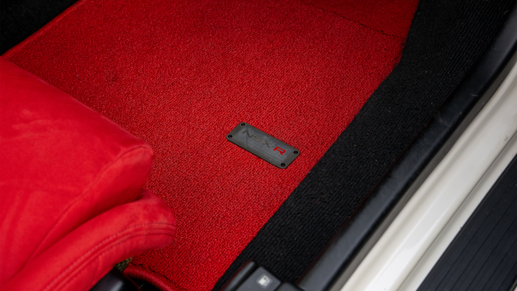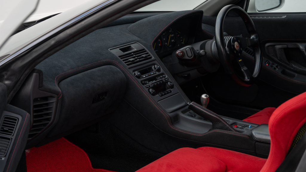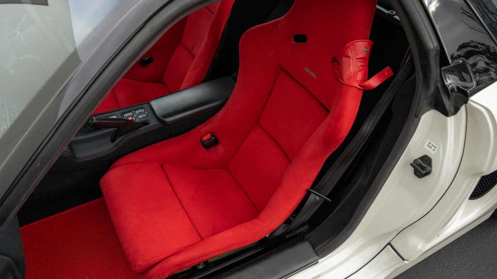 The right-hand-drive cockpit houses a pair of carbon-Kevlar Recaro buckets seats that are trimmed in red Alcantara and feature forward and aft power adjustment. Black upholstery covers the door panels, dash, and center stack, which are accented by red stitching. Neither air conditioning nor an audio system was standard on the NSX-R, though this example is equipped with both options.
