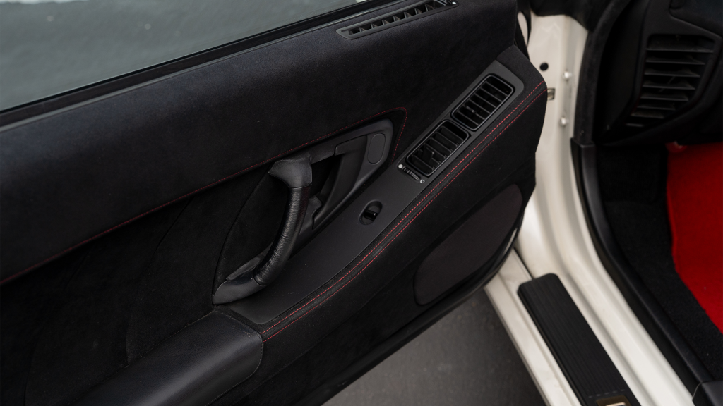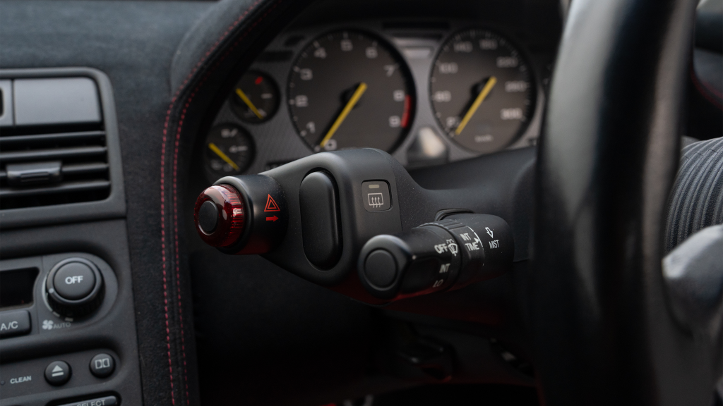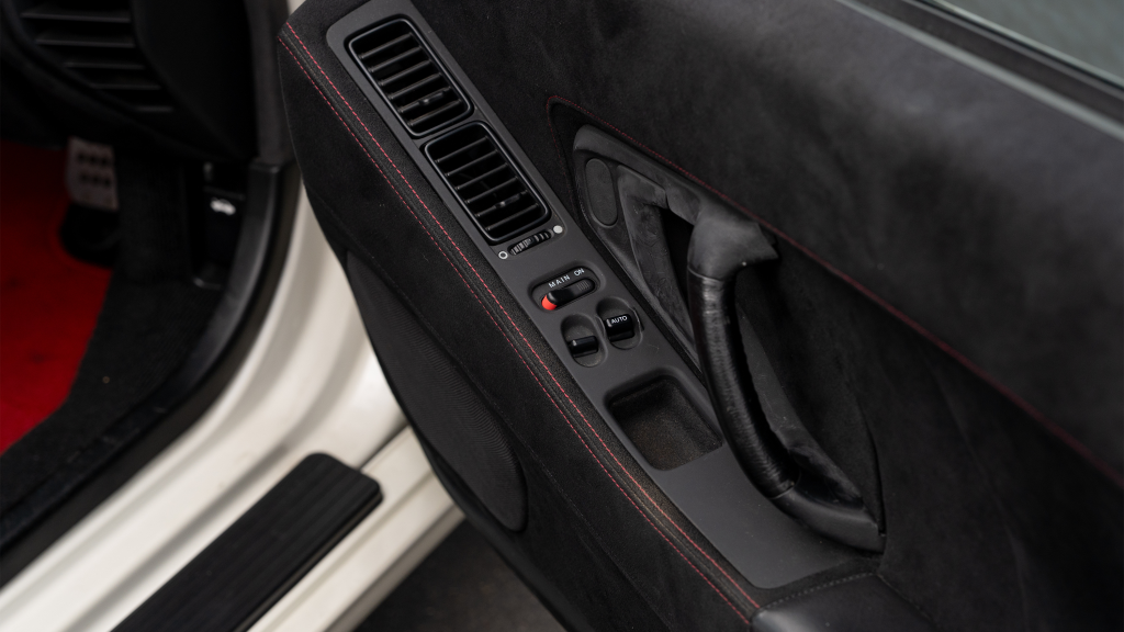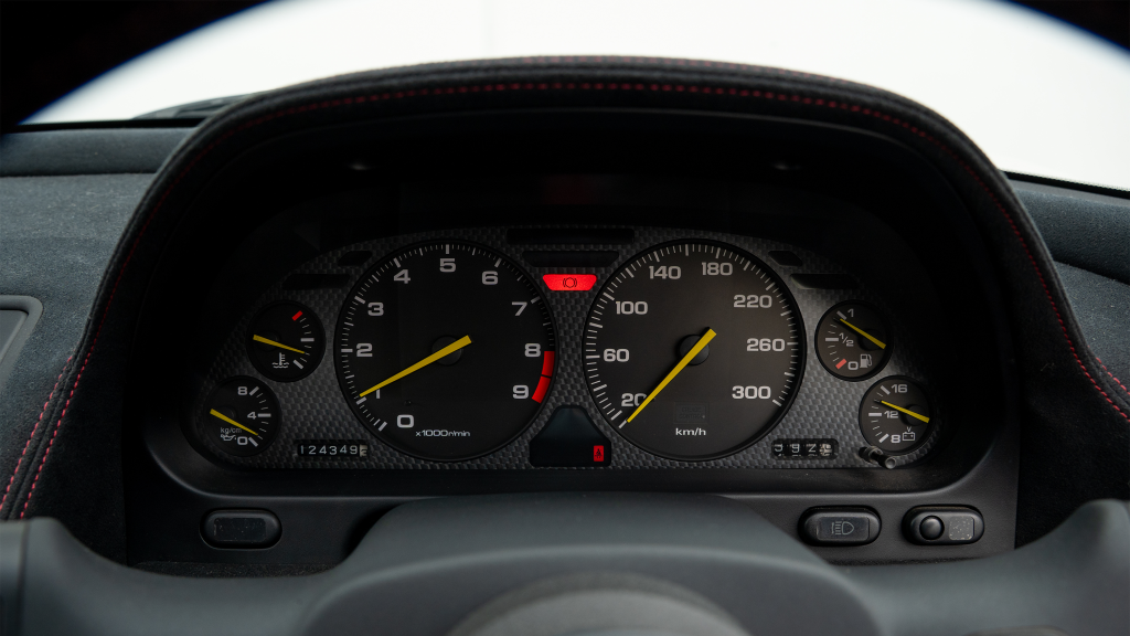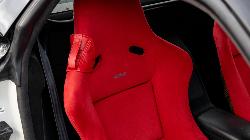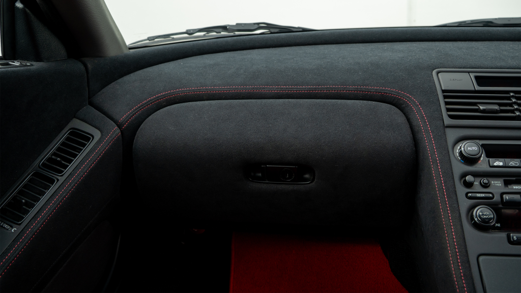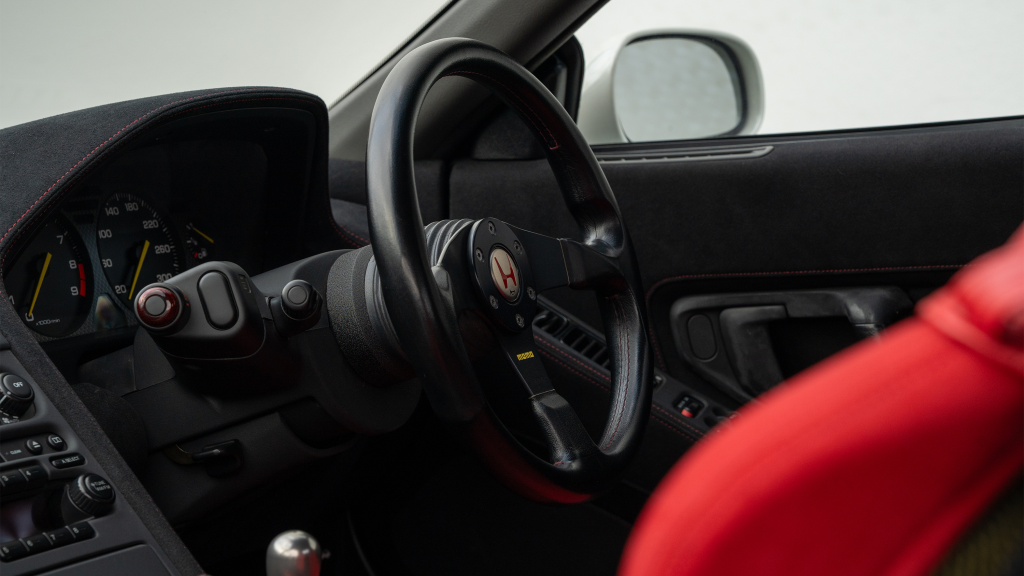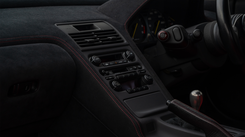The right-hand-drive cockpit houses a pair of carbon-Kevlar Recaro buckets seats that are trimmed in red Alcantara and feature forward and aft power adjustment. Black upholstery covers the door panels, dash, and center stack, which are accented by red stitching. Neither air conditioning nor an audio system was standard on the NSX-R, though this example is equipped with both options.