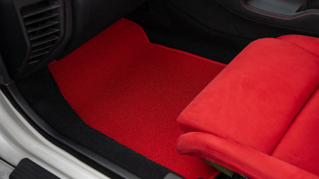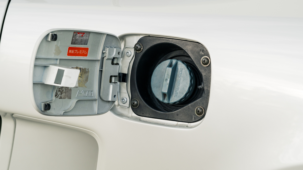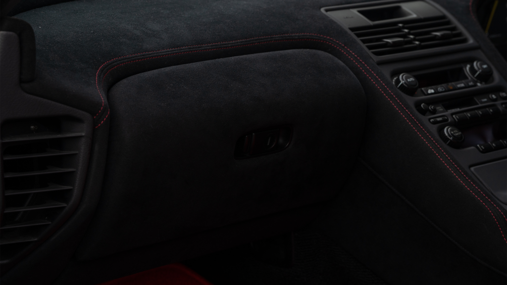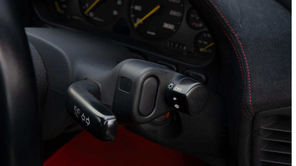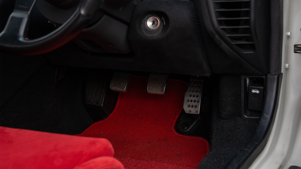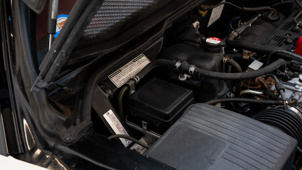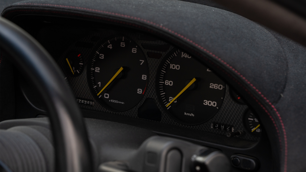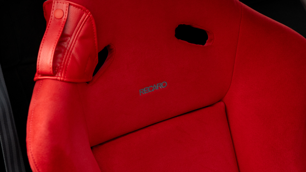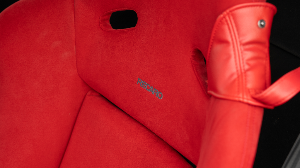 The right-hand-drive cockpit houses a pair of carbon-Kevlar Recaro buckets seats that are trimmed in red Alcantara and feature forward and aft power adjustment. Black upholstery covers the door panels, dash, and center stack, which are accented by red stitching. Neither air conditioning nor an audio system was standard on the NSX-R, though this example is equipped with both options.