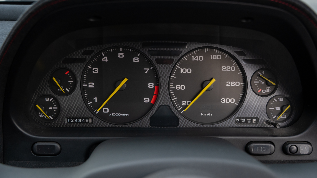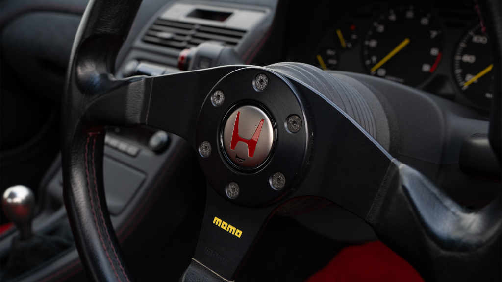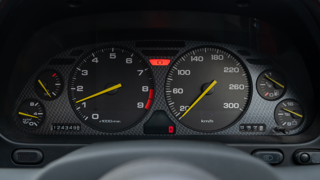 Type R–specific features include a non-airbag MOMO steering wheel and a titanium shift knob. Instrumentation consists of a 300-km/h speedometer and a tachometer with an 8k-rpm redline along with gauges monitoring oil pressure, coolant temperature, fuel level, and voltage. The six-digit odometer shows 124k kilometers (~77k miles), approximately 500 of which were added under current ownership.