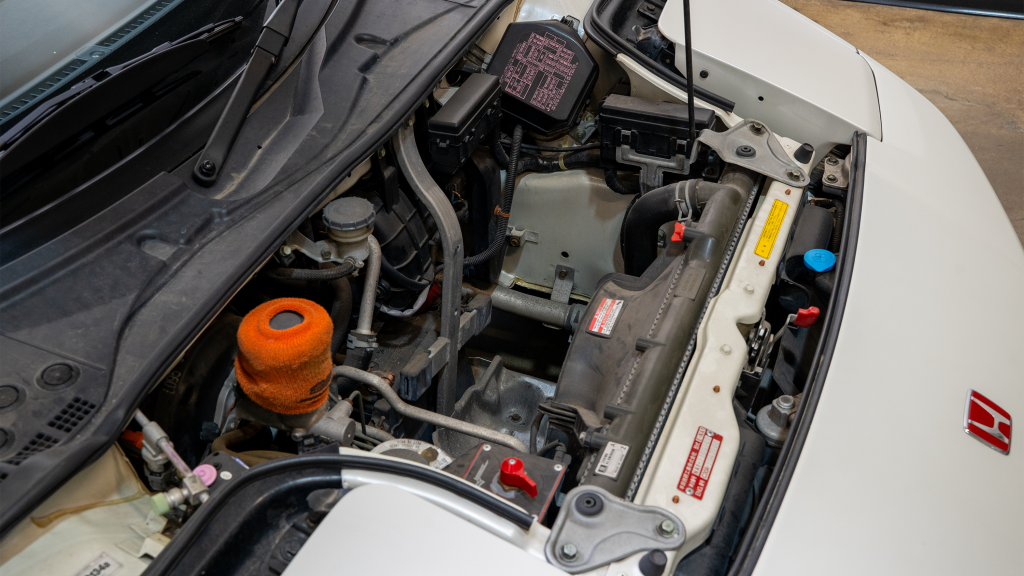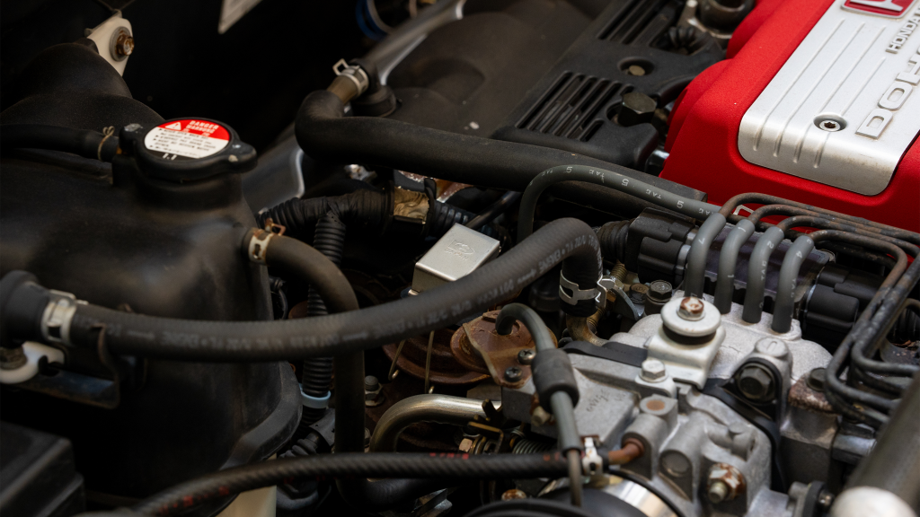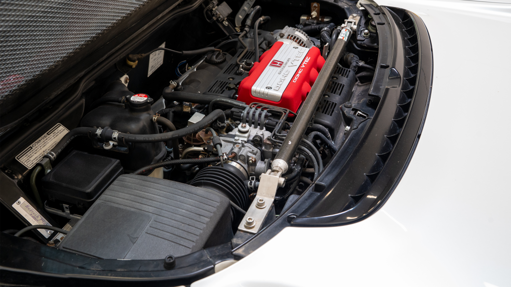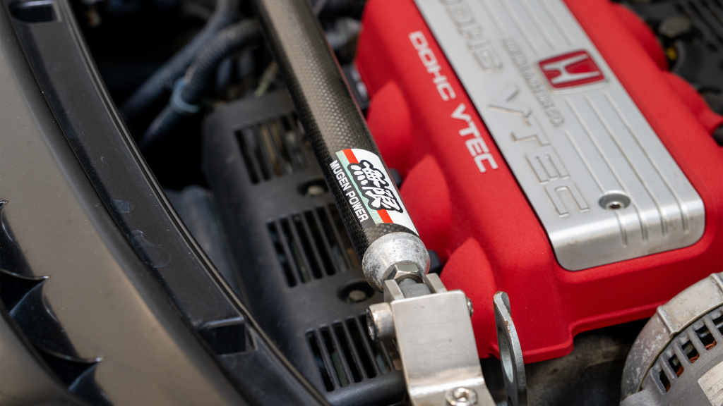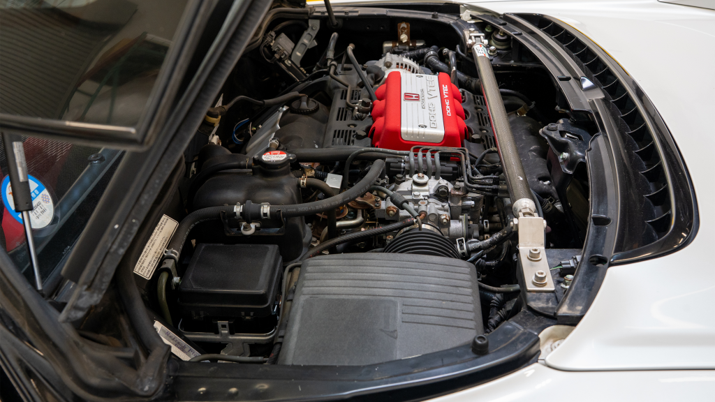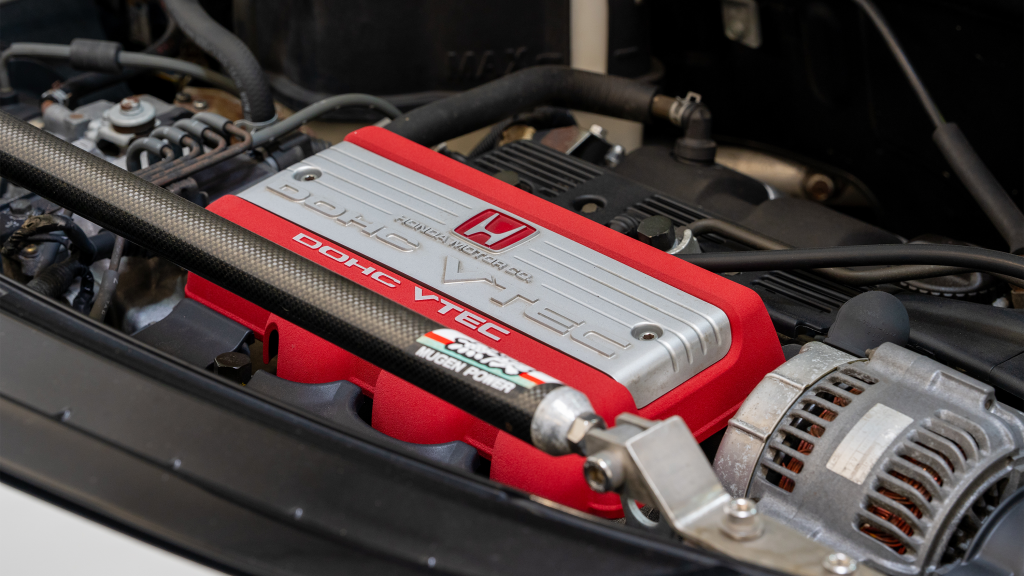 The mid-mounted 3.0-liter C30A V6 was shared with the standard NSX, though it featured a blueprinted and balanced crankshaft assembly. Like the standard engine, the C30A included VTEC variable valve timing, dual overhead camshafts for each cylinder bank, a 10.2:1 compression ratio, and Honda PGM-F1 electronic fuel injection. A carbon-fiber strut brace has been installed.