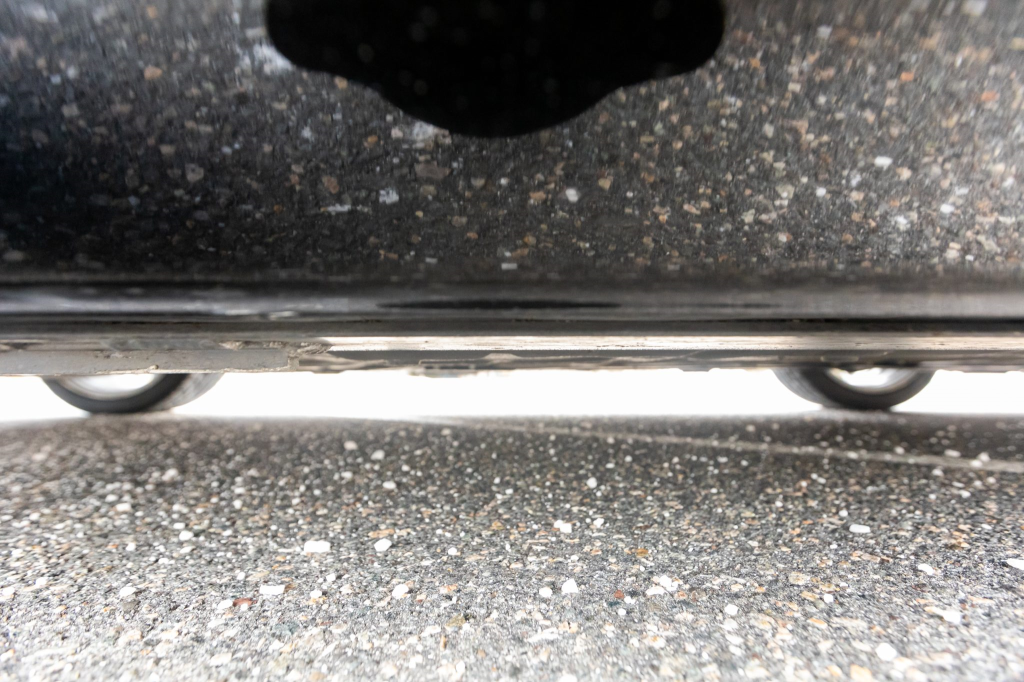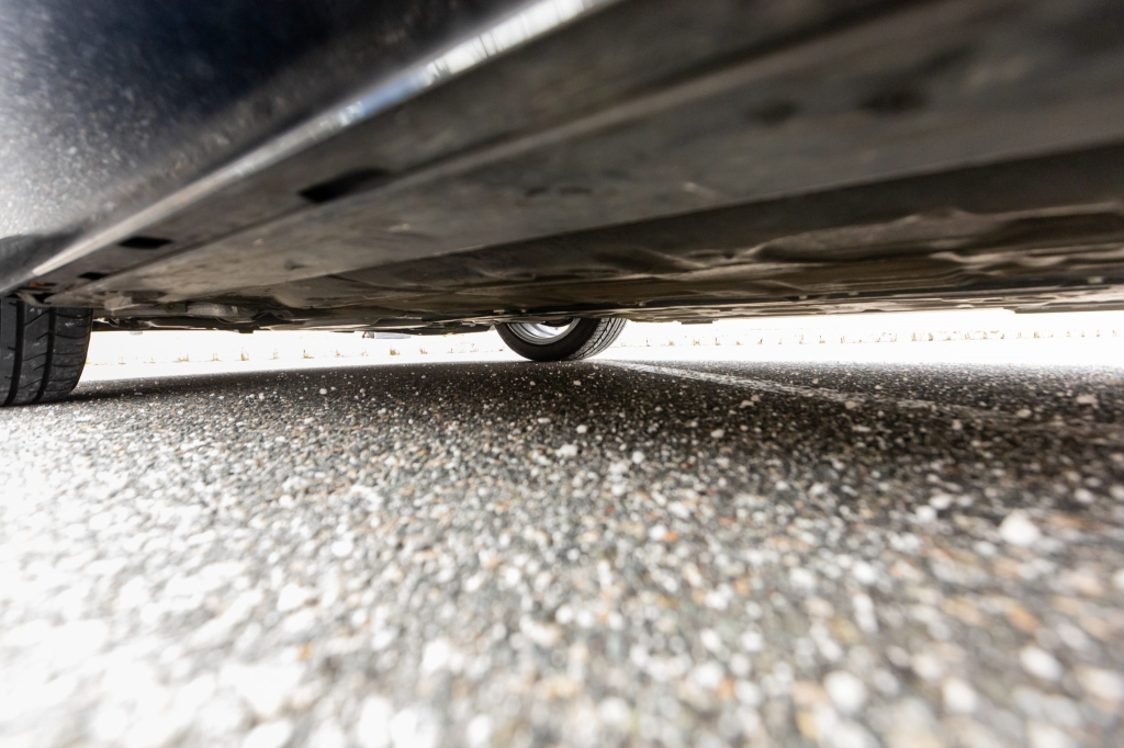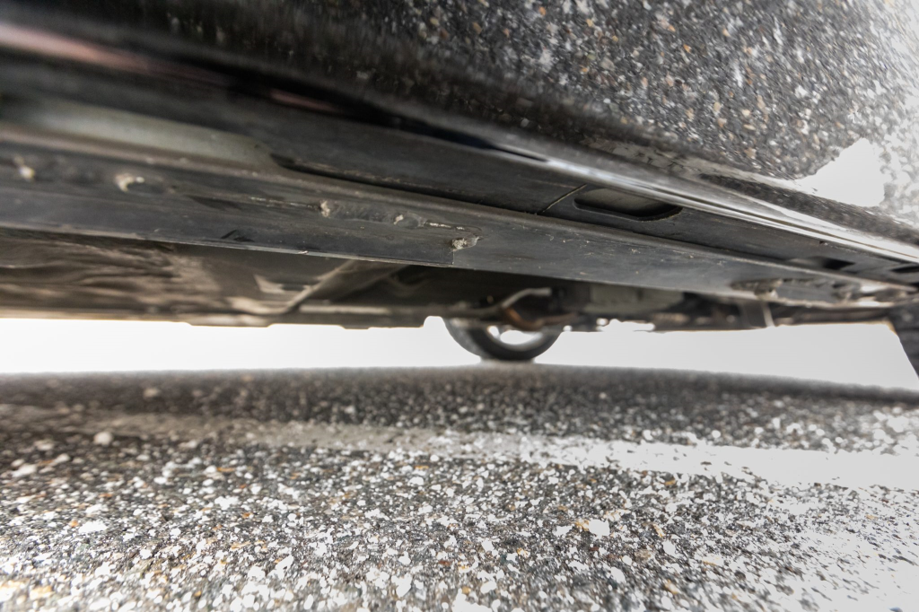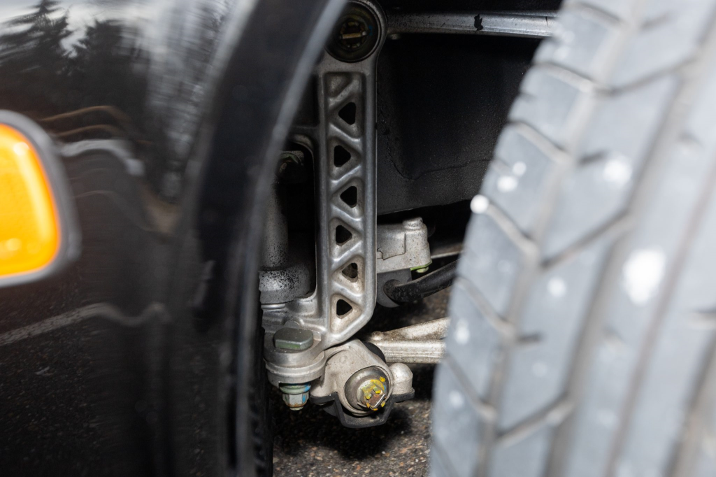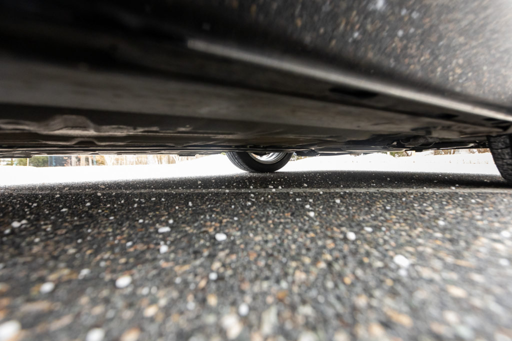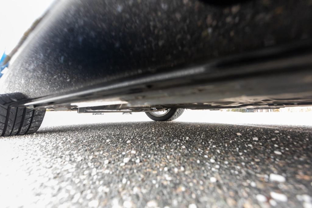 Power is routed to the rear wheels via a six-speed manual transaxle and a limited-slip differential. Additional photos of the underside are presented in the gallery.