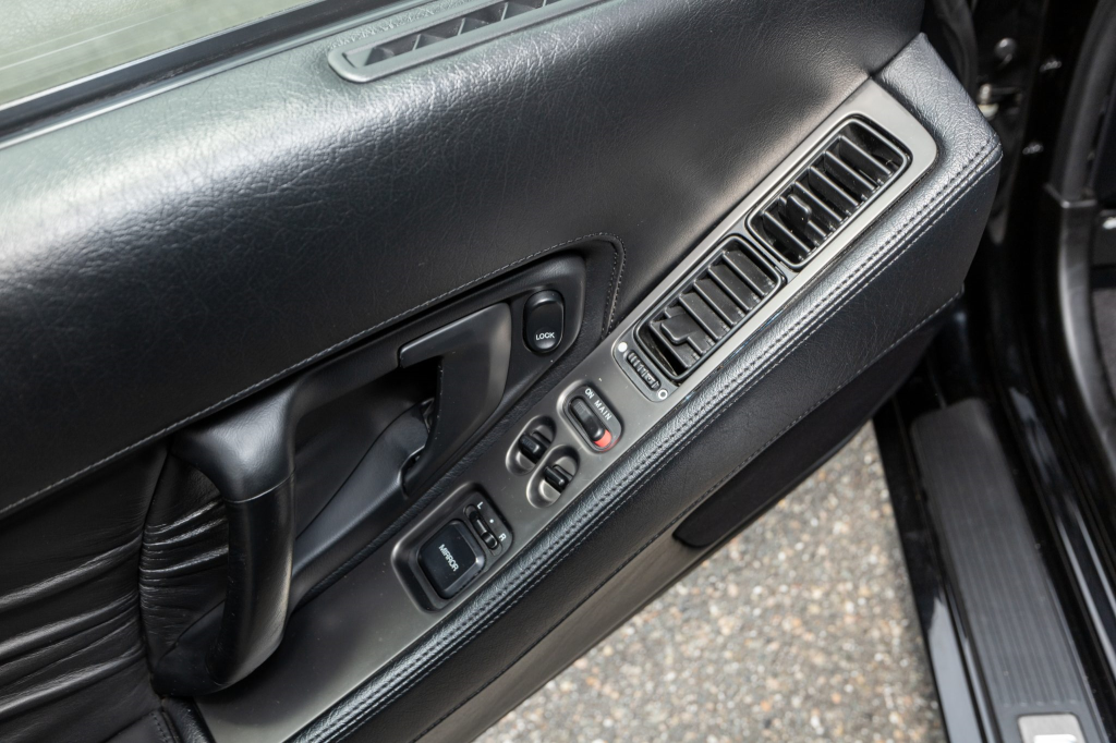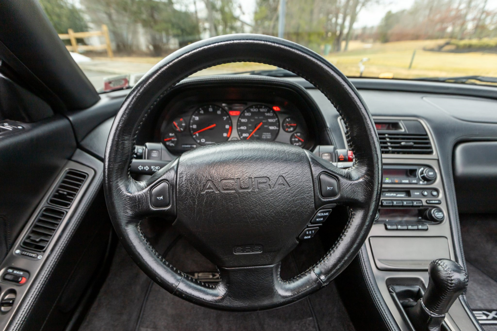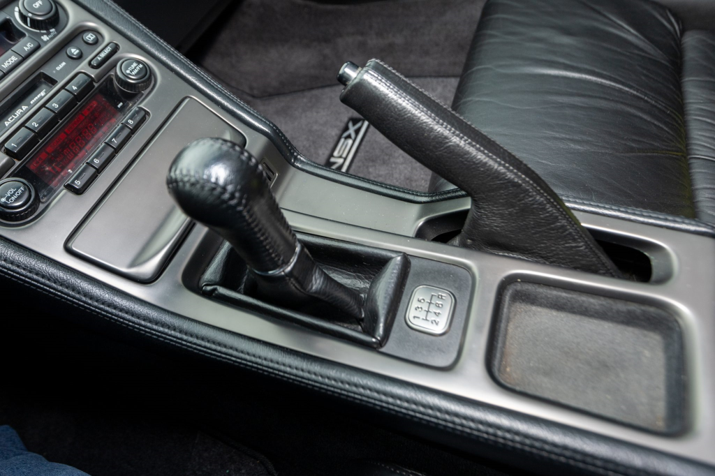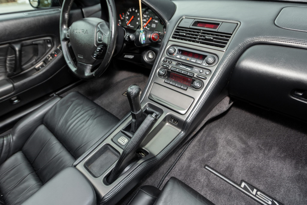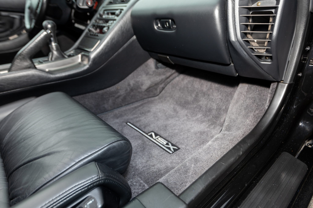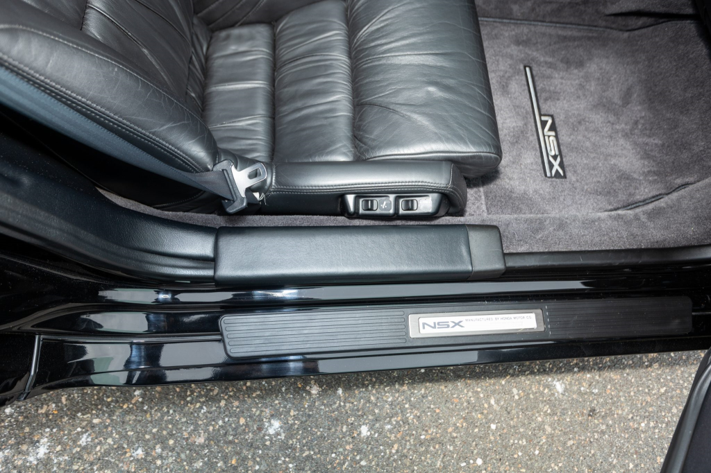 The cabin features power-adjustable sport seats upholstered in Onyx leather, while NSX-branded floor mats line the footwells. Interior appointments include automatic climate control, cruise control, a Bose sound system, and a cassette stereo linked to a six-disc CD changer. The stainless-steel door sill plates are stamped with the car’s serial number.