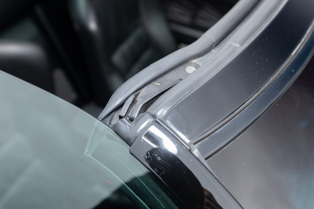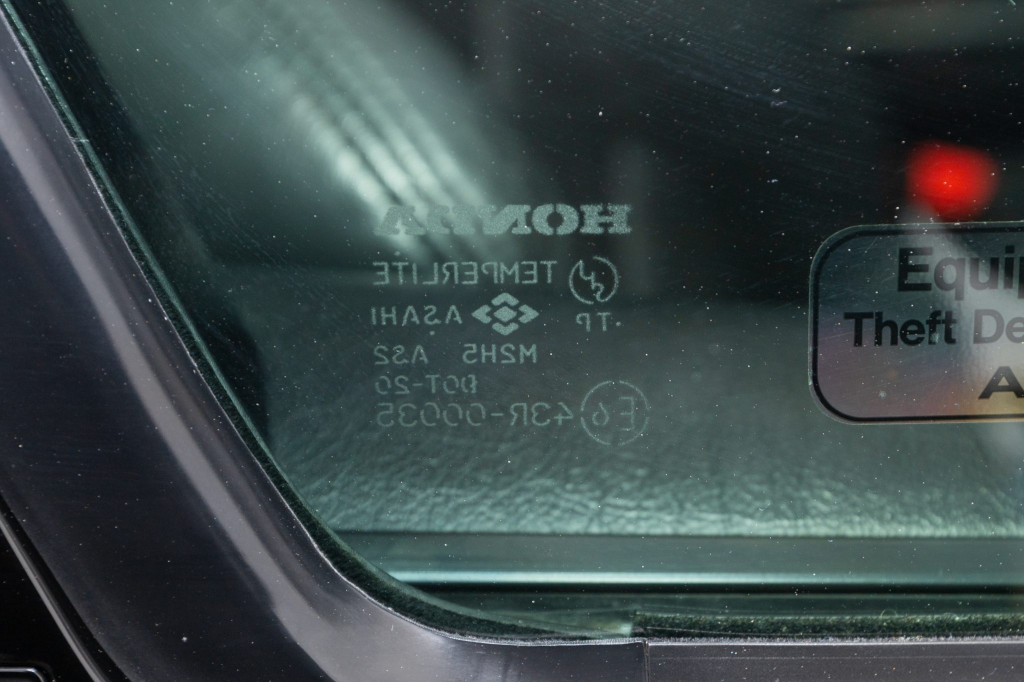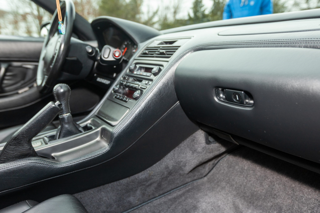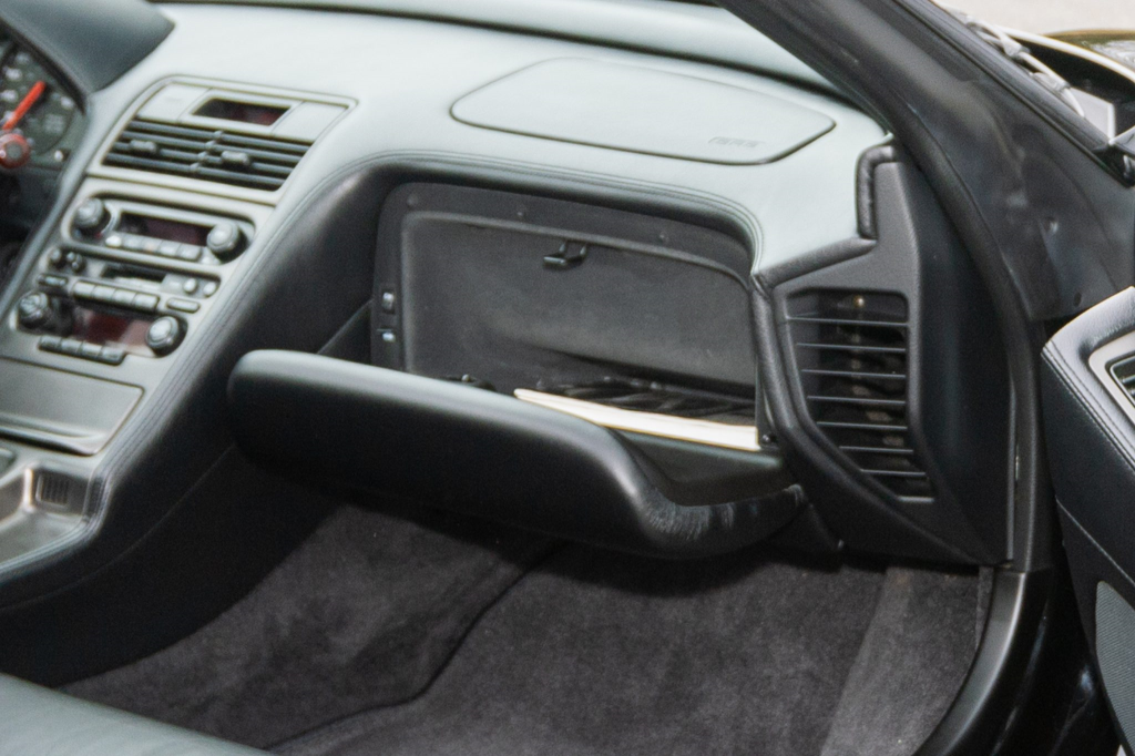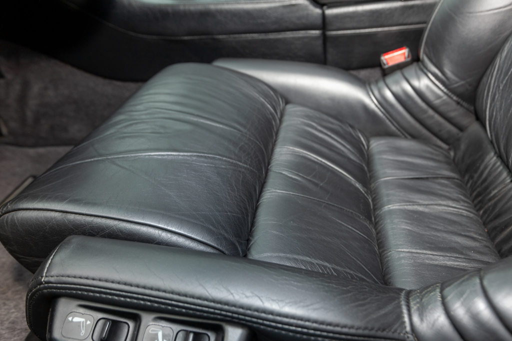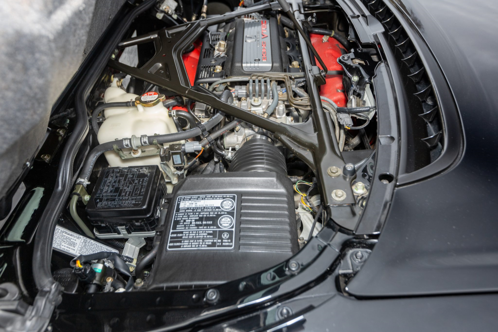 The cabin features power-adjustable sport seats upholstered in Onyx leather, while NSX-branded floor mats line the footwells. Interior appointments include automatic climate control, cruise control, a Bose sound system, and a cassette stereo linked to a six-disc CD changer. The stainless-steel door sill plates are stamped with the car’s serial number.