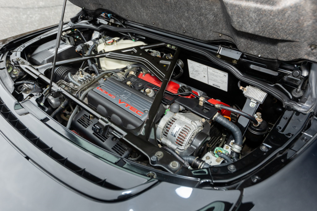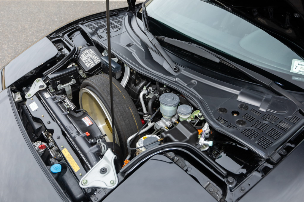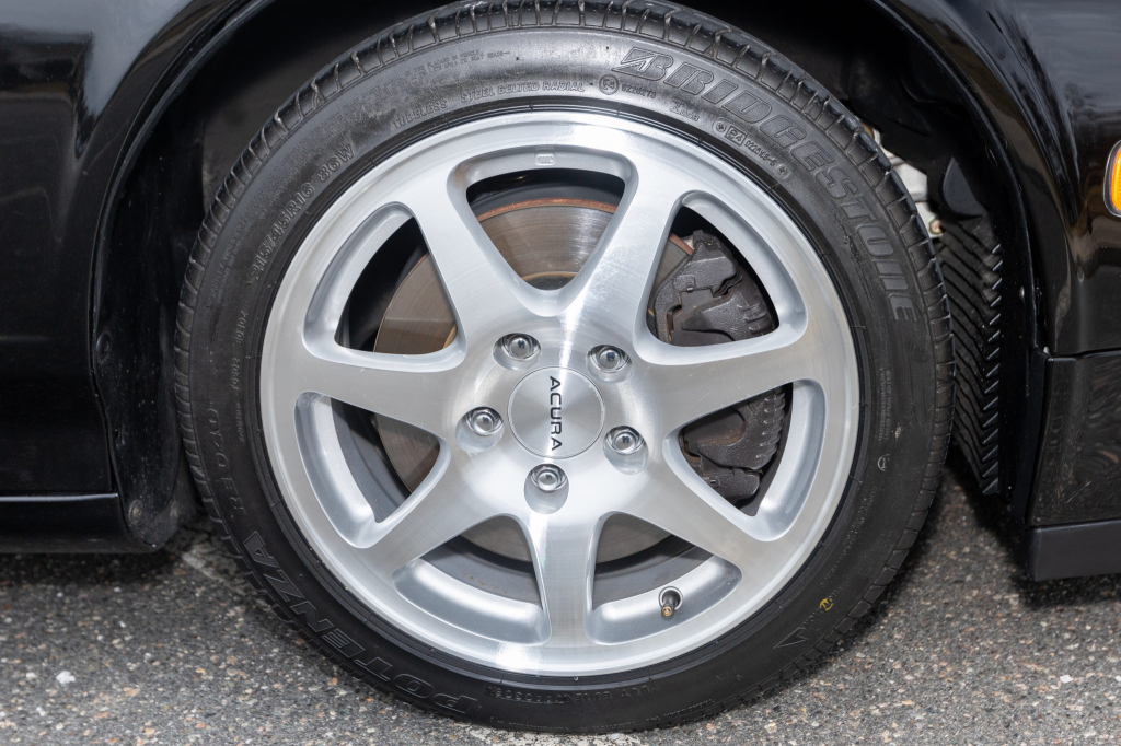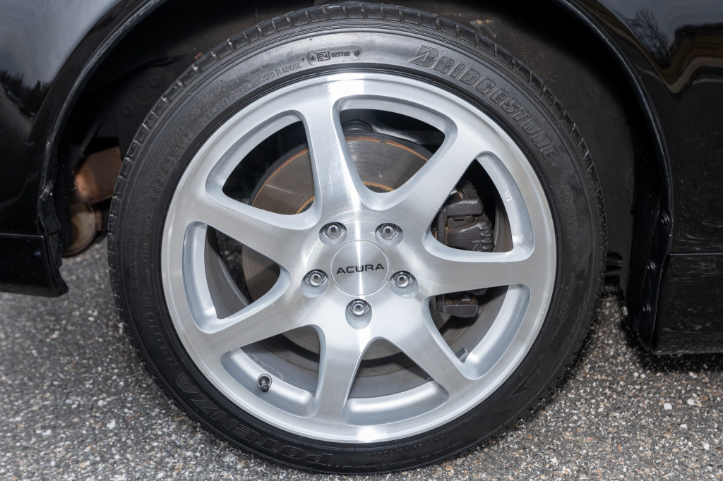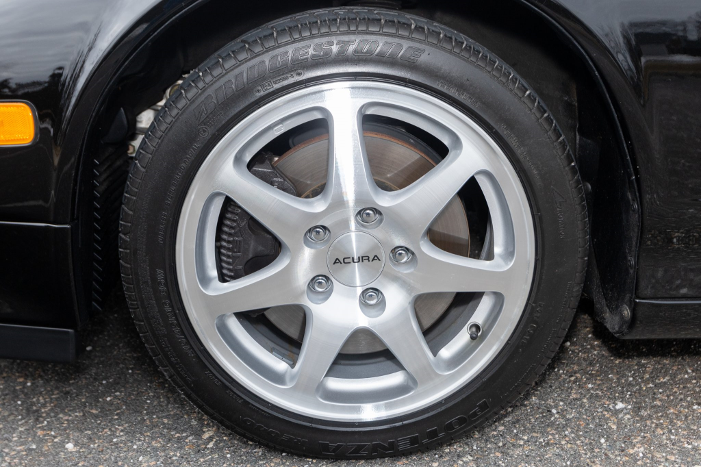 Staggered-diameter 16” and 17” seven-spoke aluminum wheels are mounted with Bridgestone tires. The car features a four-wheel double-wishbone suspension with front and rear stabilizer bars, and braking is handled by NSX-branded calipers over vented rotors at each corner.