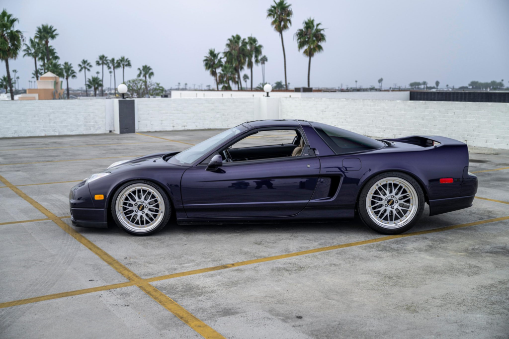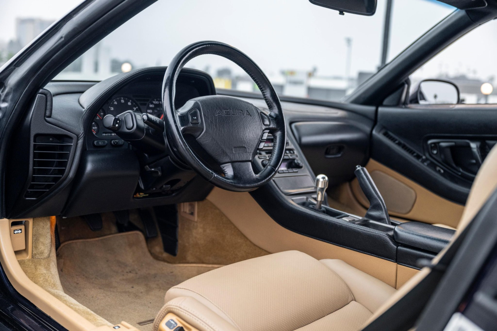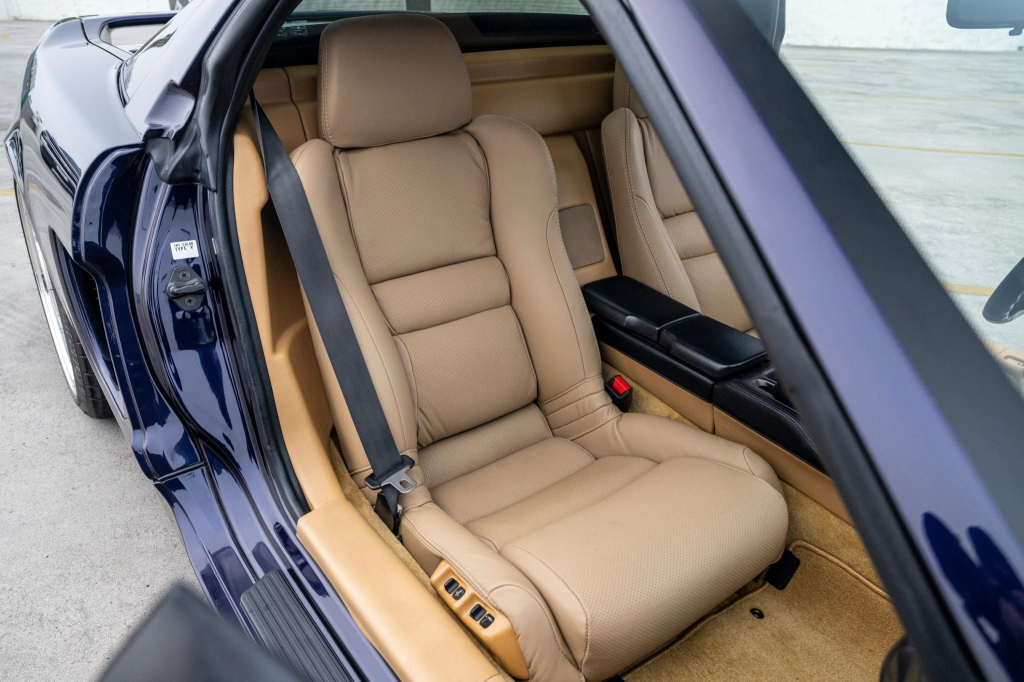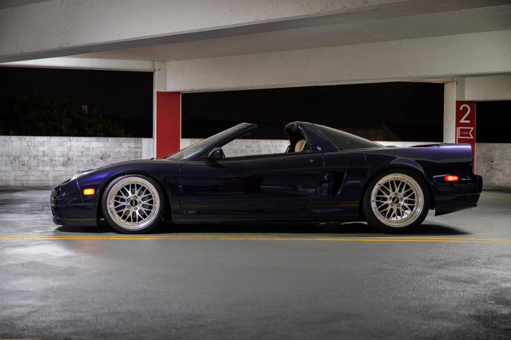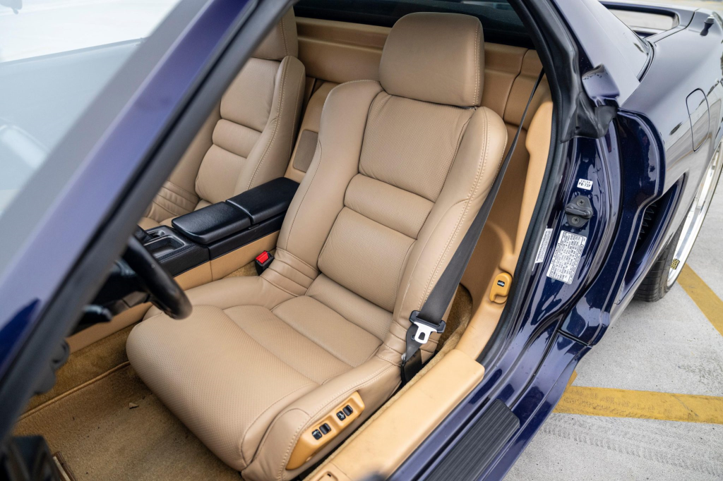 This 1995 Acura NSX-T is finished in Midnight Pearl over tan leather and has been retrofitted with a six-speed manual transaxle as well as NA2-style bumper covers and lights. Power comes from a 3.0-liter VTEC V6, and features include a limited-slip differential, a removable body-color roof panel, an aftermarket exhaust, 18” and 19” BBS LM wheels, and Endless Zeal Function adjustable coilovers. Automatic climate control, cruise control, a Bose sound system, and power-adjustable seats are further details. The car has remained registered in California since new and was acquired by the selling dealer in 2021. This NSX-T shows 84k miles and is now offered with a clean Carfax report and a clean California title.