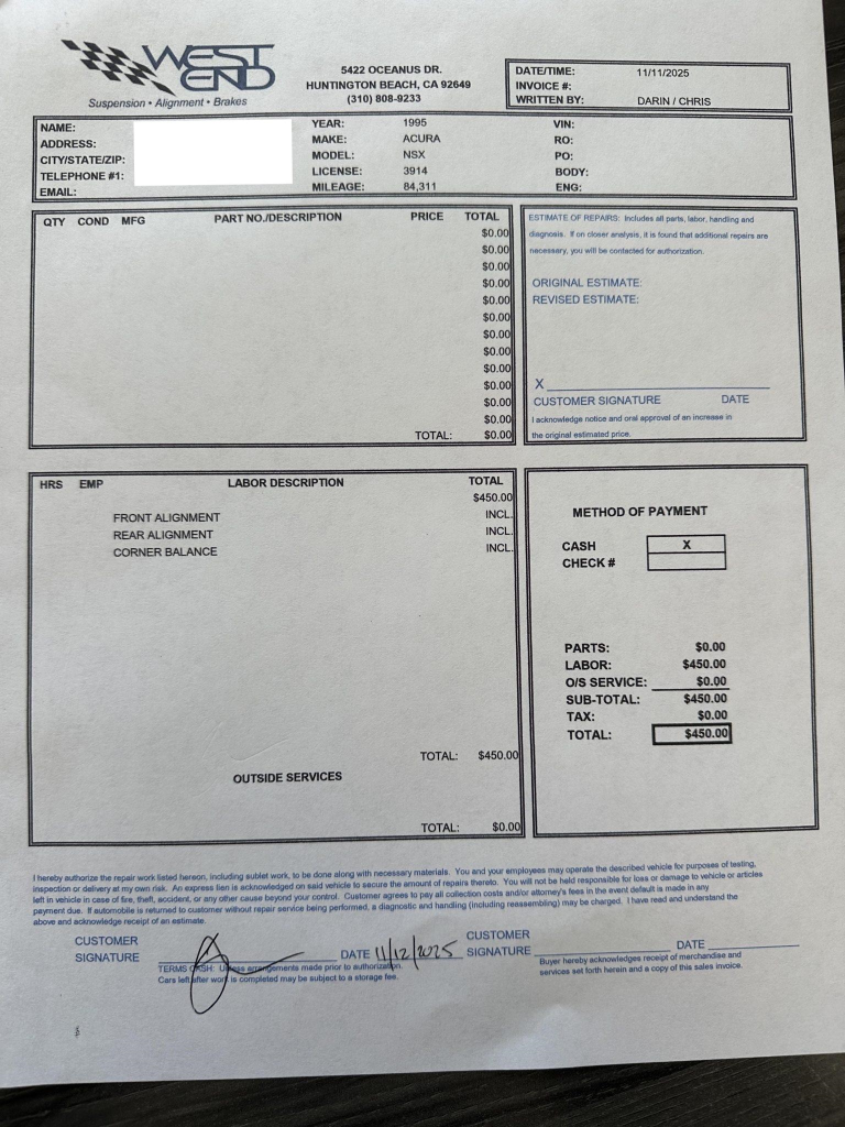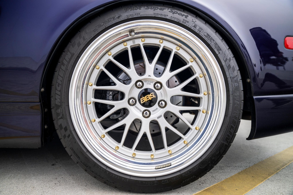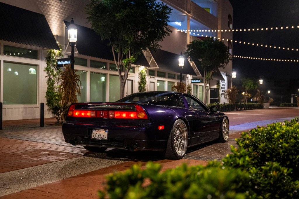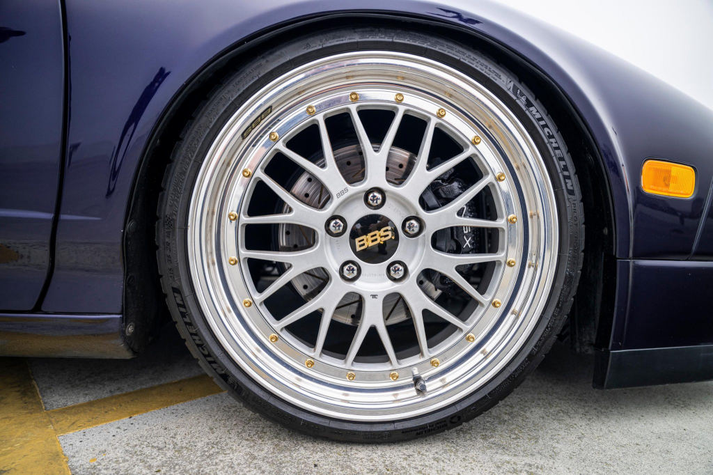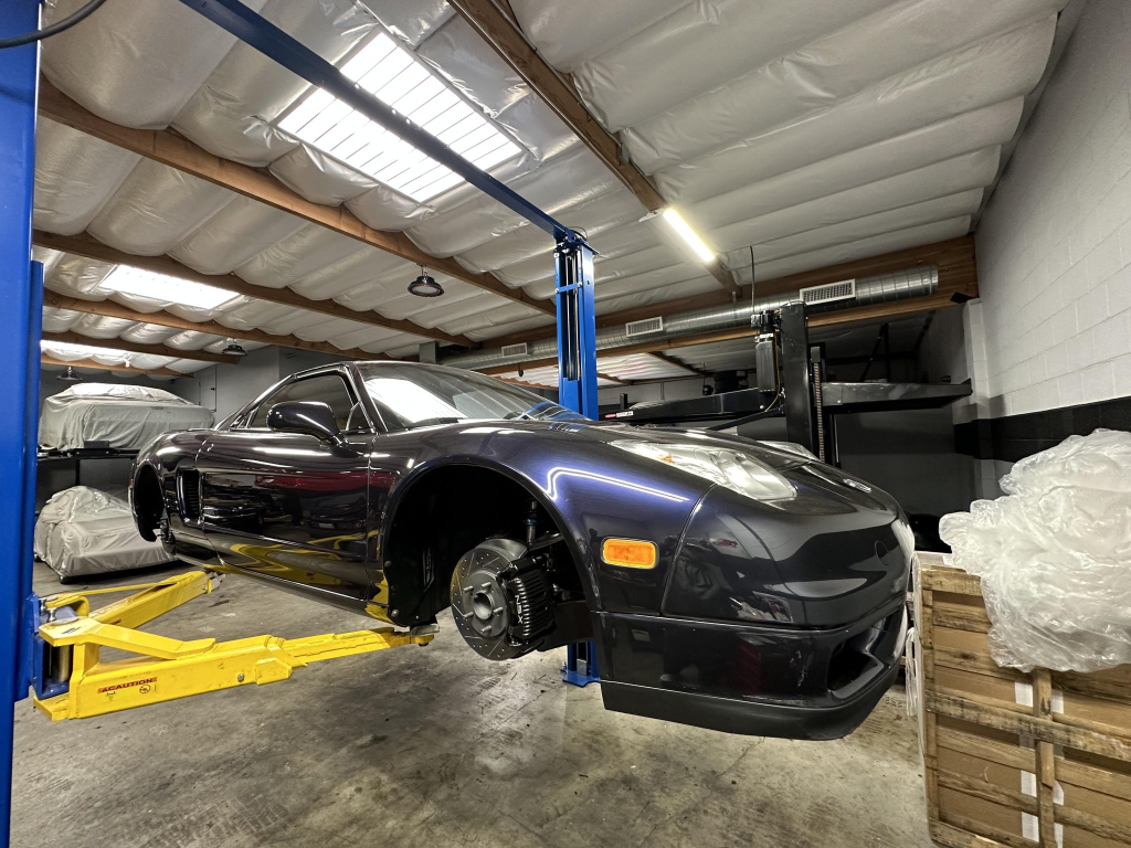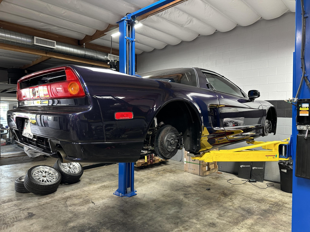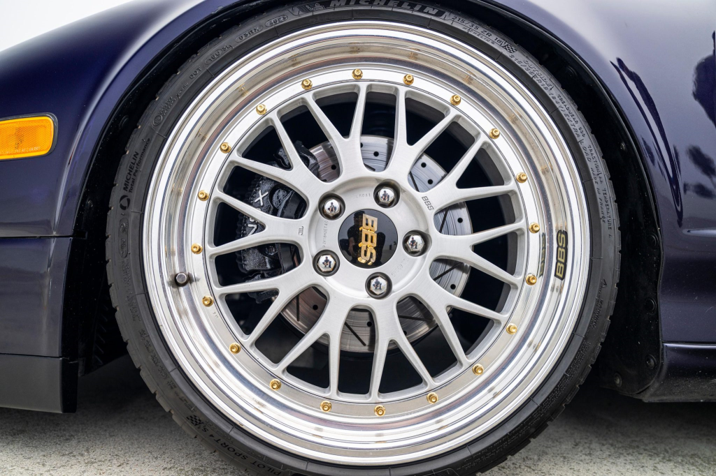 The 18” BBS LM wheels are mounted with 215/35 front and 275/35 rear Michelin Pilot Super Sport tires. The four-wheel double-wishbone suspension incorporates front and rear stabilizer bars, and Endless Zeal Function adjustable coilovers have been installed. NSX-branded calipers are fitted over aftermarket slotted rotors at all four corners. An alignment, ride-height adjustment, and corner balancing service was performed at West End of Huntington Beach, California, in November 2025.