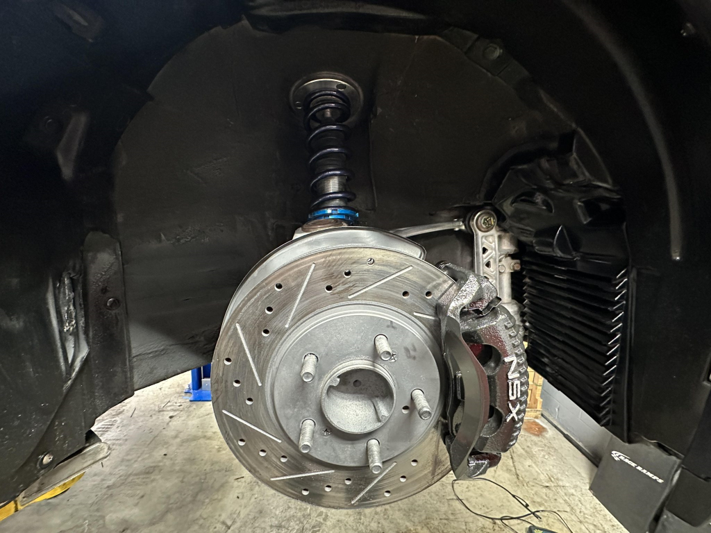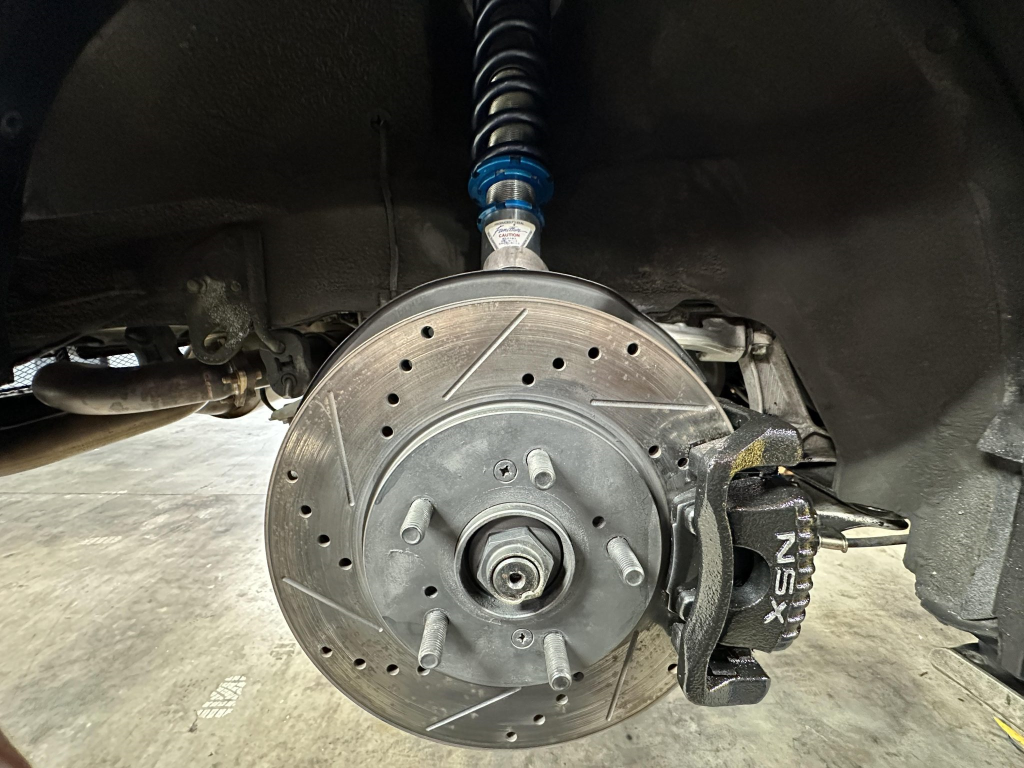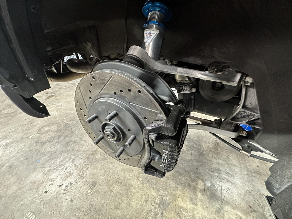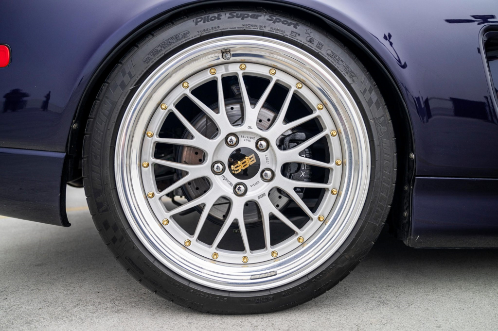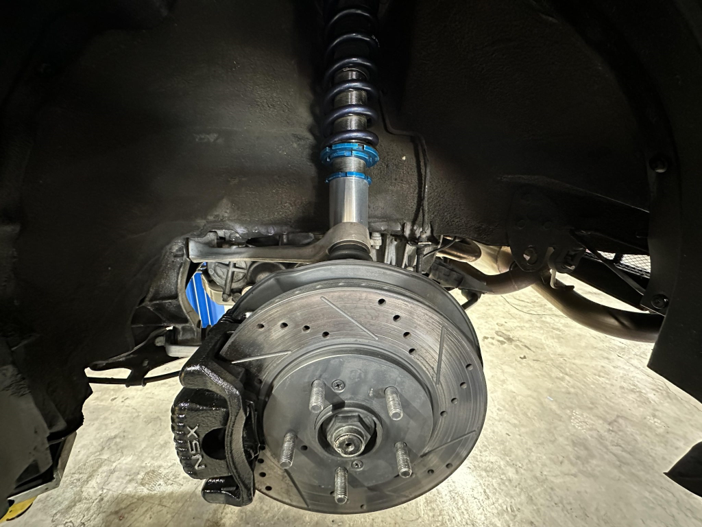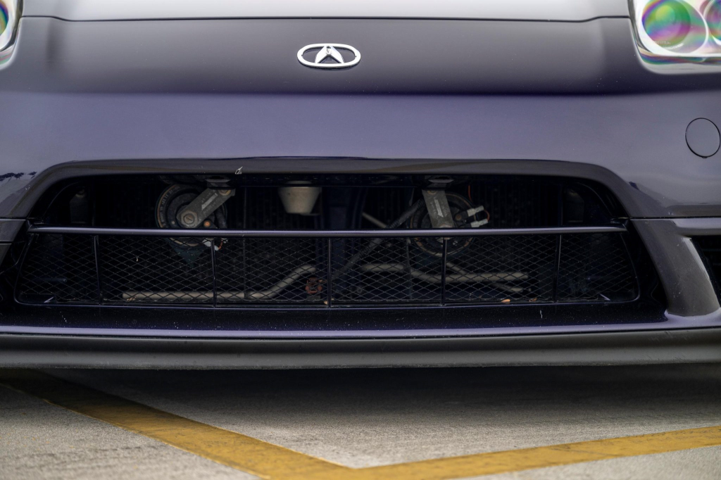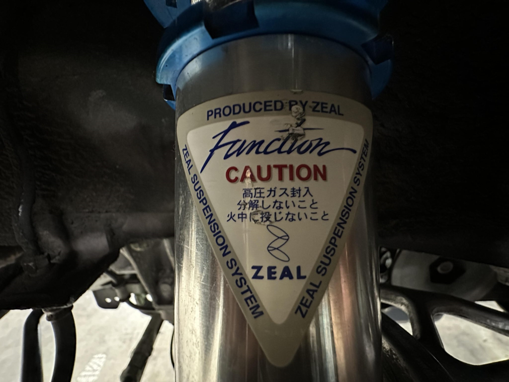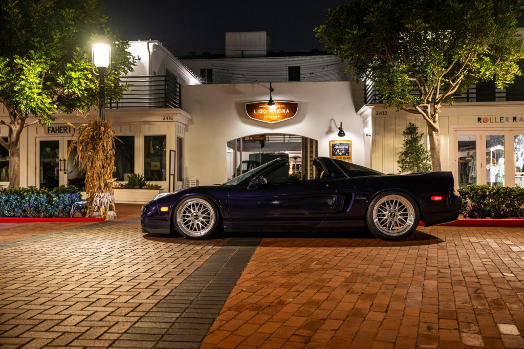 The 18” BBS LM wheels are mounted with 215/35 front and 275/35 rear Michelin Pilot Super Sport tires. The four-wheel double-wishbone suspension incorporates front and rear stabilizer bars, and Endless Zeal Function adjustable coilovers have been installed. NSX-branded calipers are fitted over aftermarket slotted rotors at all four corners. An alignment, ride-height adjustment, and corner balancing service was performed at West End of Huntington Beach, California, in November 2025.