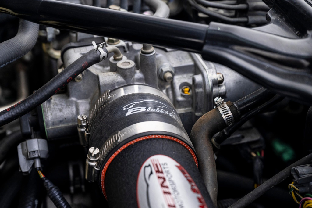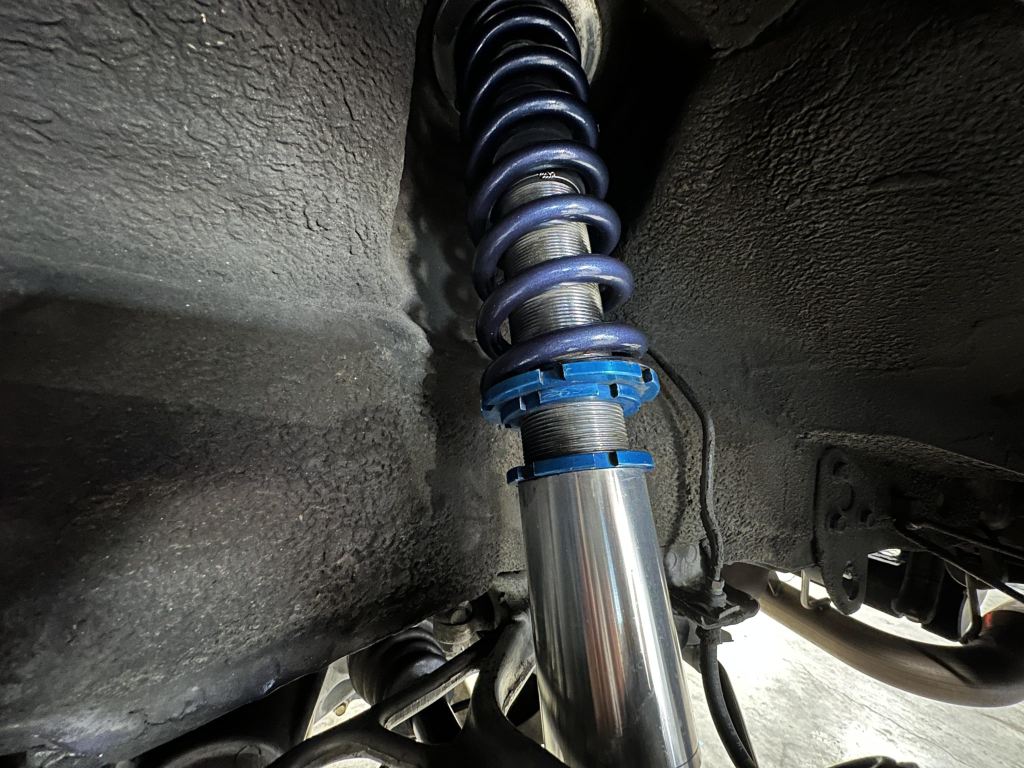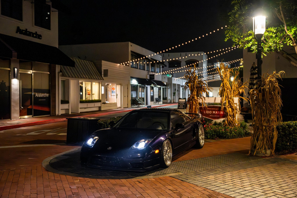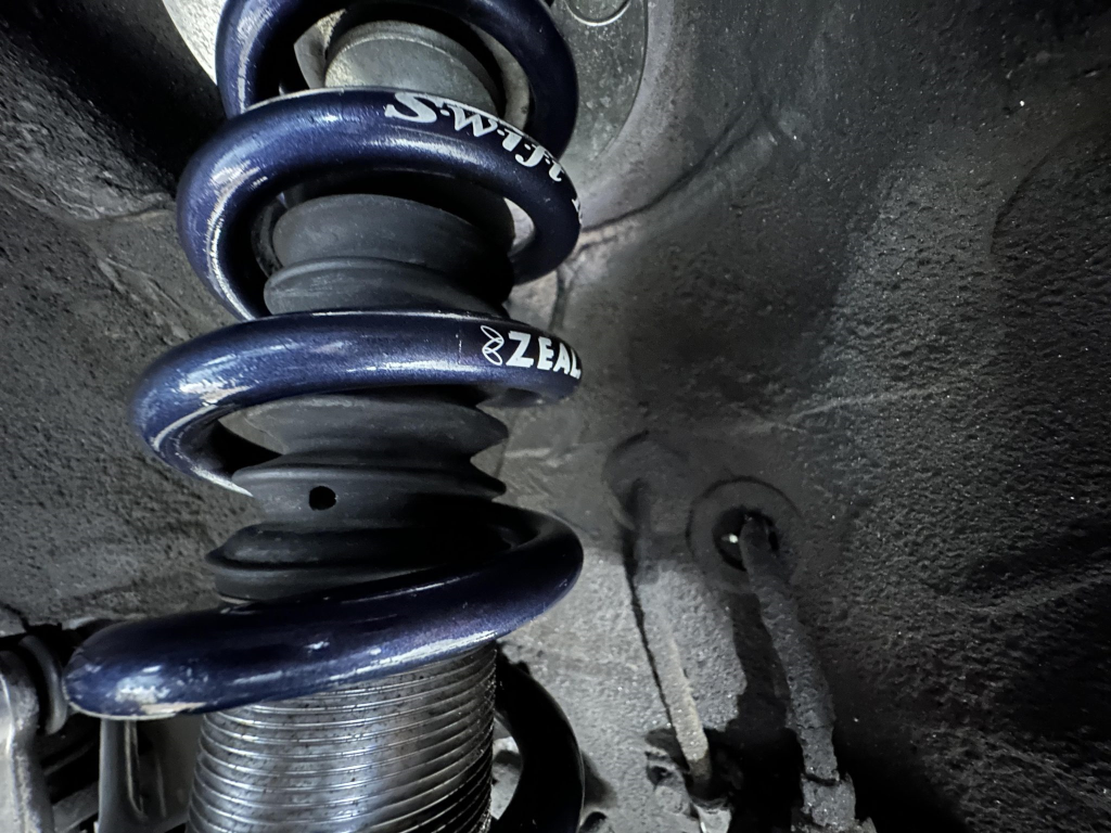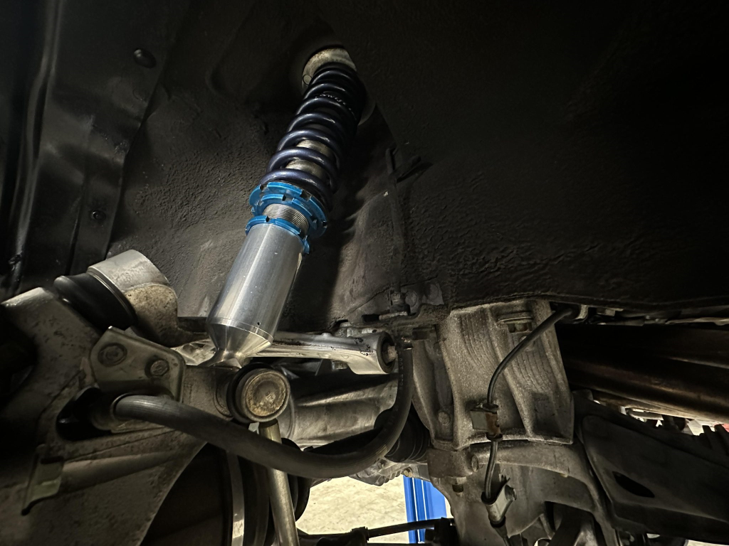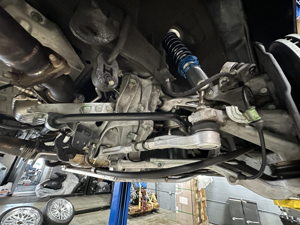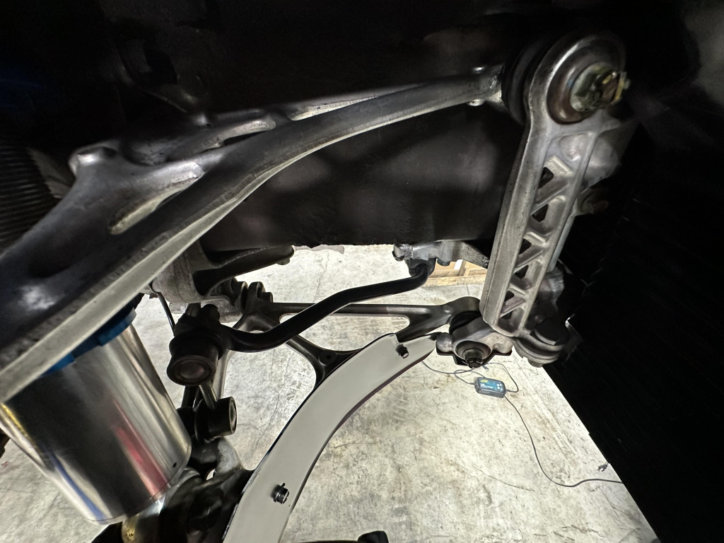 The 18” BBS LM wheels are mounted with 215/35 front and 275/35 rear Michelin Pilot Super Sport tires. The four-wheel double-wishbone suspension incorporates front and rear stabilizer bars, and Endless Zeal Function adjustable coilovers have been installed. NSX-branded calipers are fitted over aftermarket slotted rotors at all four corners. An alignment, ride-height adjustment, and corner balancing service was performed at West End of Huntington Beach, California, in November 2025.