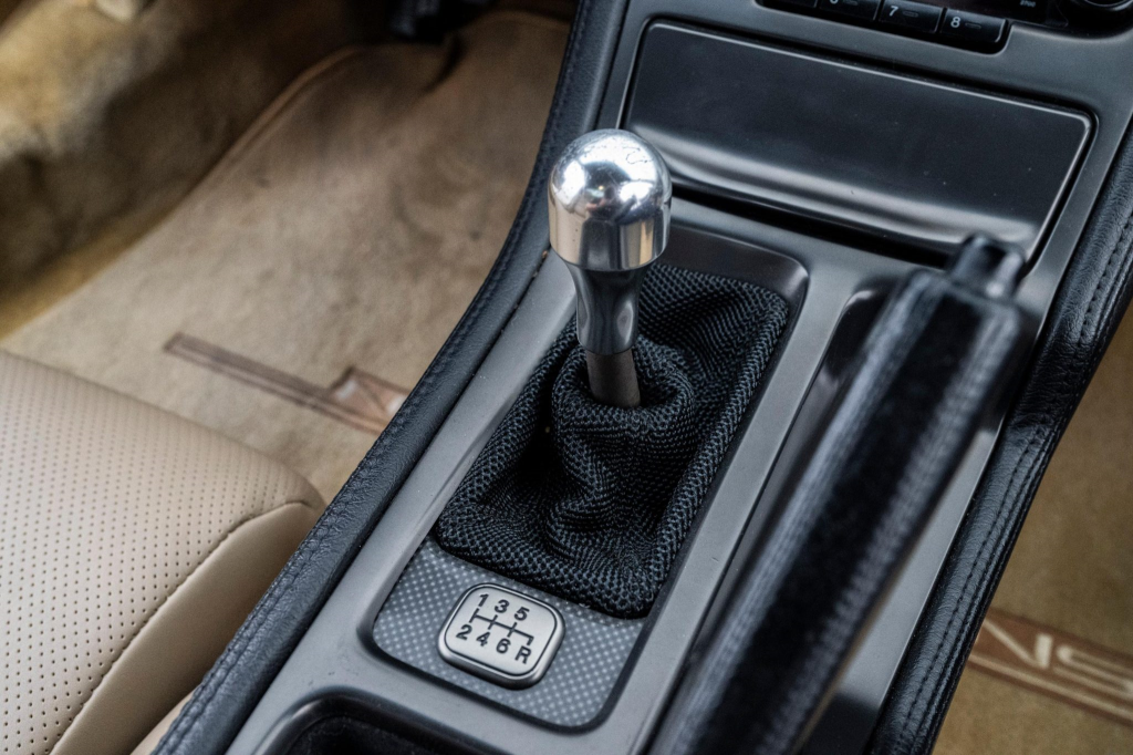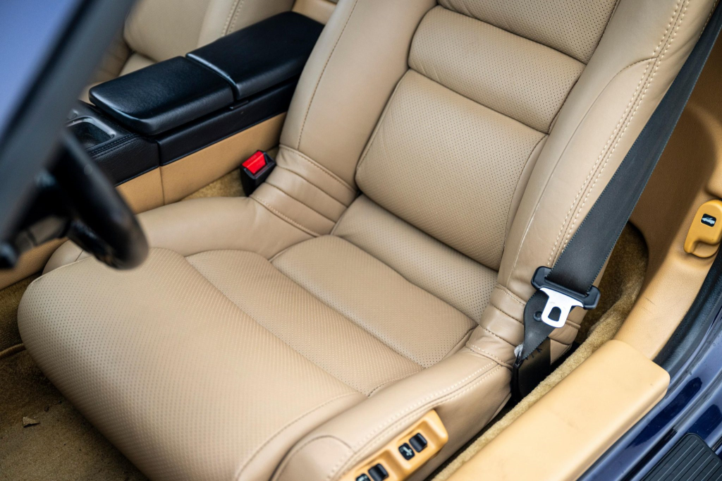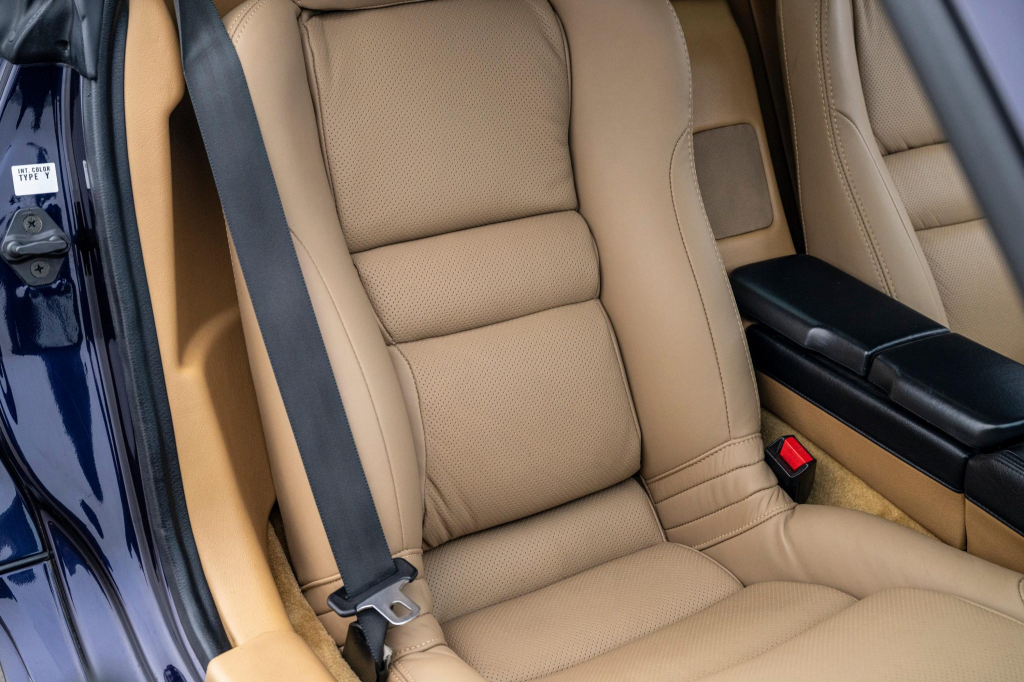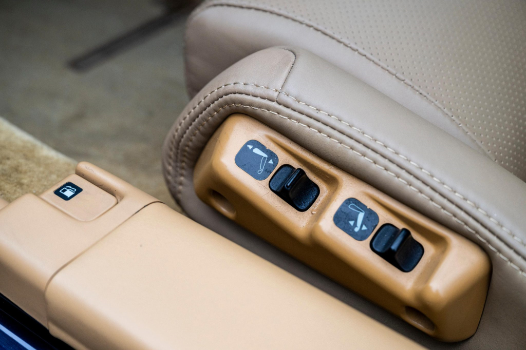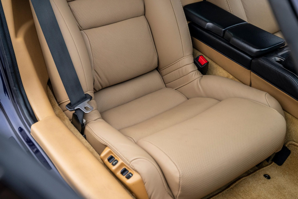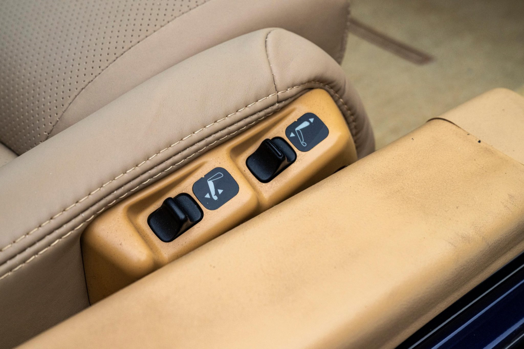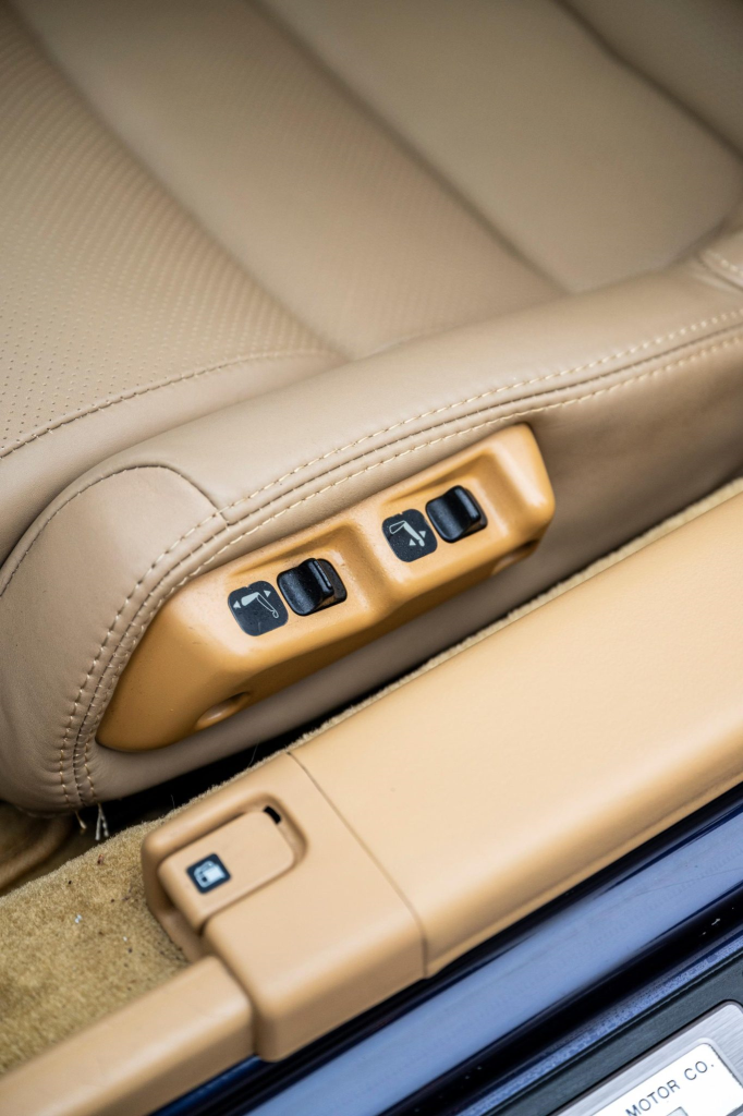 The power-adjustable sport seats are upholstered in tan leather, and interior amenities include automatic climate control, cruise control, a Bose sound system, and a cassette stereo. The stainless-steel door sill plates are stamped with the car’s serial number.