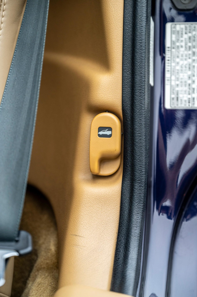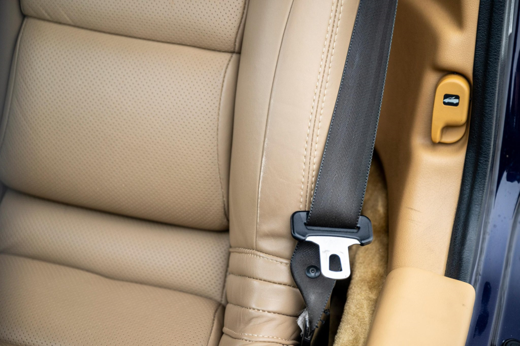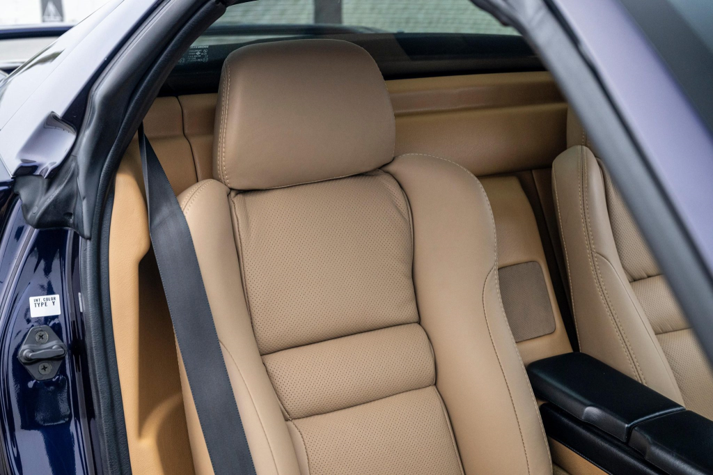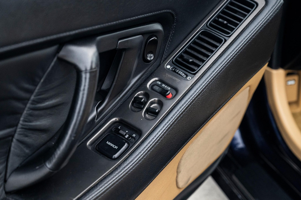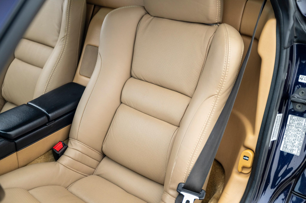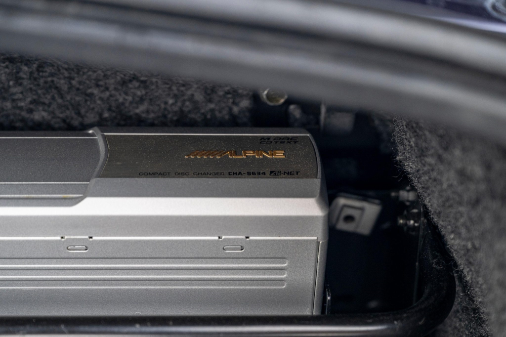 The power-adjustable sport seats are upholstered in tan leather, and interior amenities include automatic climate control, cruise control, a Bose sound system, and a cassette stereo. The stainless-steel door sill plates are stamped with the car’s serial number.