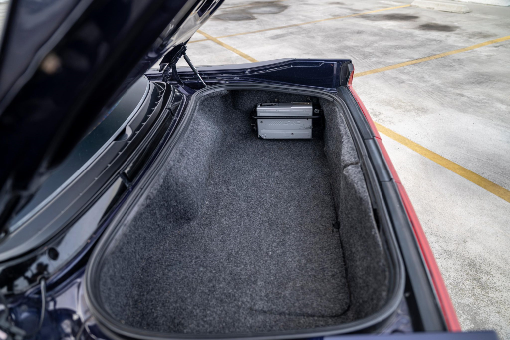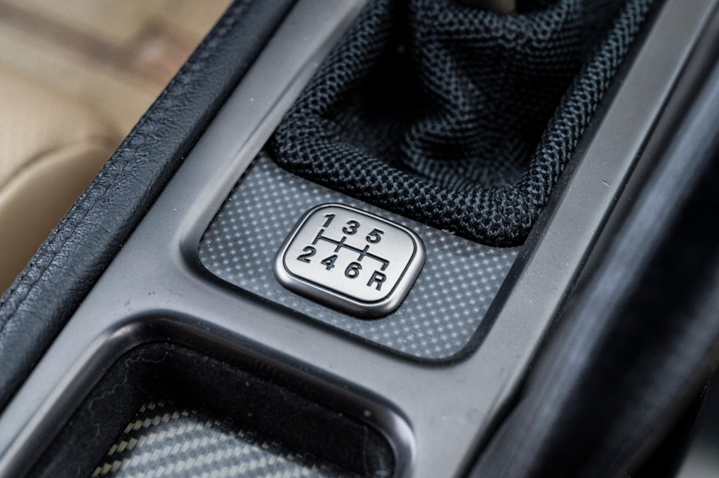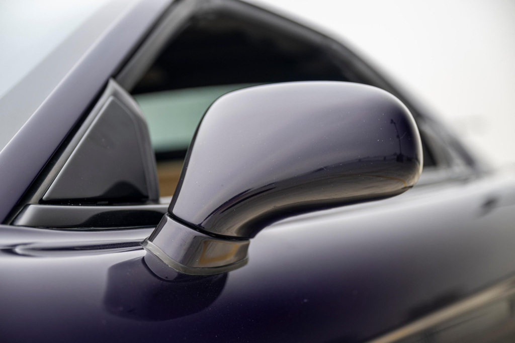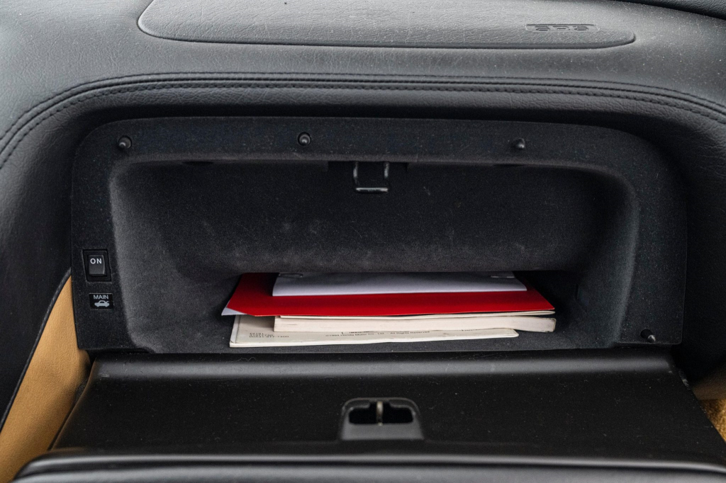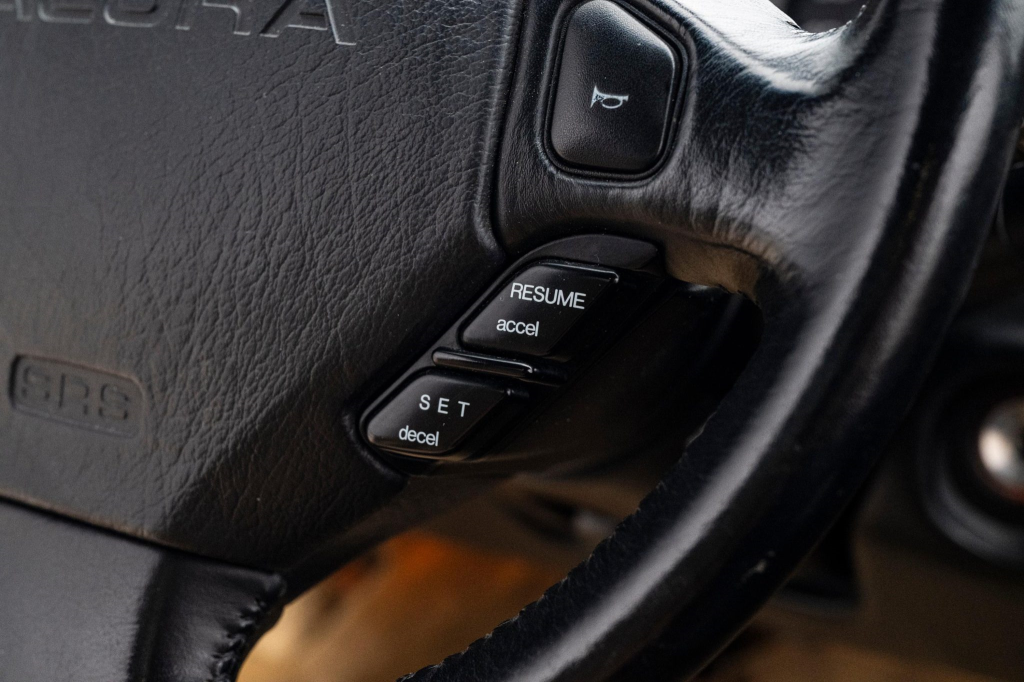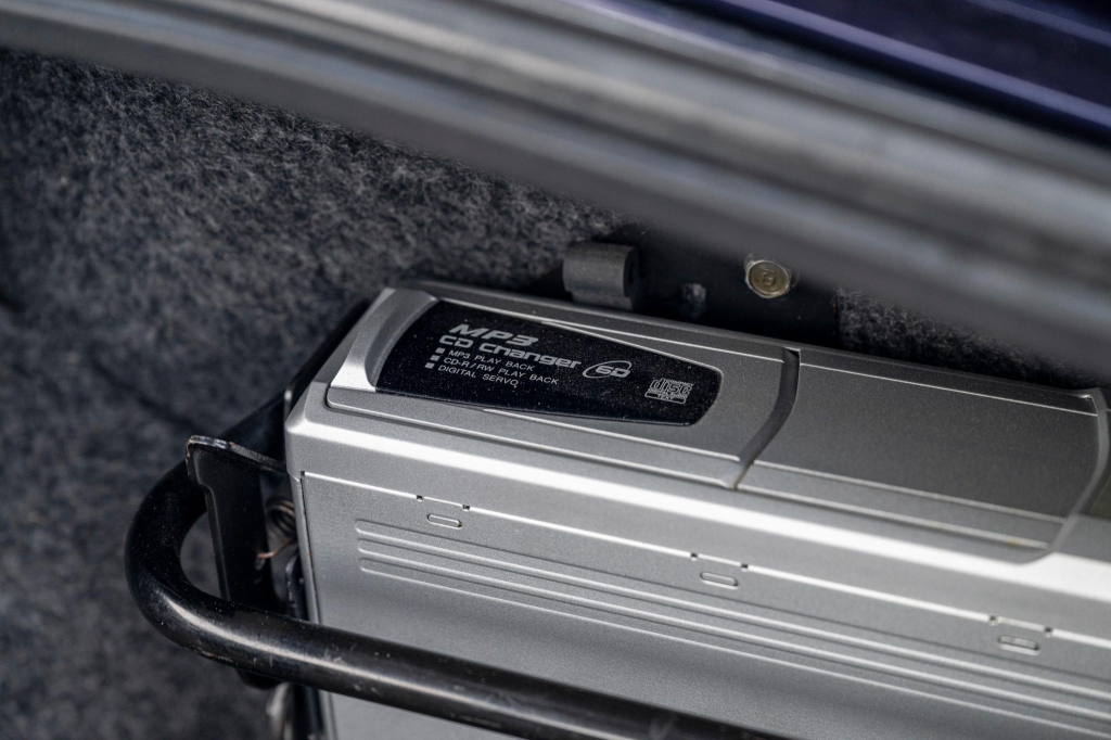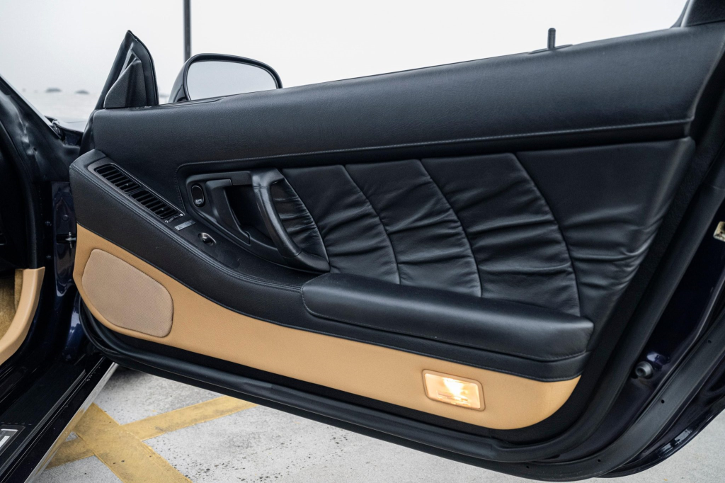 The power-adjustable sport seats are upholstered in tan leather, and interior amenities include automatic climate control, cruise control, a Bose sound system, and a cassette stereo. The stainless-steel door sill plates are stamped with the car’s serial number.