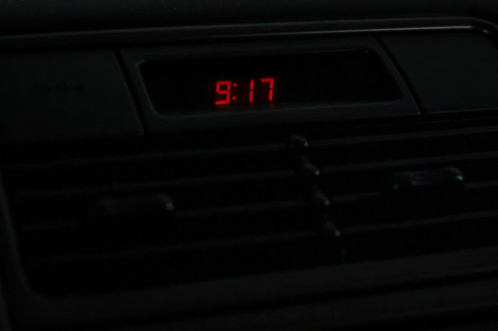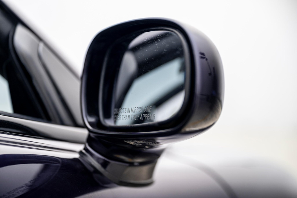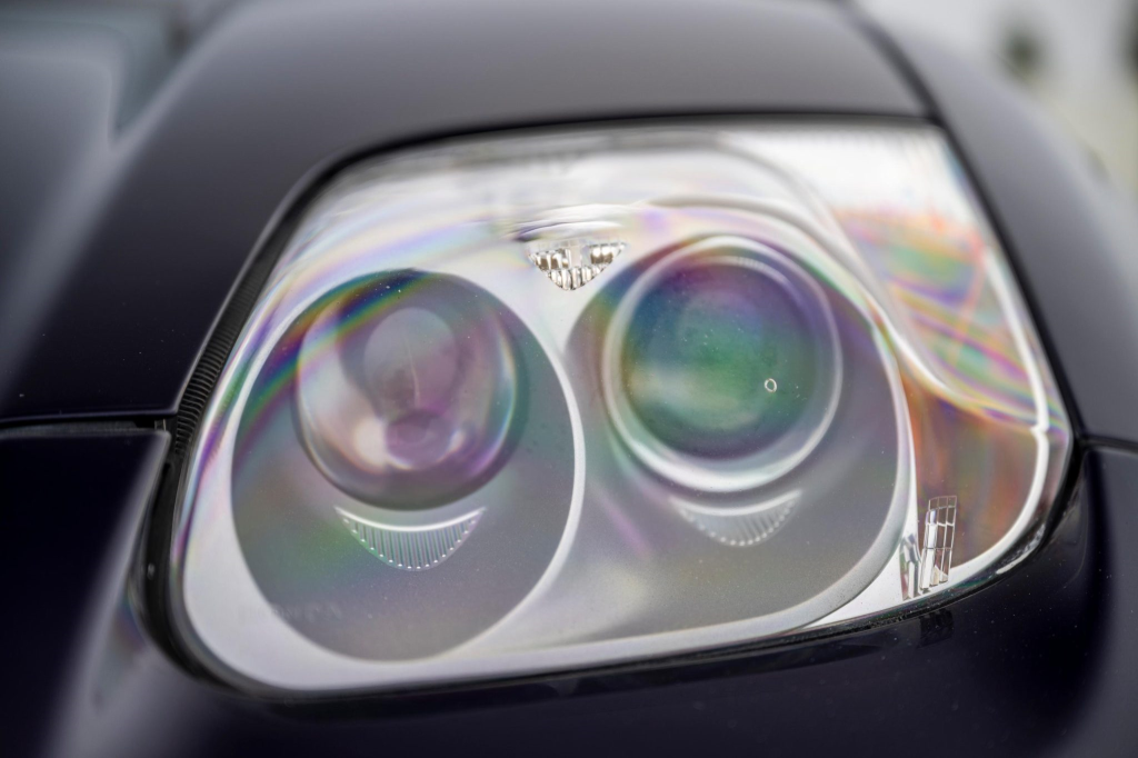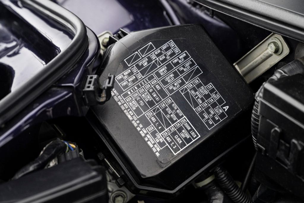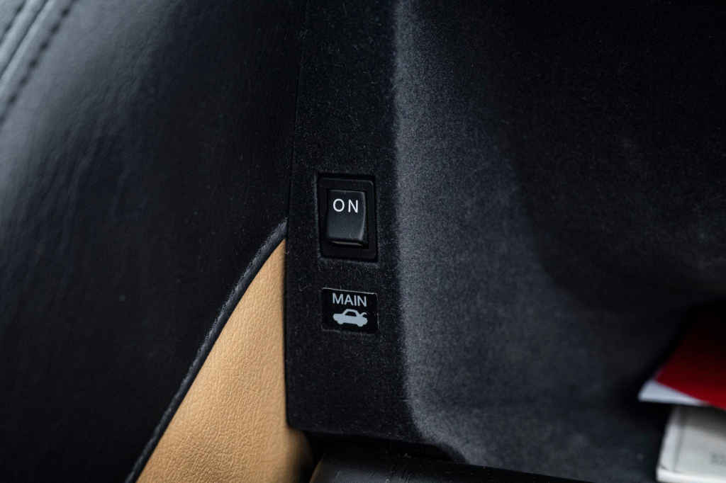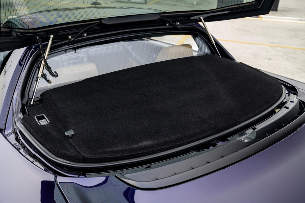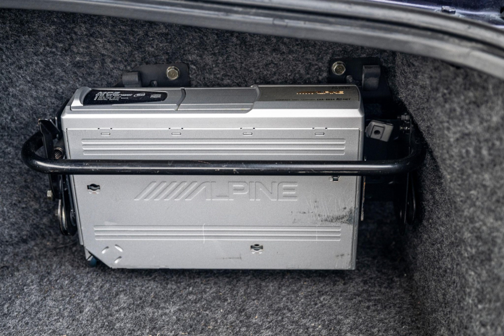 The power-adjustable sport seats are upholstered in tan leather, and interior amenities include automatic climate control, cruise control, a Bose sound system, and a cassette stereo. The stainless-steel door sill plates are stamped with the car’s serial number.