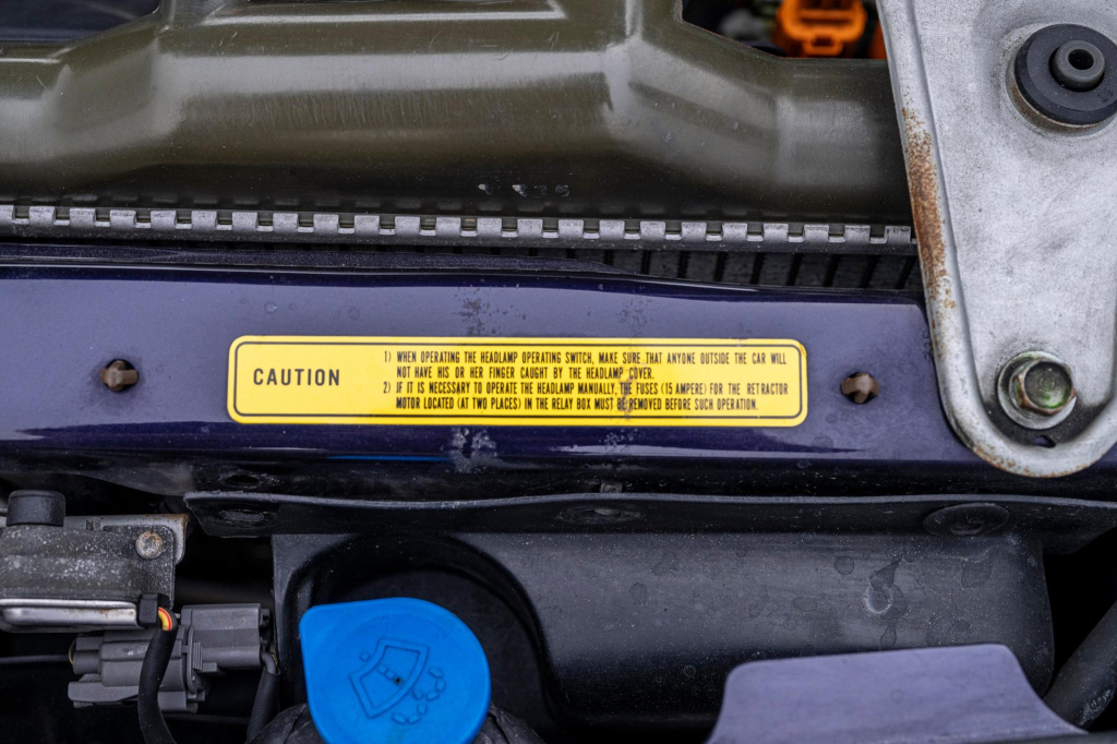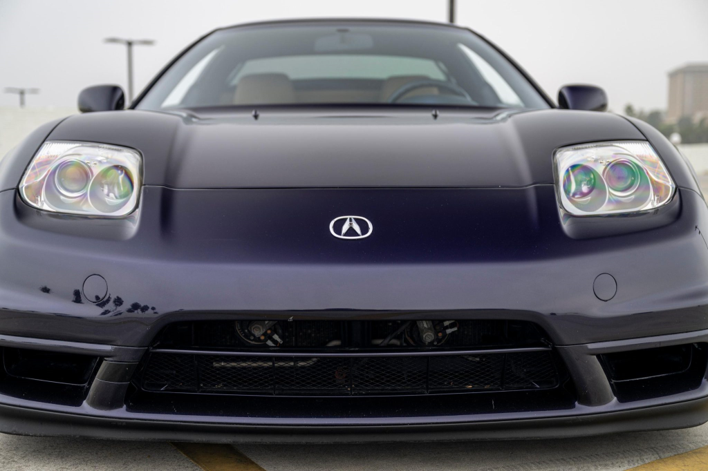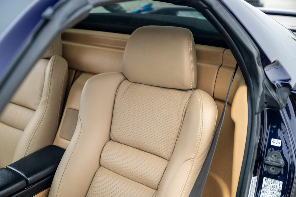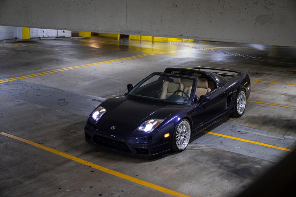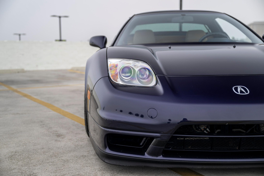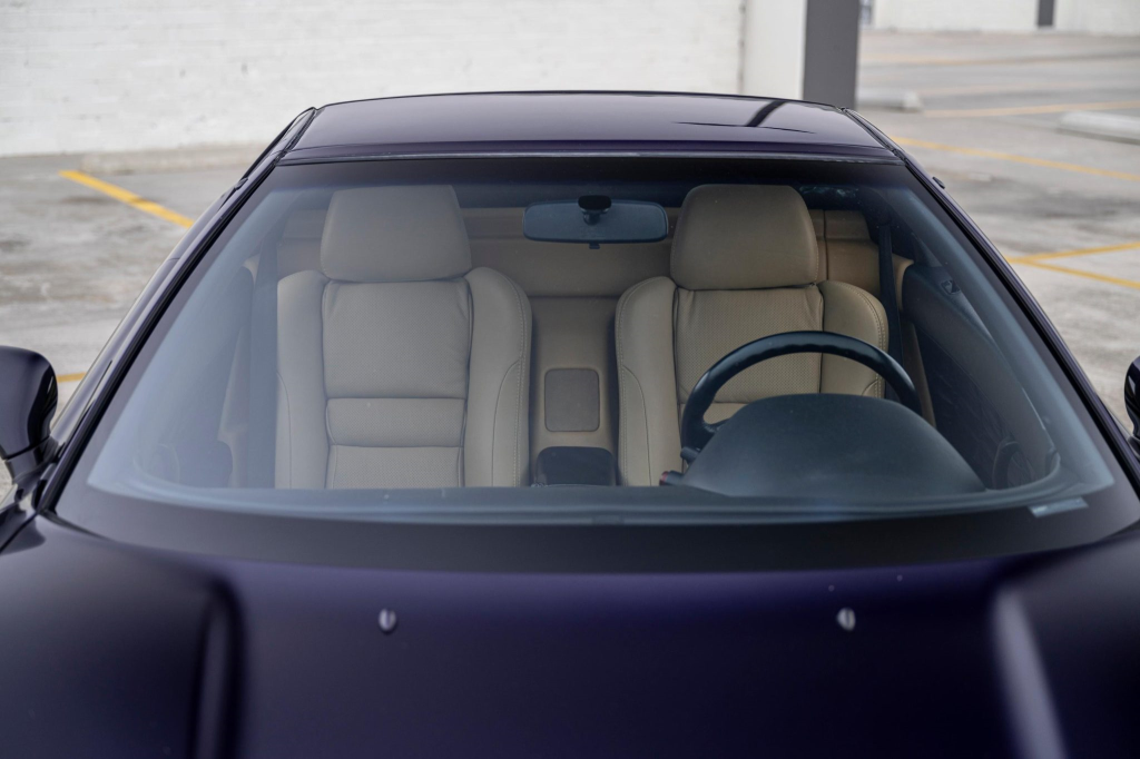 The car is one of approximately 24 US-market examples ordered in Midnight Pearl over tan leather for the model year, and it was modified under previous ownership with NA2-style bumper covers and lights. Exterior features include a removable roof panel, an integrated rear wing, side air intakes, power-adjustable side mirrors, and dual exhaust outlets. The windshield wipers have been removed, and there are scuffs on the front splitter.