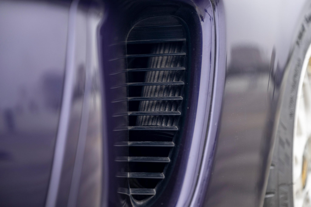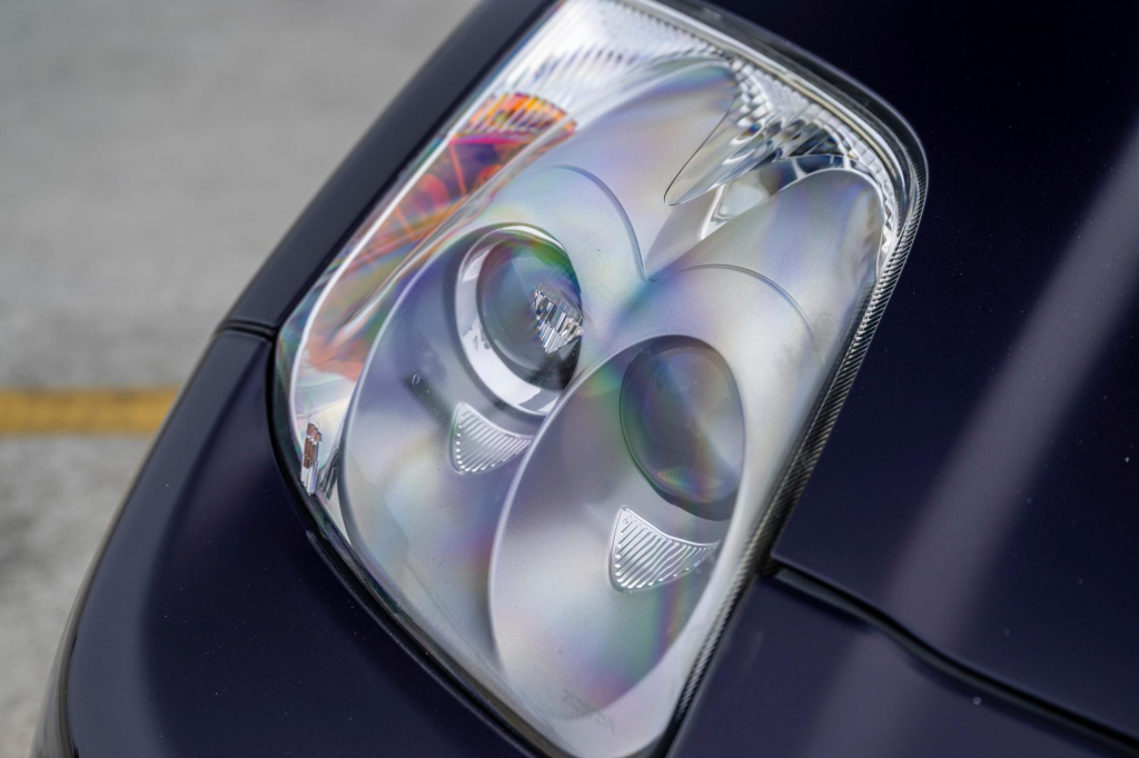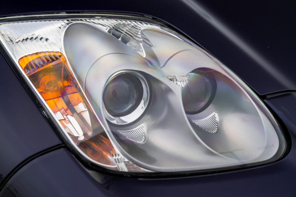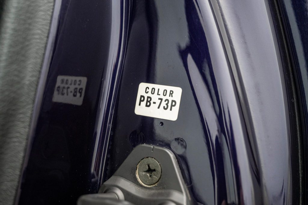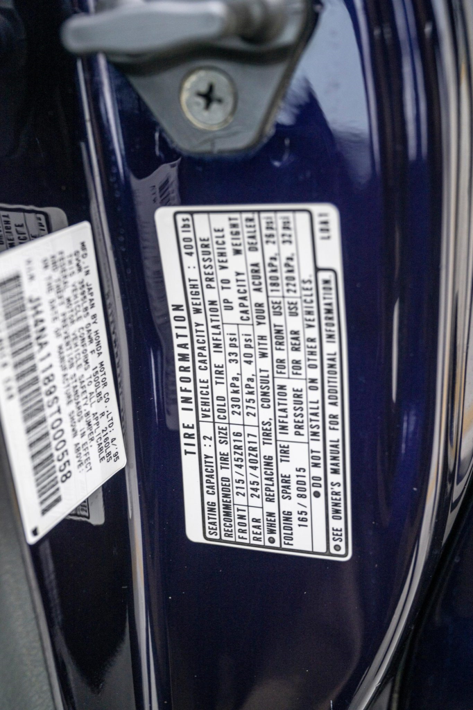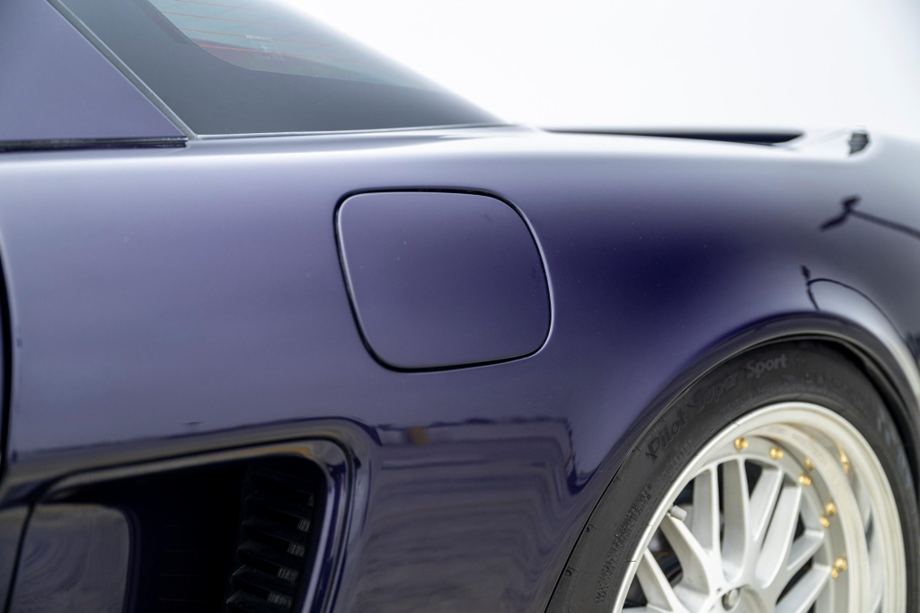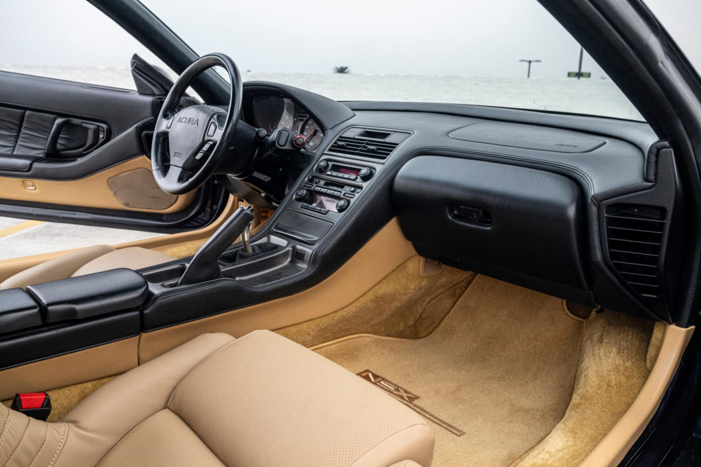 The car is one of approximately 24 US-market examples ordered in Midnight Pearl over tan leather for the model year, and it was modified under previous ownership with NA2-style bumper covers and lights. Exterior features include a removable roof panel, an integrated rear wing, side air intakes, power-adjustable side mirrors, and dual exhaust outlets. The windshield wipers have been removed, and there are scuffs on the front splitter.