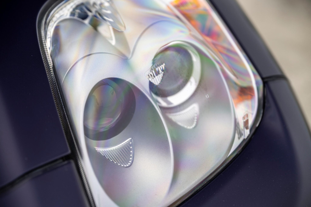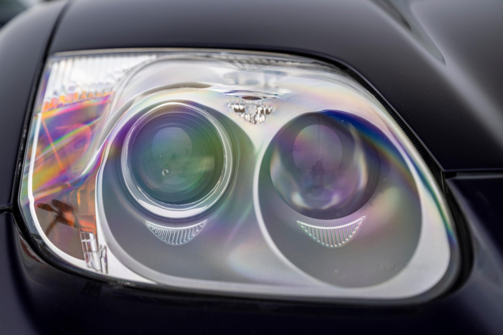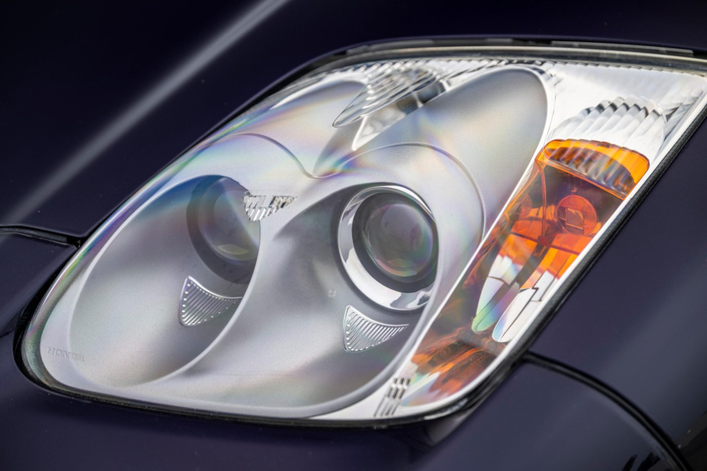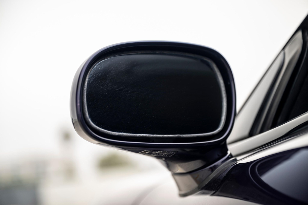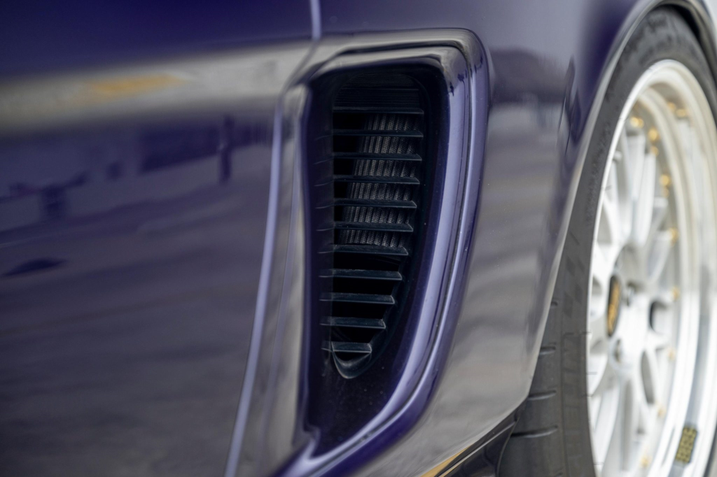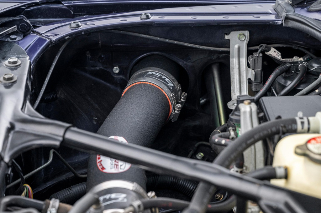 The car is one of approximately 24 US-market examples ordered in Midnight Pearl over tan leather for the model year, and it was modified under previous ownership with NA2-style bumper covers and lights. Exterior features include a removable roof panel, an integrated rear wing, side air intakes, power-adjustable side mirrors, and dual exhaust outlets. The windshield wipers have been removed, and there are scuffs on the front splitter.